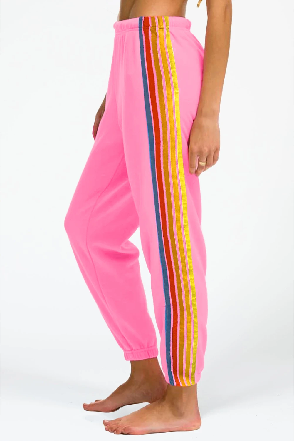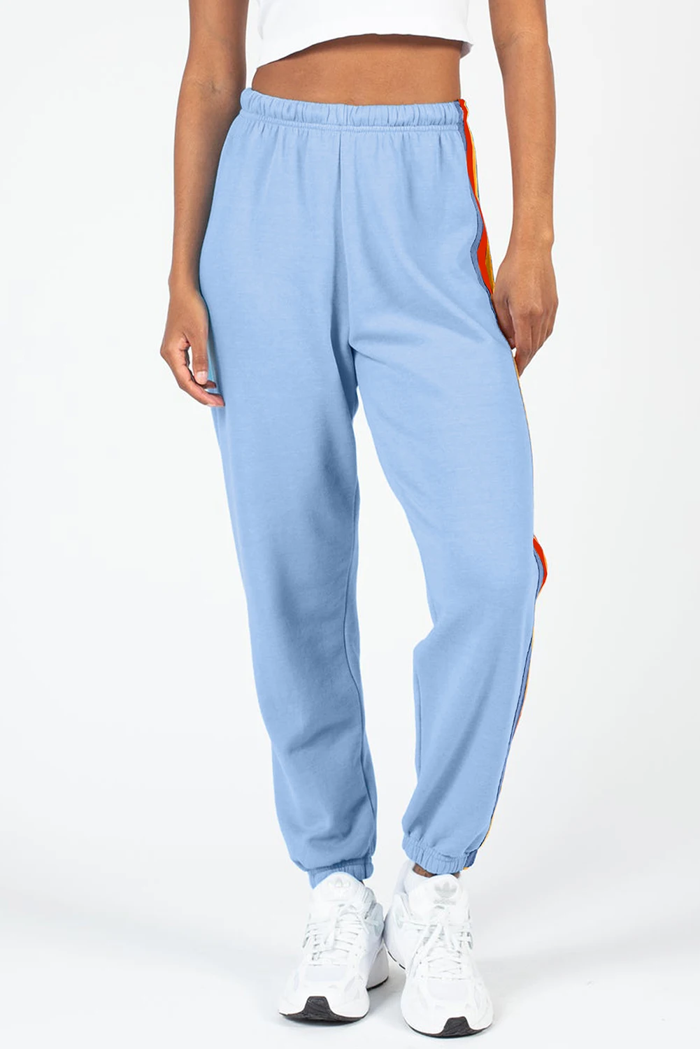 Shewin 2026 Women's Casual Striped Sweatpants High Waist Breathable Elastic Grey Pink Valentine Day Counting Rainbows Flat