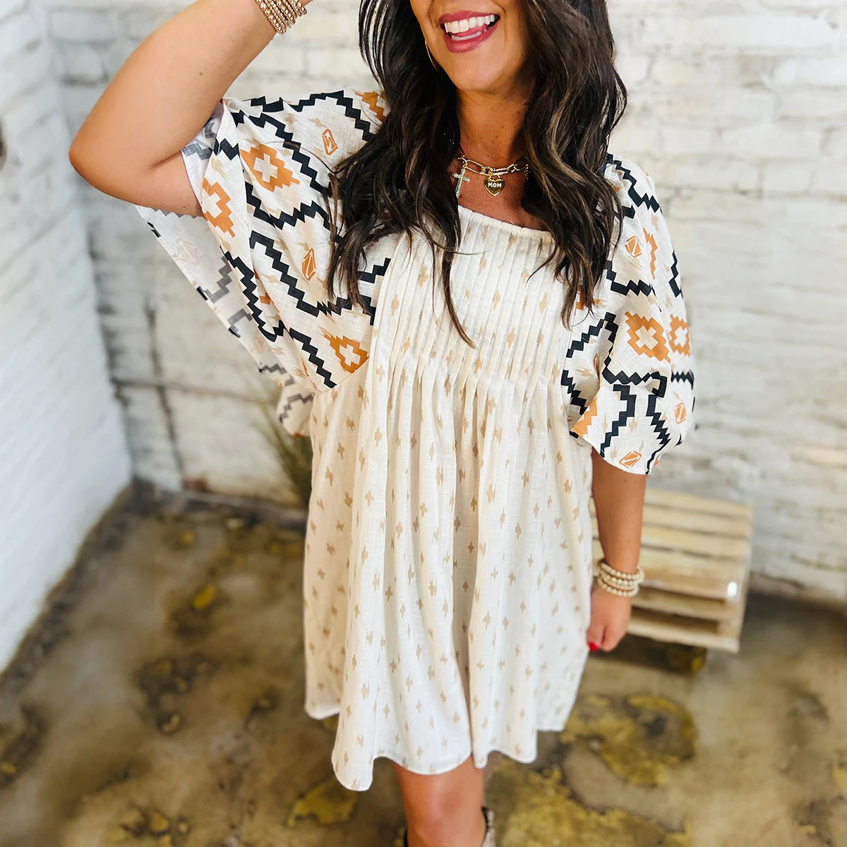 2026 Shewin Boutique Beige Western Aztec Print Pleated Mini Dress Cute Square Neck Loose Fit with Natural Waistline