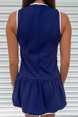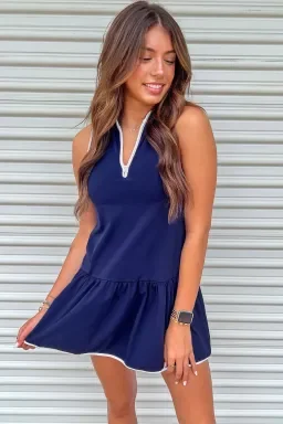 2026 Shewin Boutique Women's Dark Blue Athletic Sleeveless Mini Dress Contrast Trim Quarter Zip Casual Party Modest Cute Styles