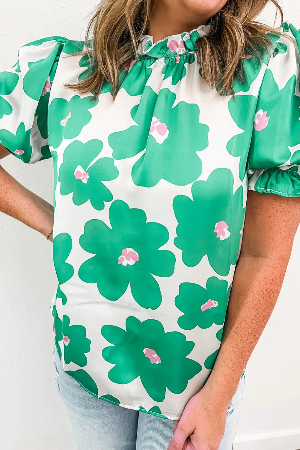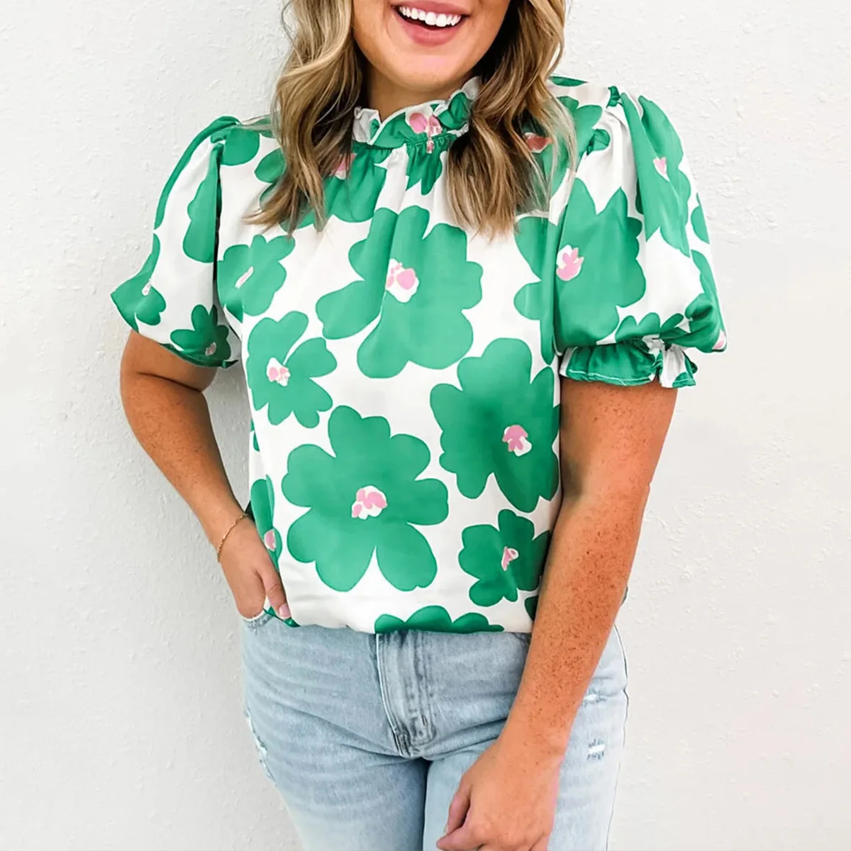 2026 Shewin Boutique's Summer Casual Floral Blouse for Women Rose Red Green Knitted Fabric Puff Sleeve Frill Neckline Wholesale