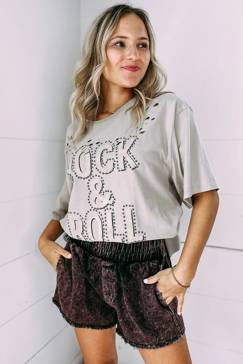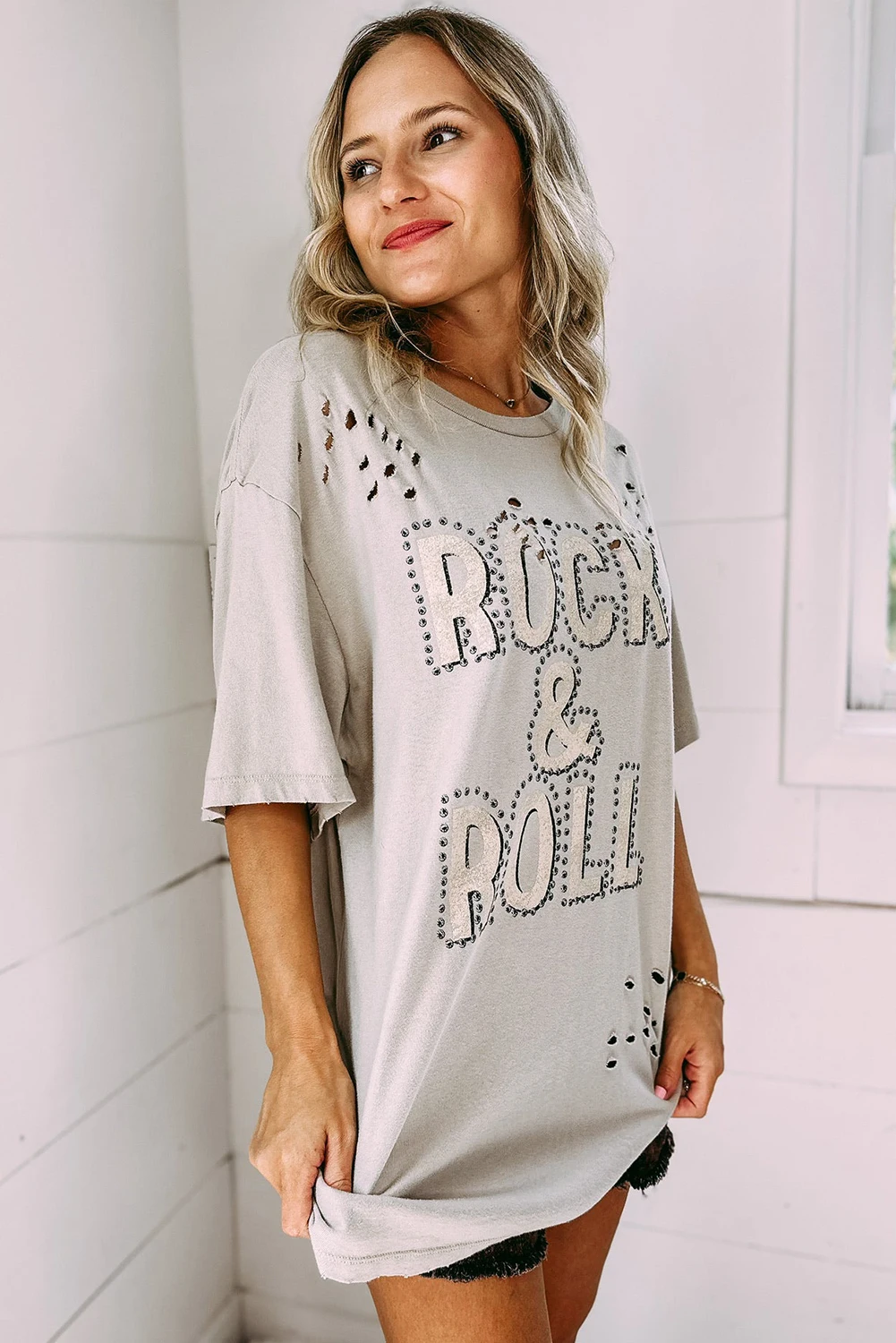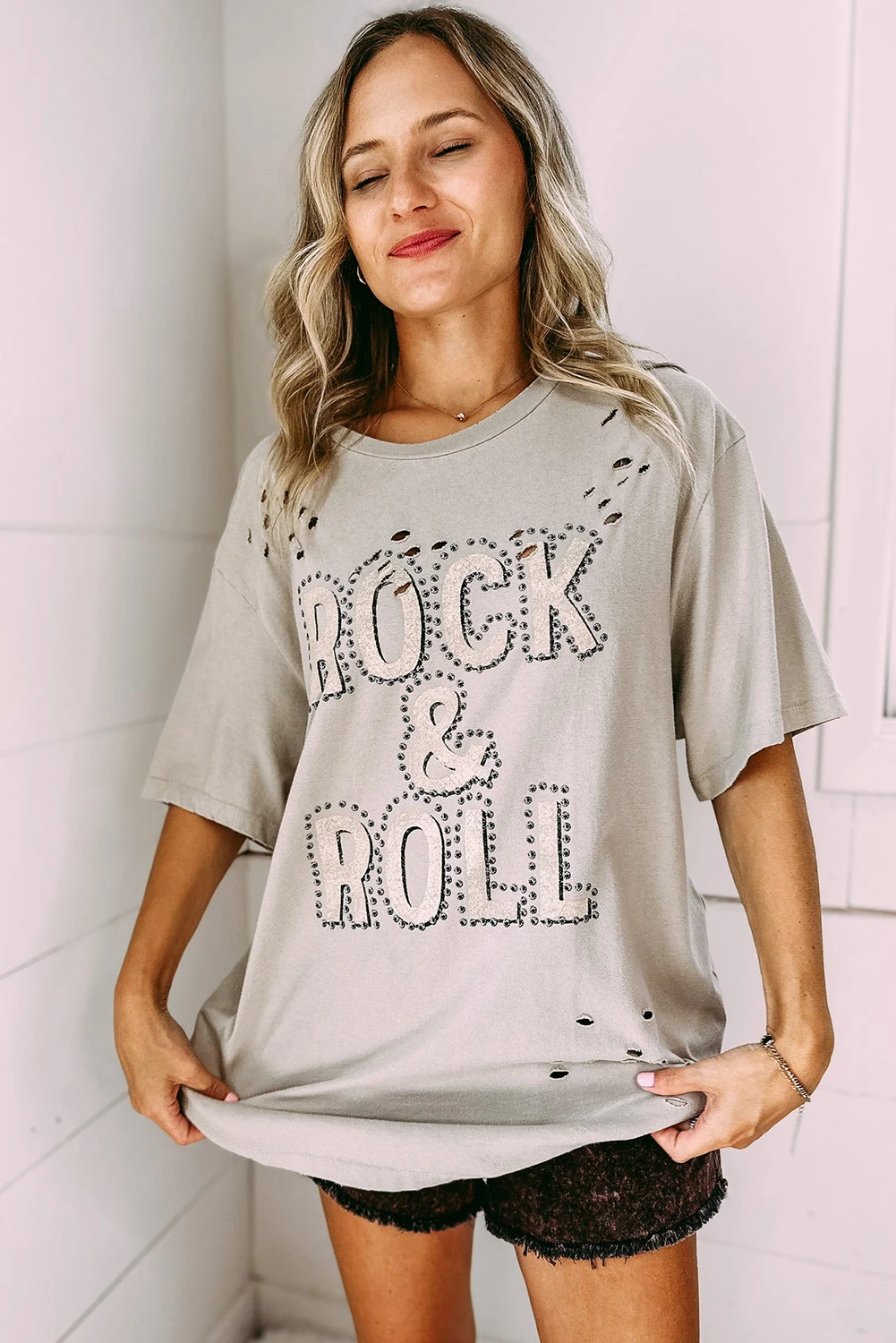 2026 Shewin Boutique's Summer Casual Rock & Roll Graphic Distressed Oversized Knitted Tee for Women Breathable Wholesale in Gray