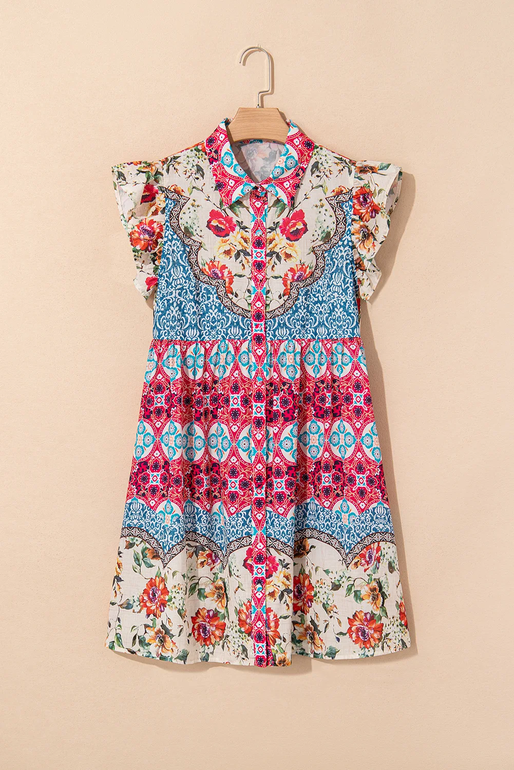 Shewin 2026 Boho Rose Floral Ethnic Print Ruffle Dropped Waist Loose Fit 100% Polyester Mini Dress Plain Dyed