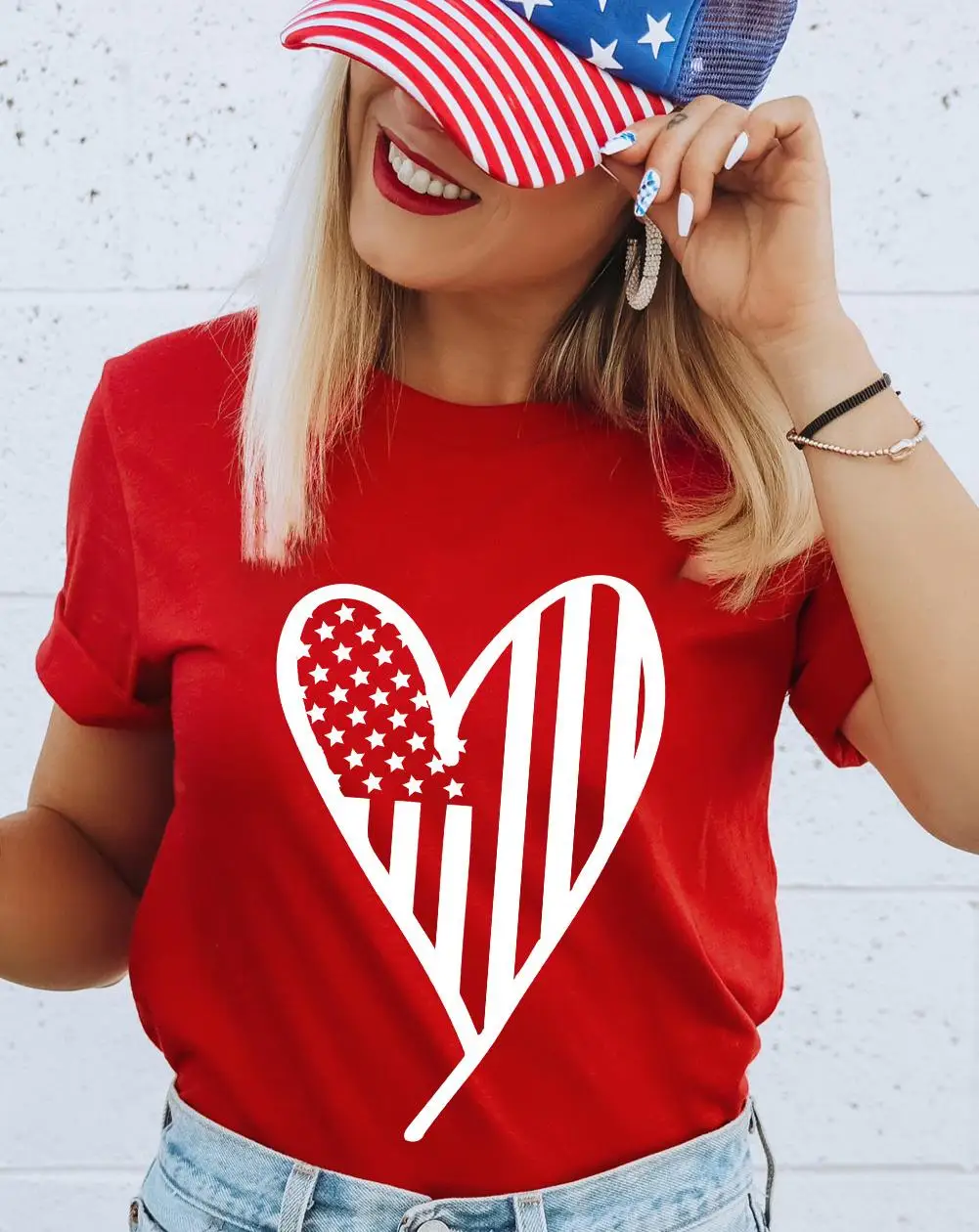 Shewin Women's 2026 Red USA Flag Graphic T-Shirt Casual Summer Short Crewneck Polyester Knitted Oversized Plus XL Heart Shape