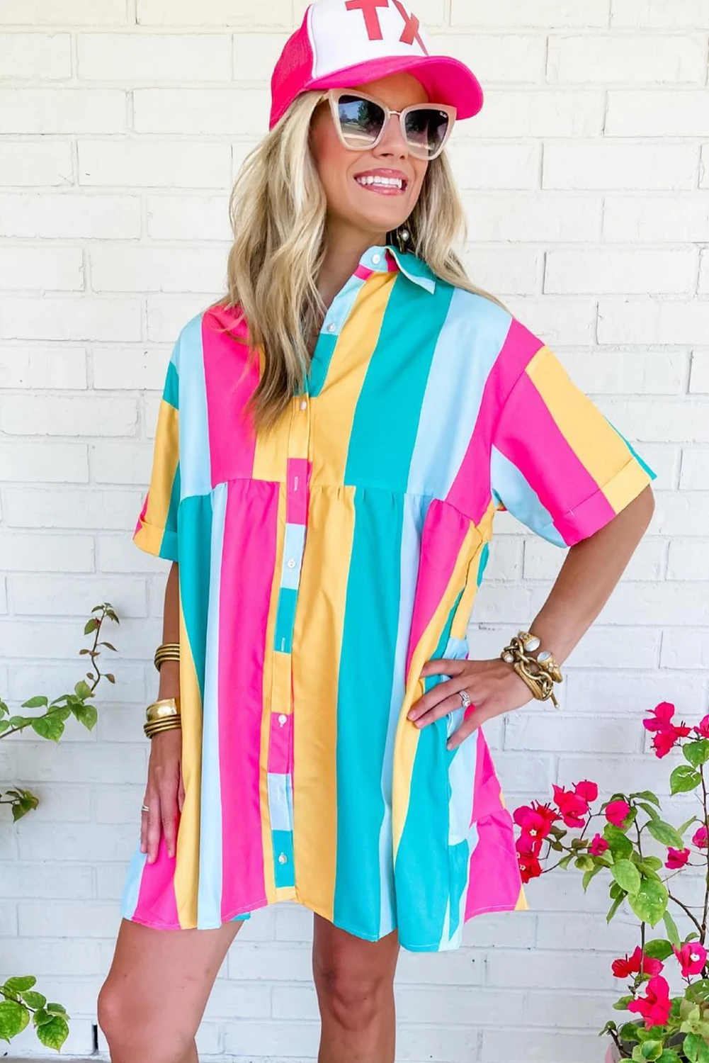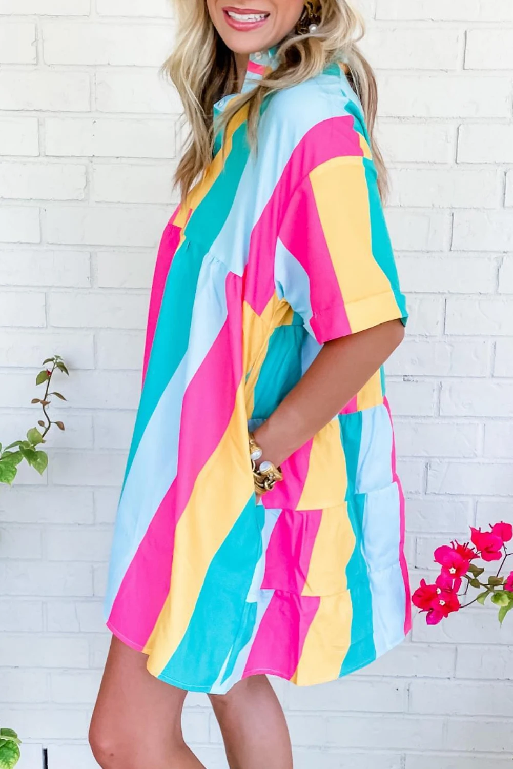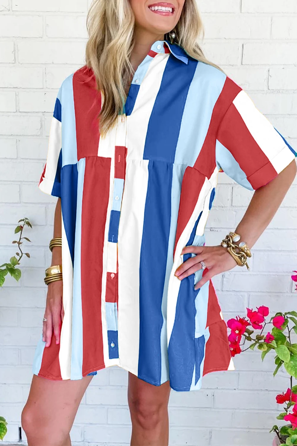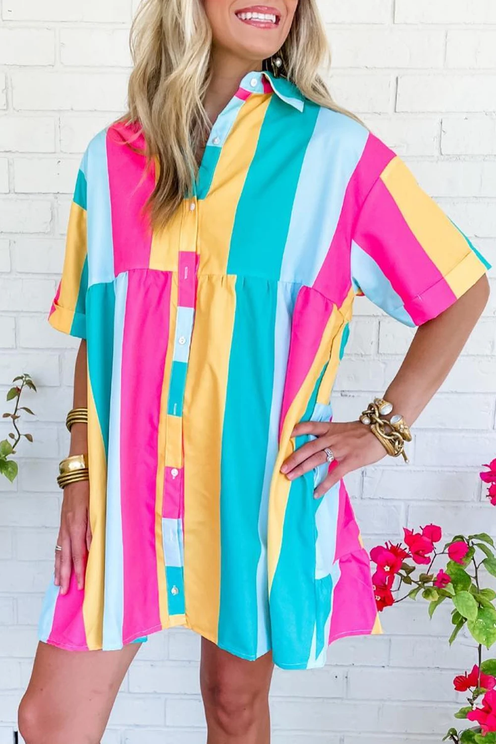 2026 Shewin Boutique Women Clothing Wholesale Lady Rose Stripe Colorblock Button Short Sleeve Breathable Mini Shirt Dress