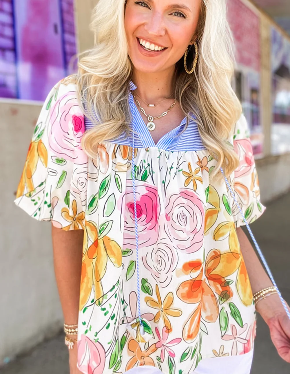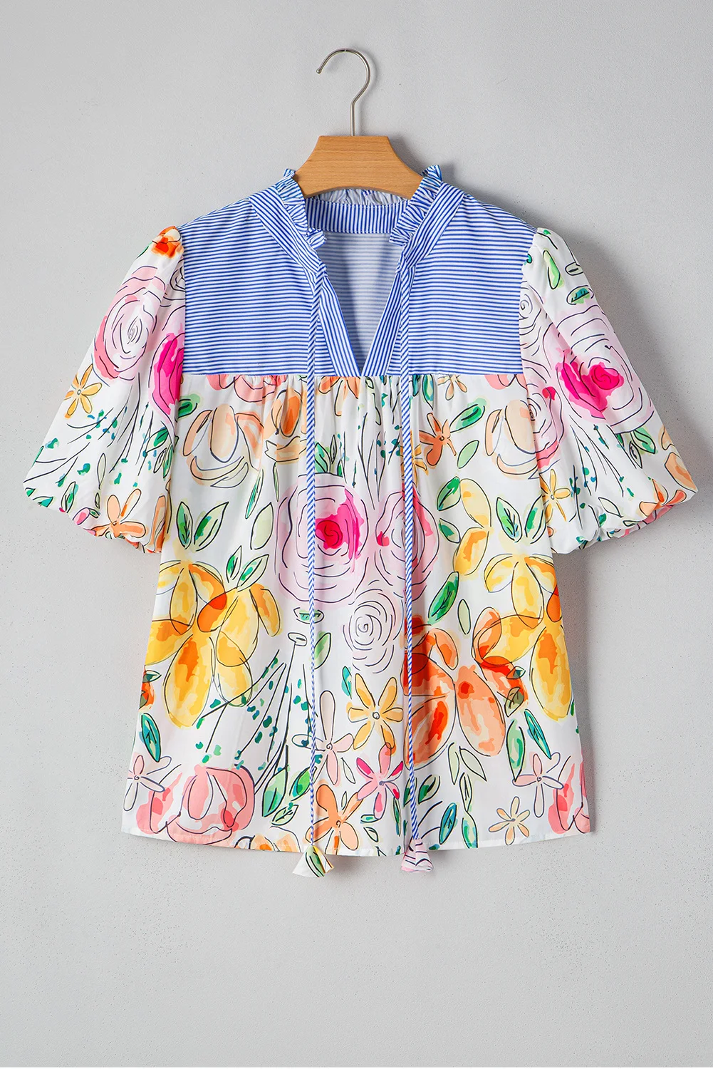 Shewin 2026 Summer Spring Floral Tops for Women Ladies' Casual V Neck Puff Short Sleeve Wholesale Boutique Front Knitted