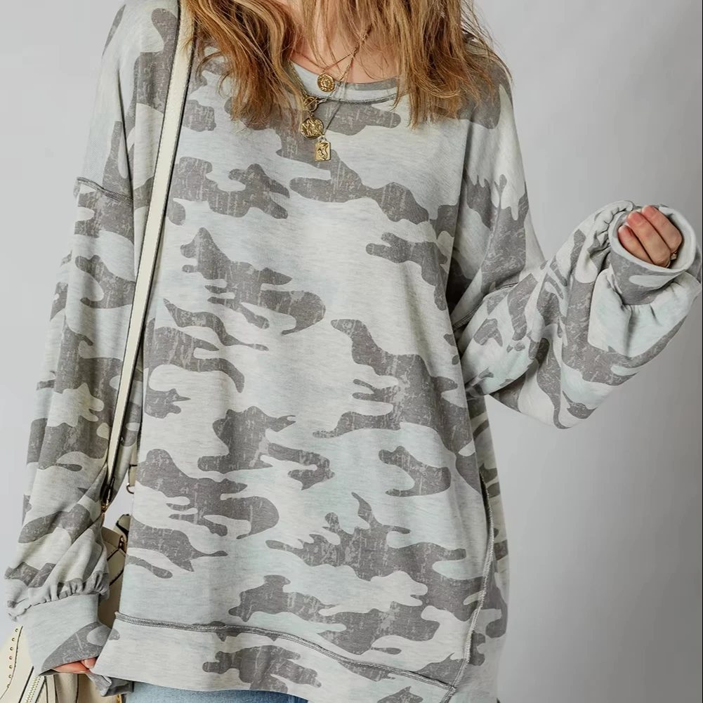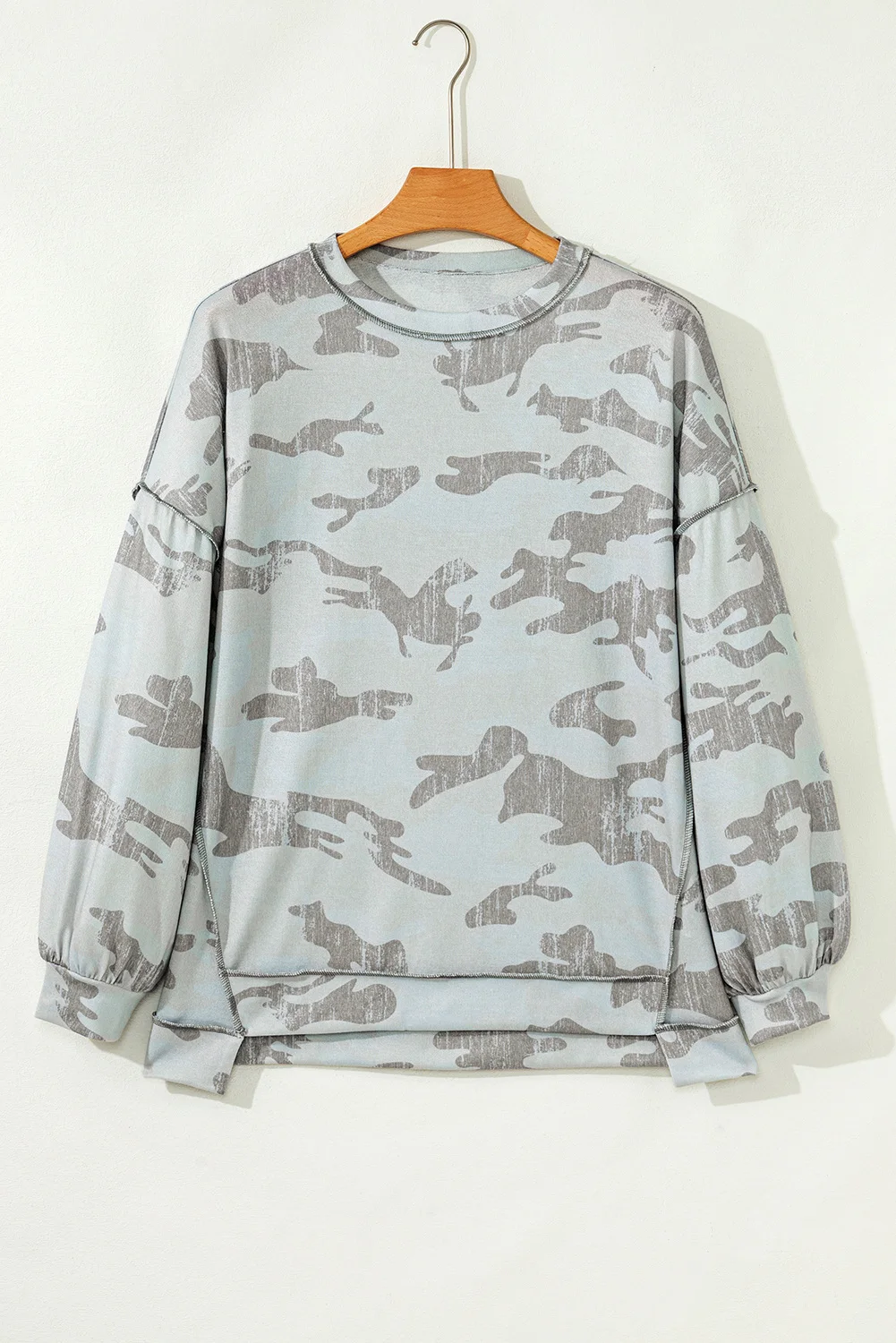 Shewin Women's Clothing 2026 Camo Crewneck Sweatshirt Retro Camouflage Print Exposed Seam Patchwork Drop Shoulder for Women