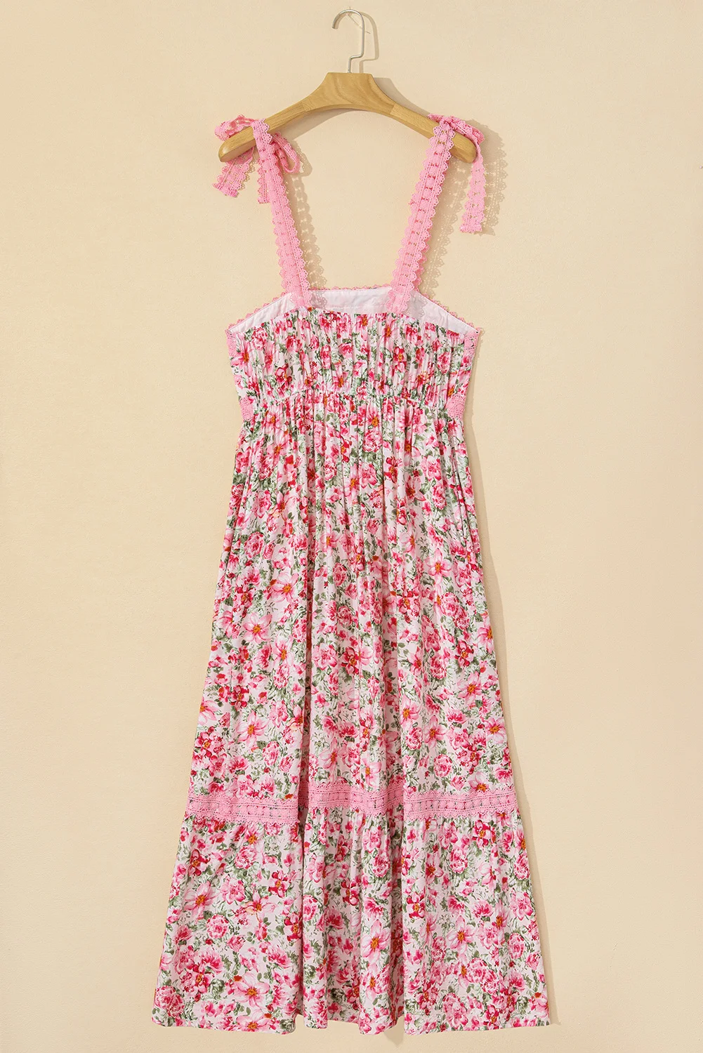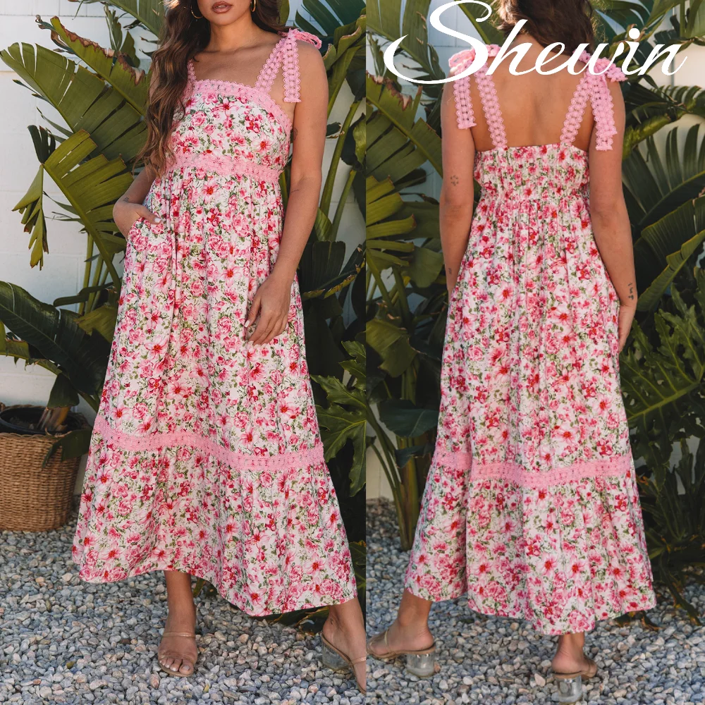 Shewin Clothing 2026 Chic Pink Floral Lace Maxi Dress for Women Empire Waist Tied Strap Design Breathable for Beach Parties