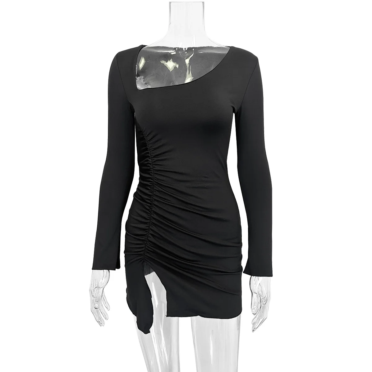 Autumn Fashion Women's Slanted Collar Long Sleeve Dress with Sexy Slit Pleated Hip Hugging Short Skirt Nonwoven Weaving Method
