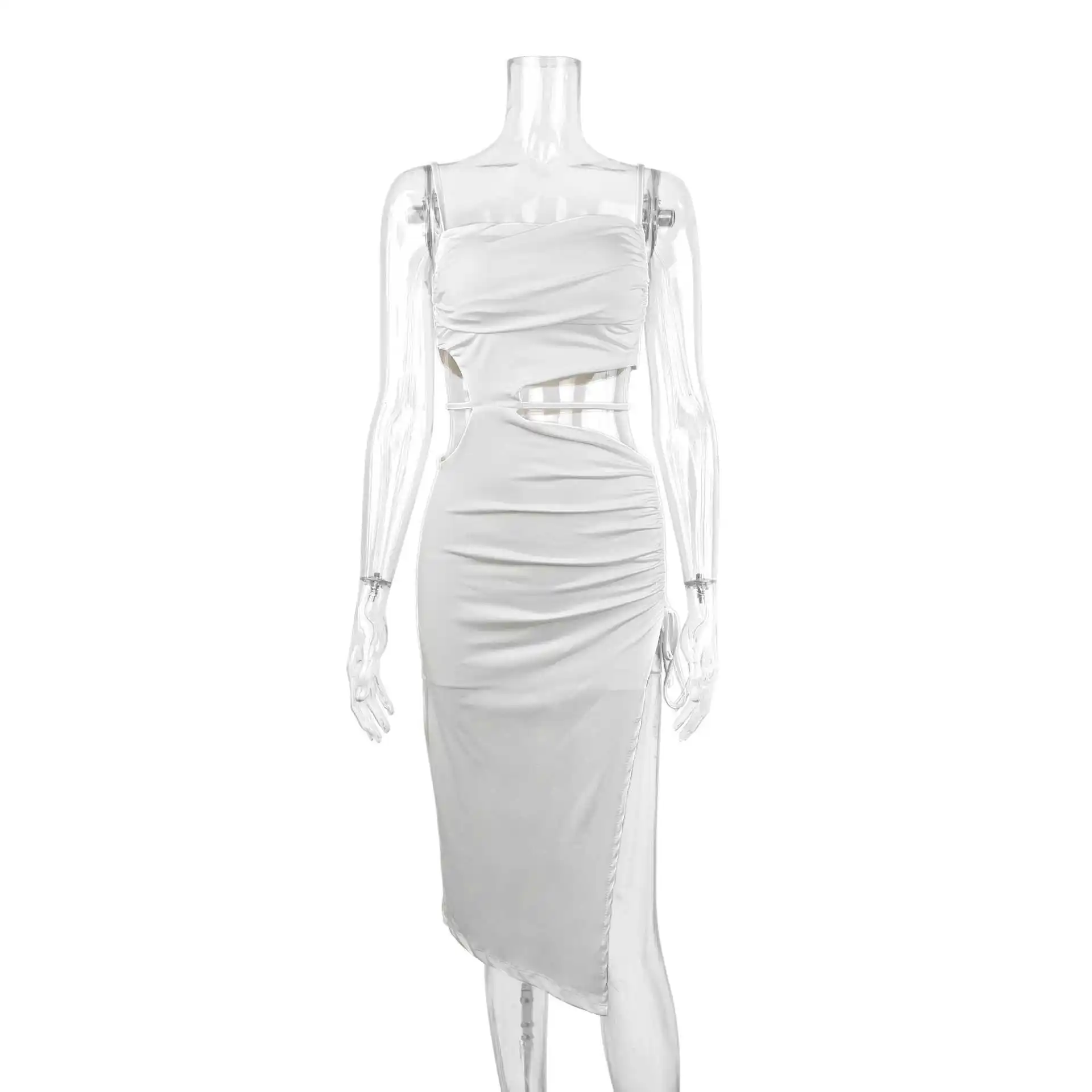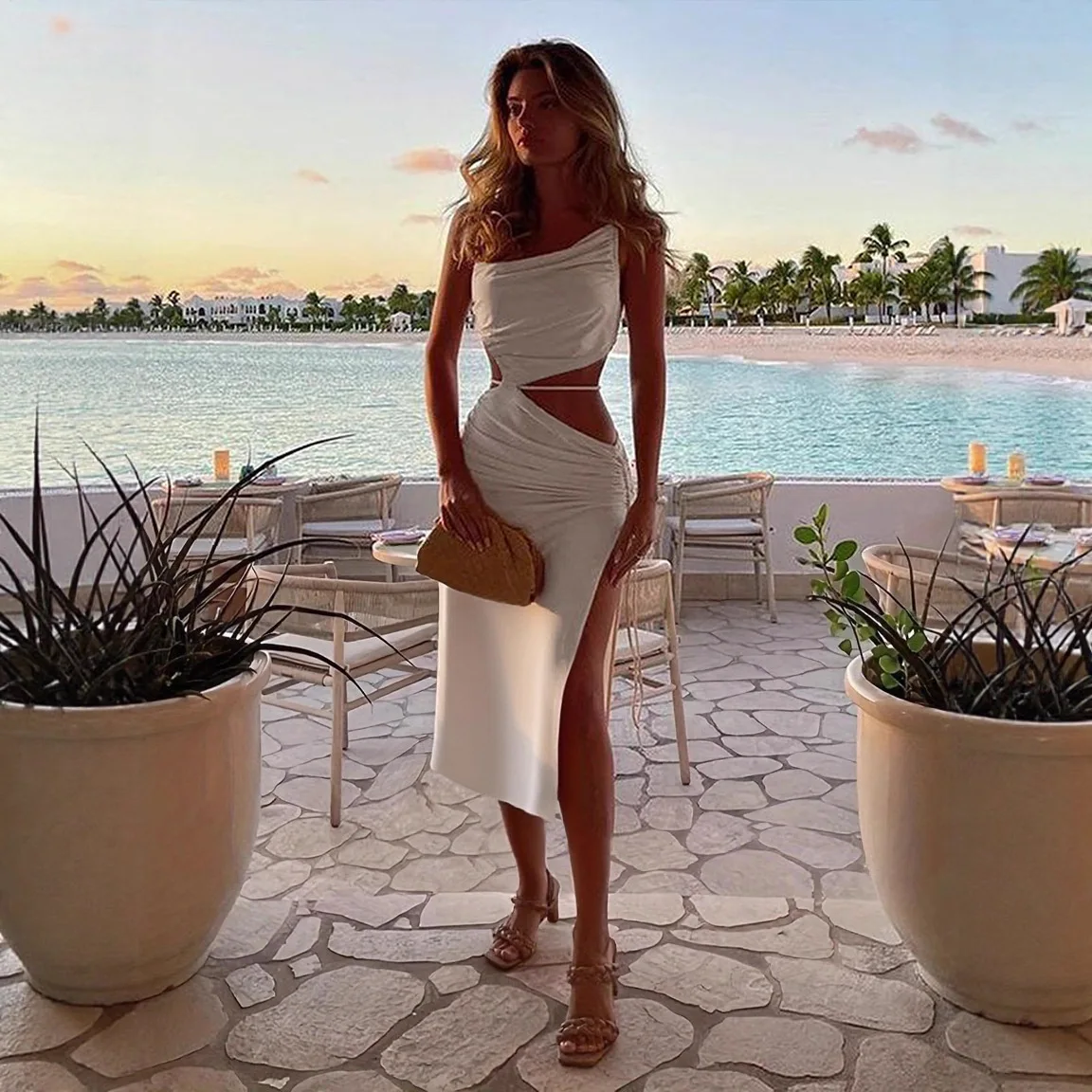 Fashion Sexy Summer Women's Sexy Pleated Oblique Shoulder Hollowed-up Halter Irregular Split Dress Wholesale