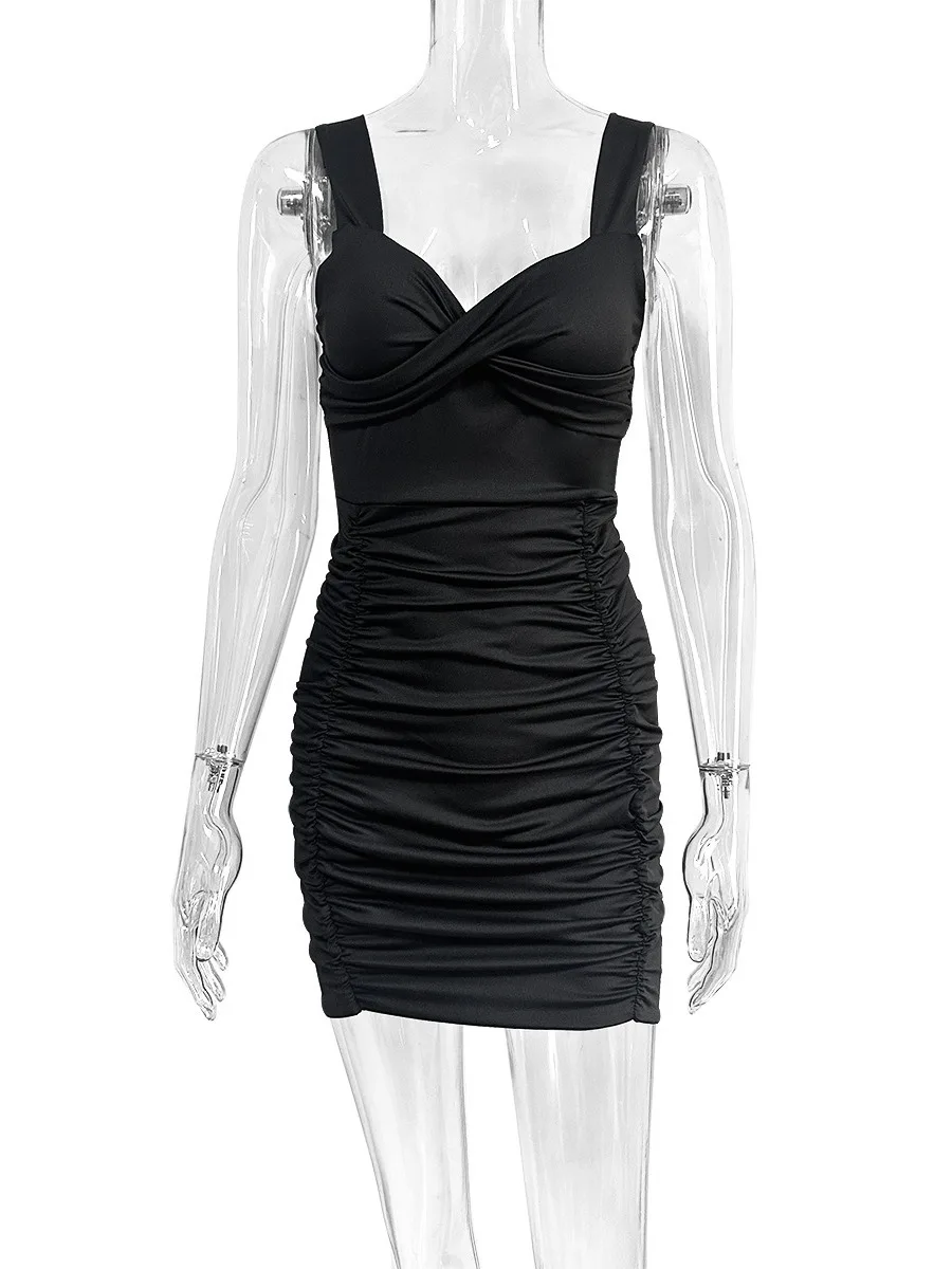 2026 Black New Style Pleated Tight Hip Hug Slim Dress Deep V Neck Elegant Backless Short Skirt Elastic Women Casual Dress