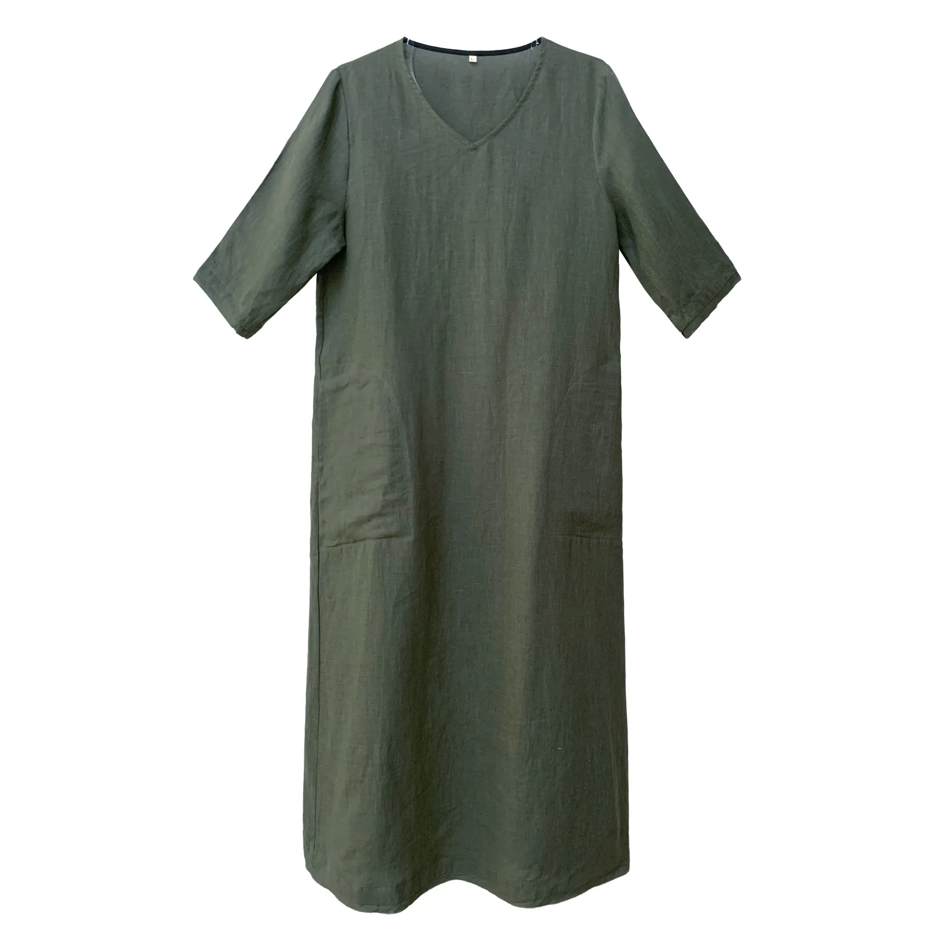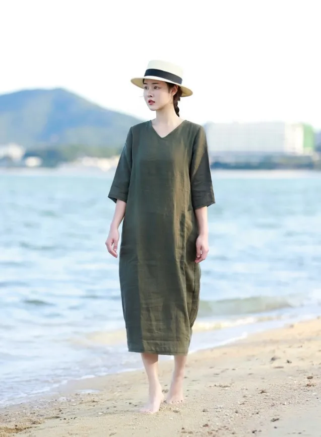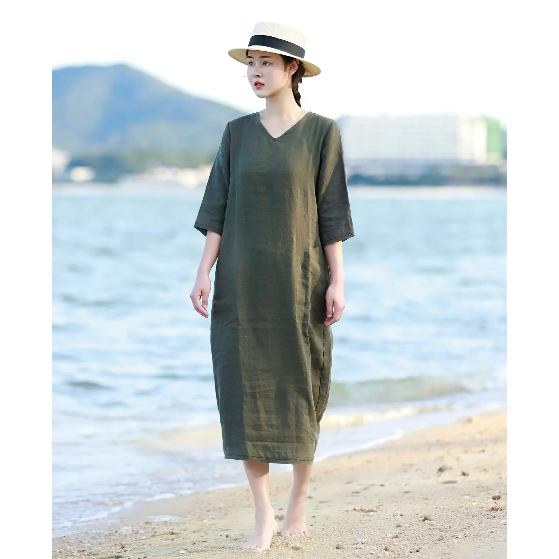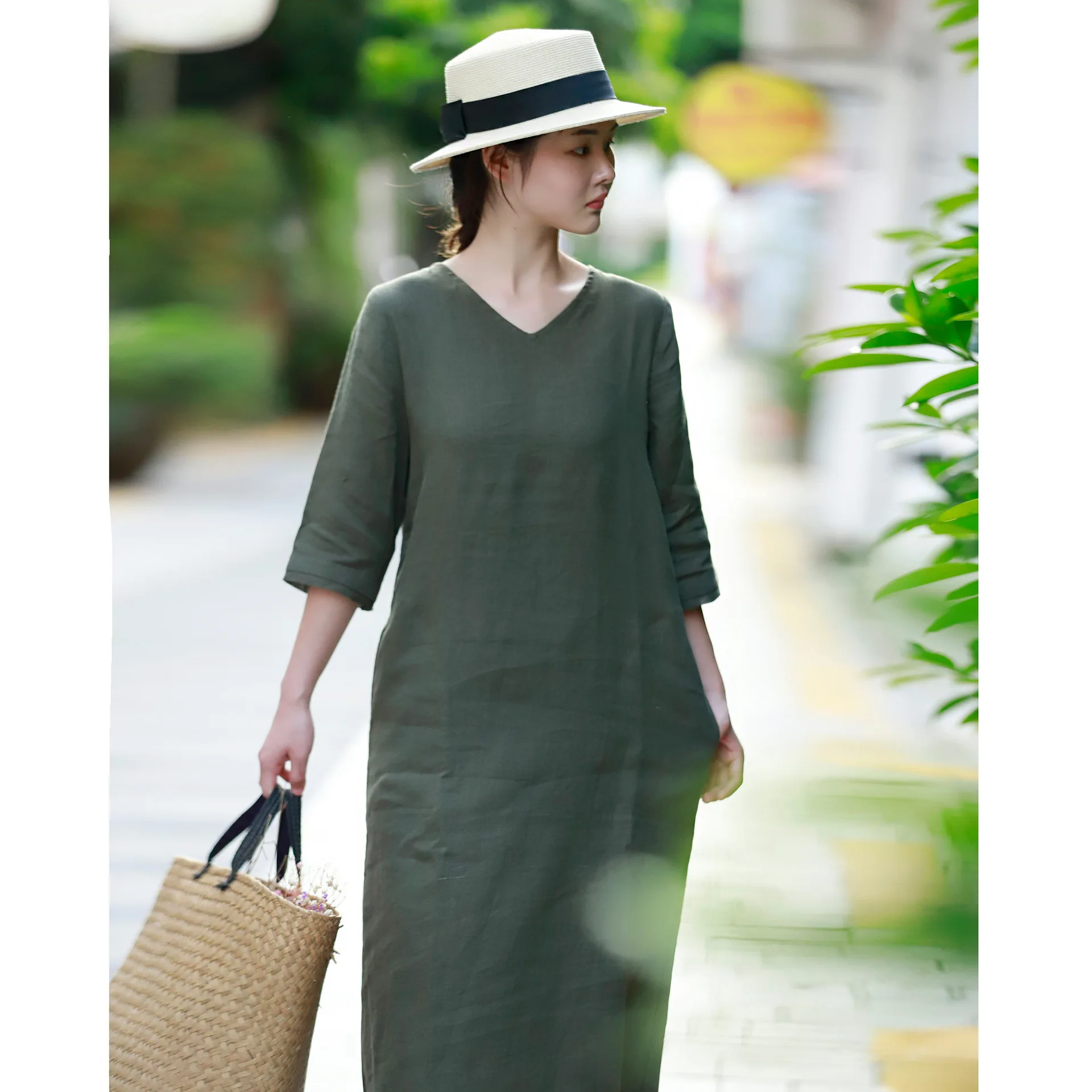 Original cotton and linen women's summer new style high-density woven linen loose age-reducing mid-length dress women