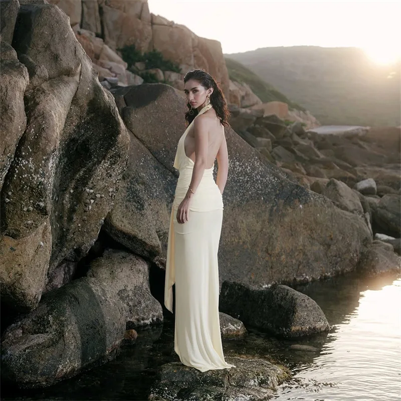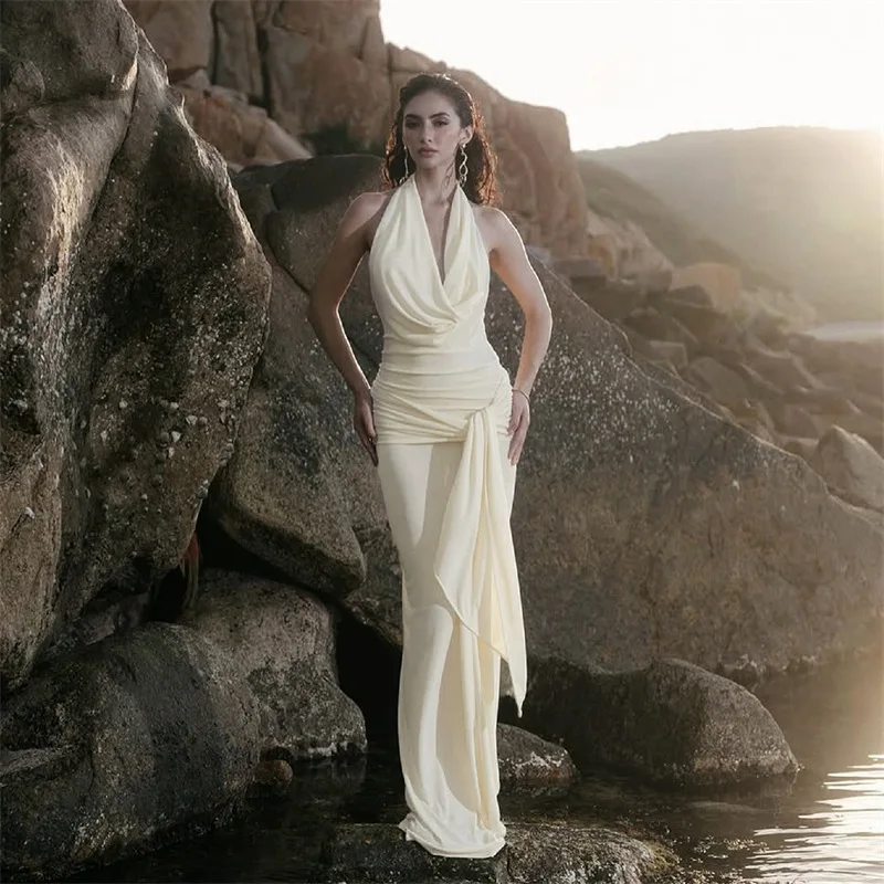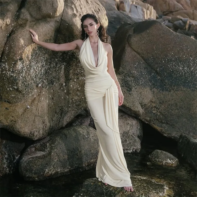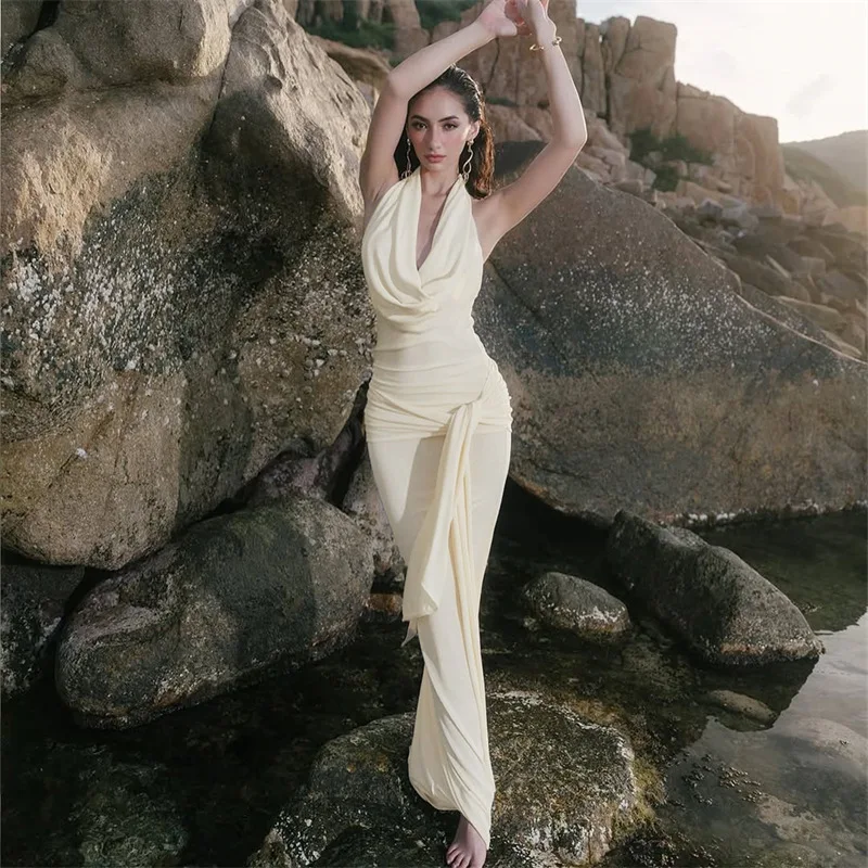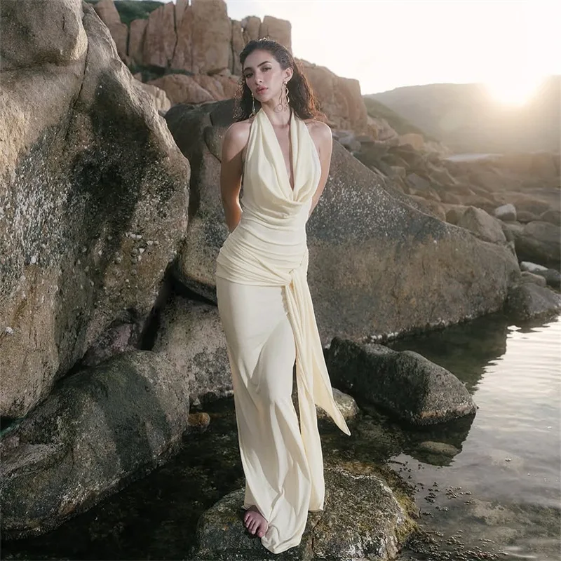 Hot-Selling New Fashionable Elegant Sexy V-neck Sleeveless Regular Solid Chiffon Casual Summer Floor-Length Natural Woven Front