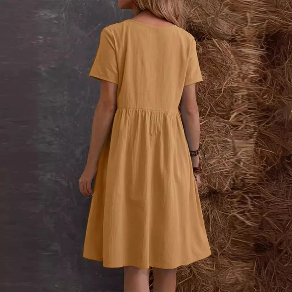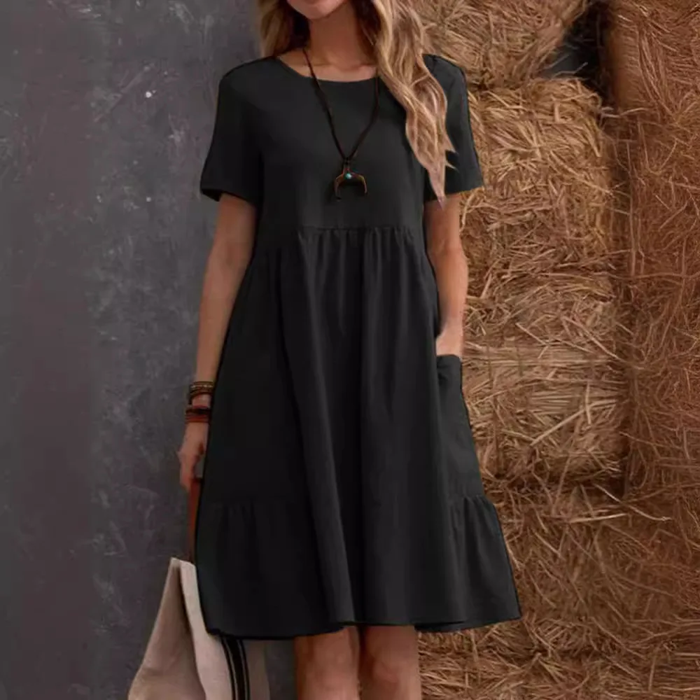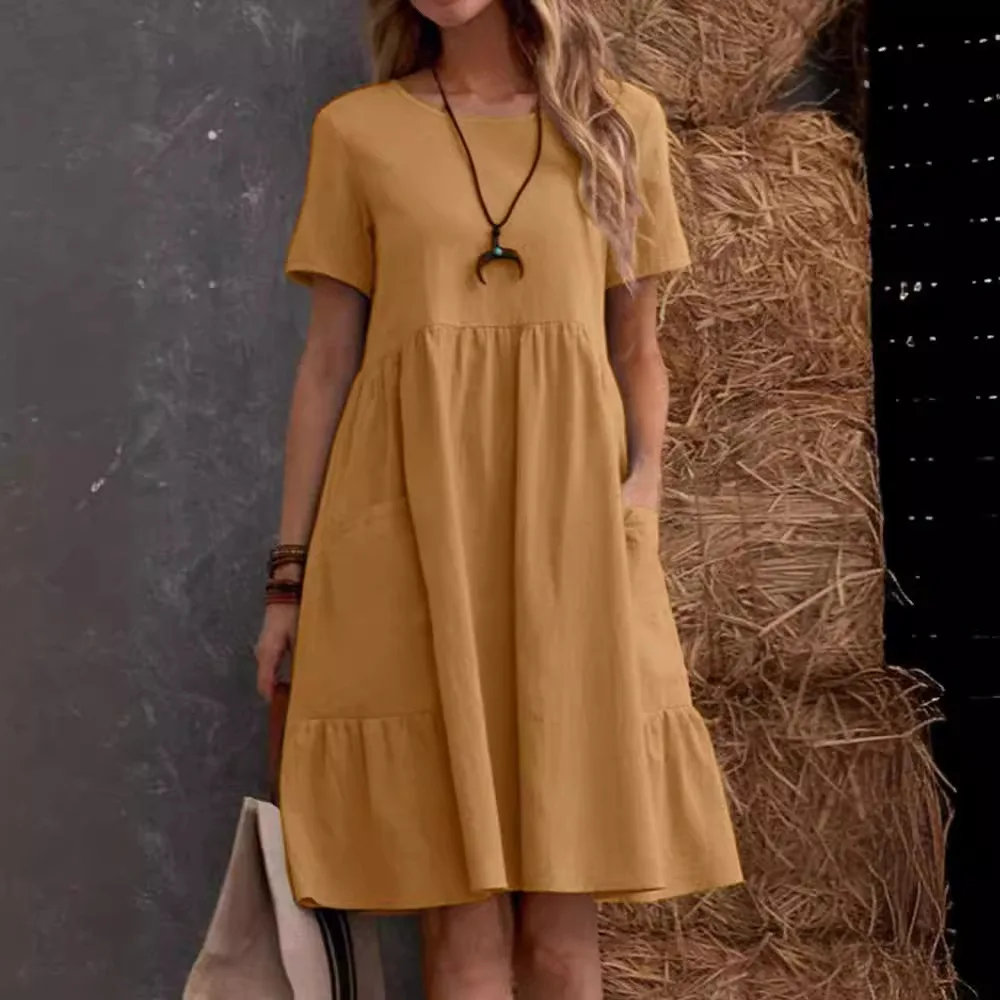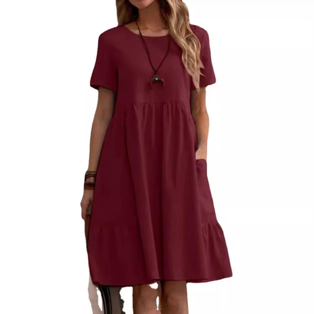 European and American women's retro cotton and linen loose pockets solid color round neck short-sleeved dress