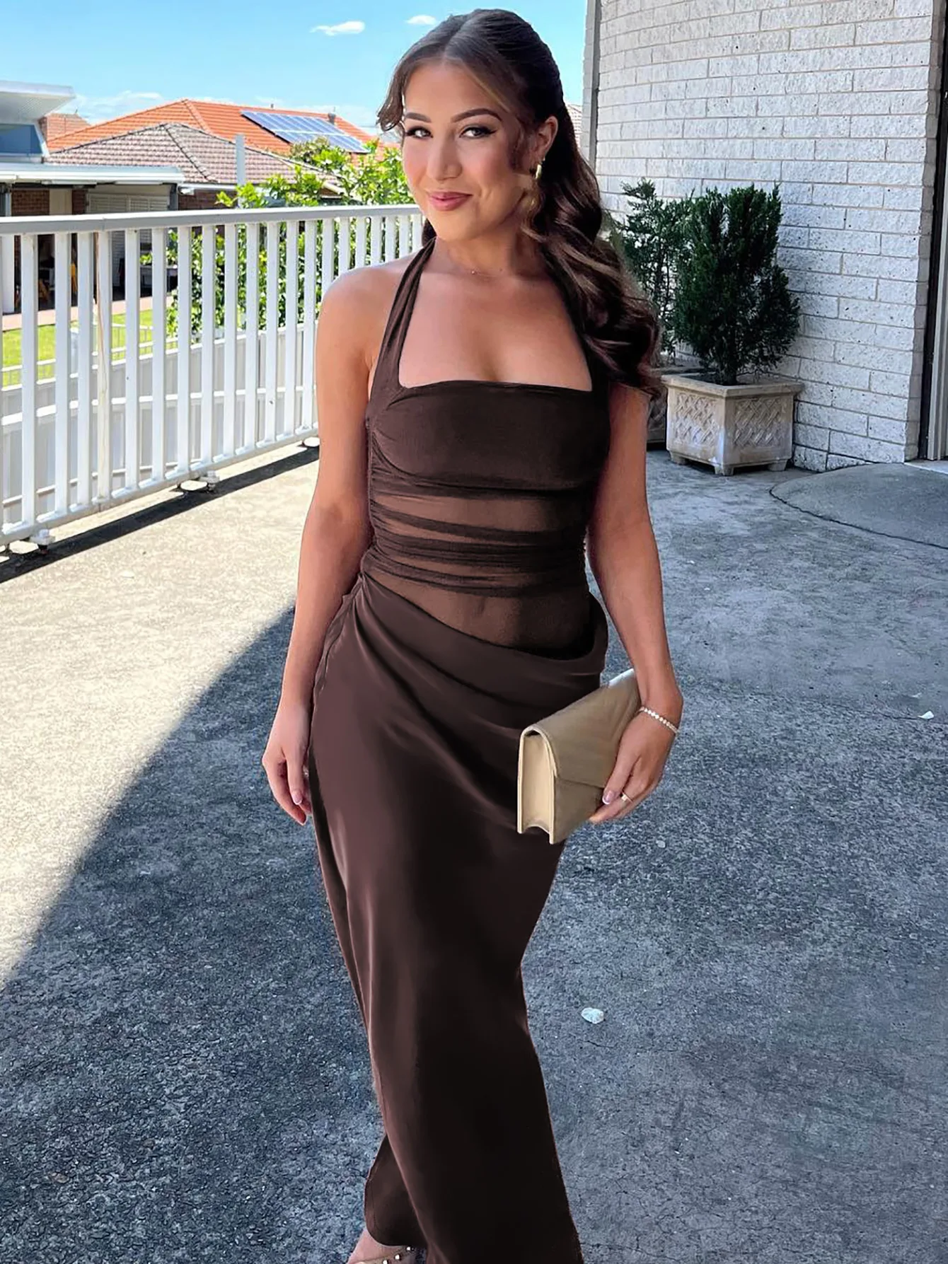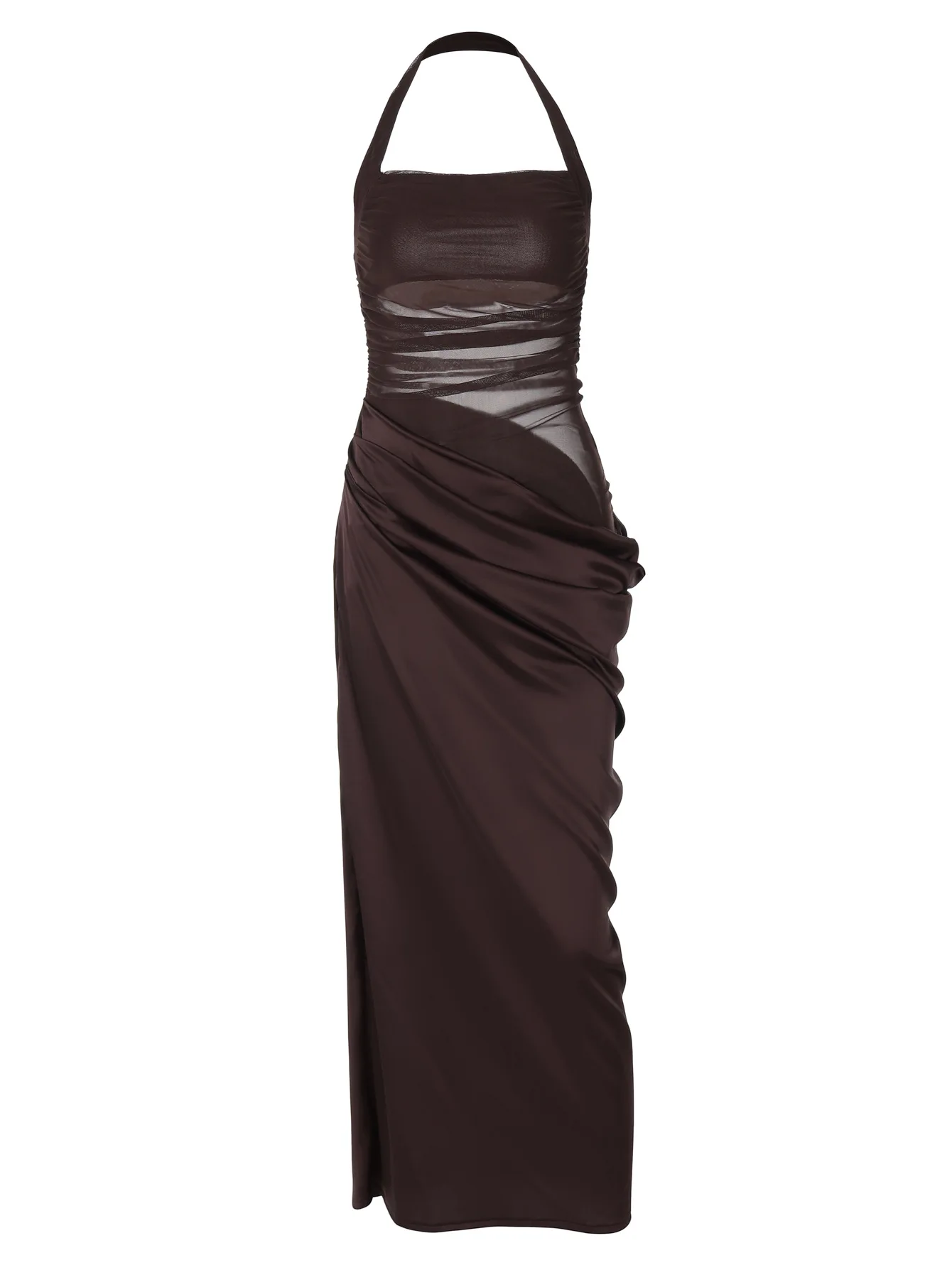 Sexy style mesh stitching dress slim backless solid color waist hanging neck temperament long skirt women's clothing