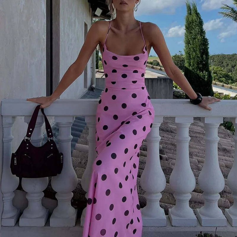 Summer Vacation Maxi Gown V-Neck Halter Polka Dot Dress Mesh Insert Slimming Floor-Length Dress Digital Printing Natural
