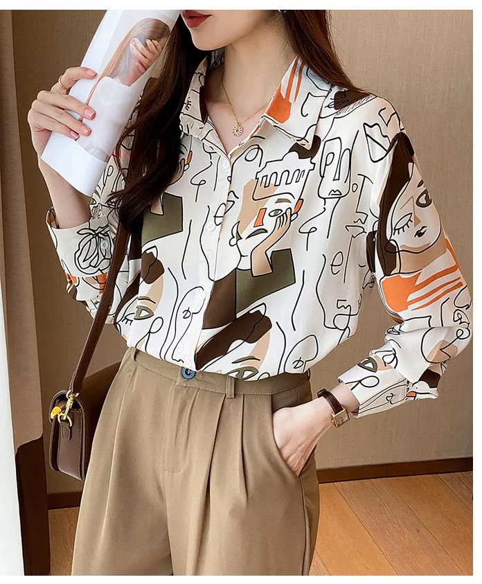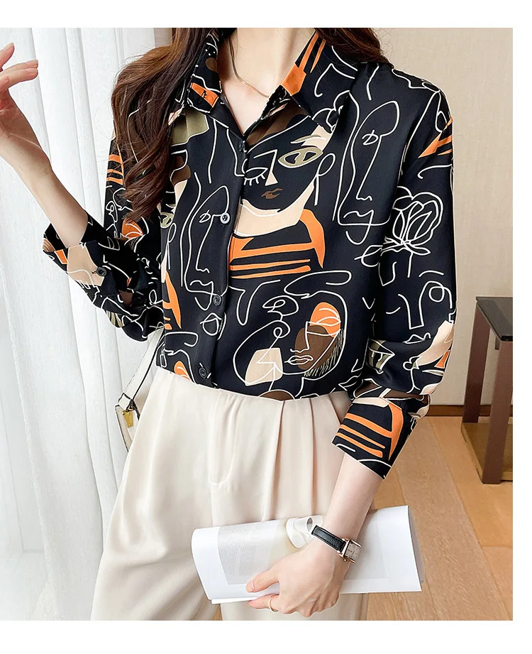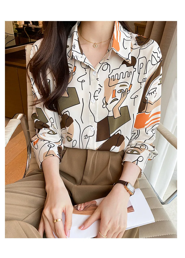 Women's long-sleeved loose collar shirt abstract retro printing celebrity style with spring and summer casual office style sexy