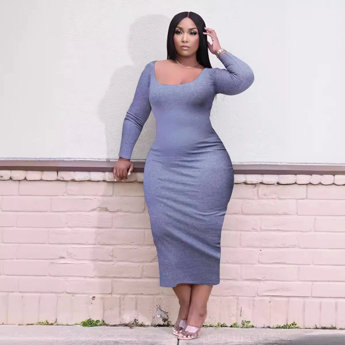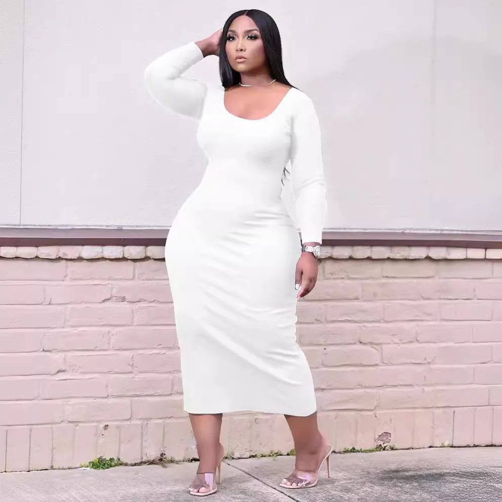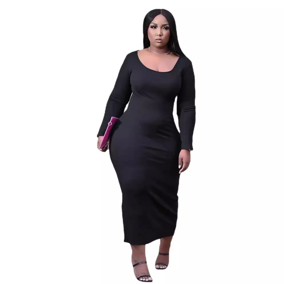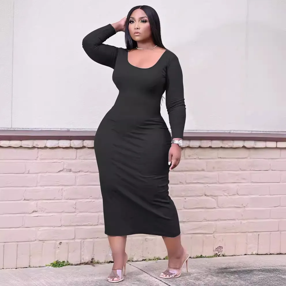European and American women's plus size dress U-neck solid color casual slim sexy plus size women's clothing