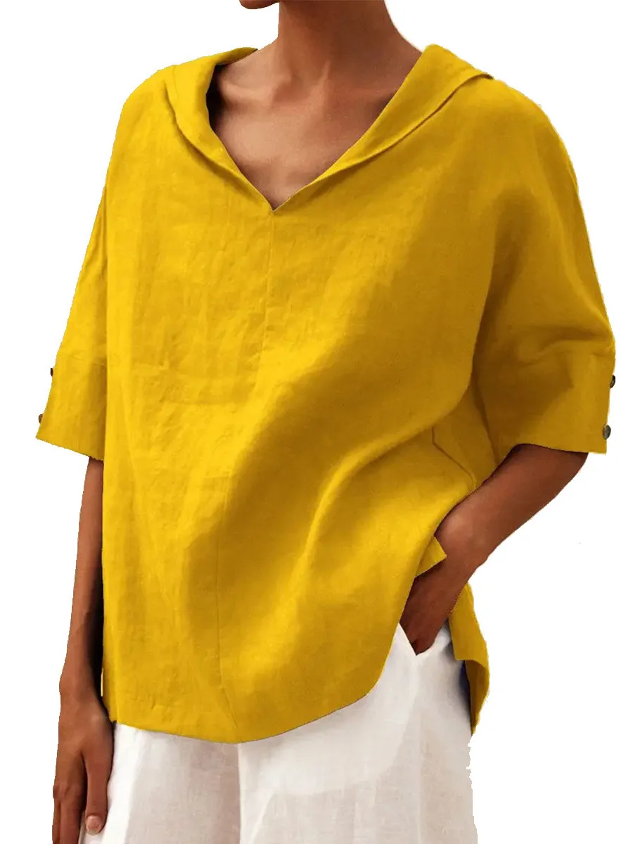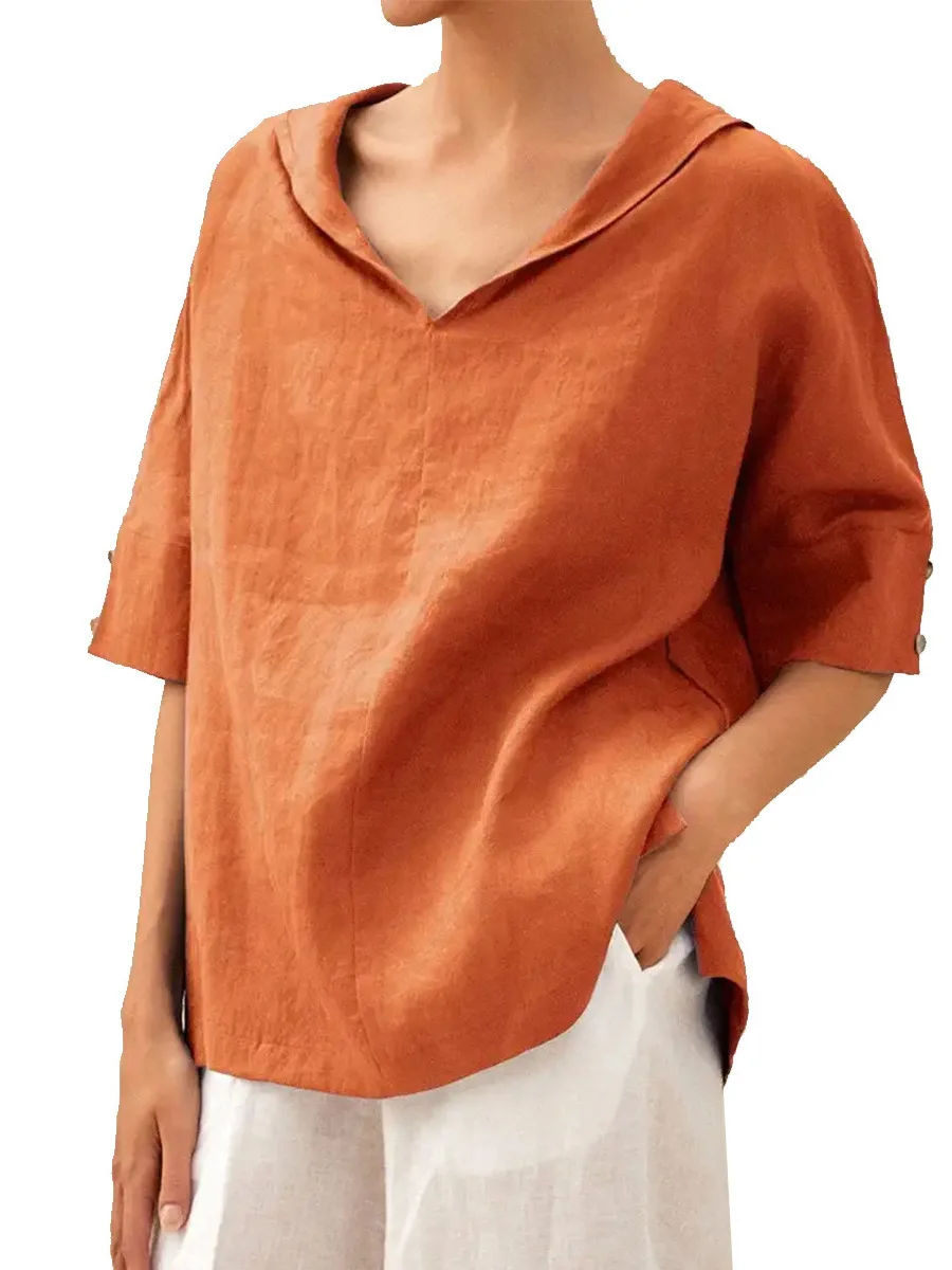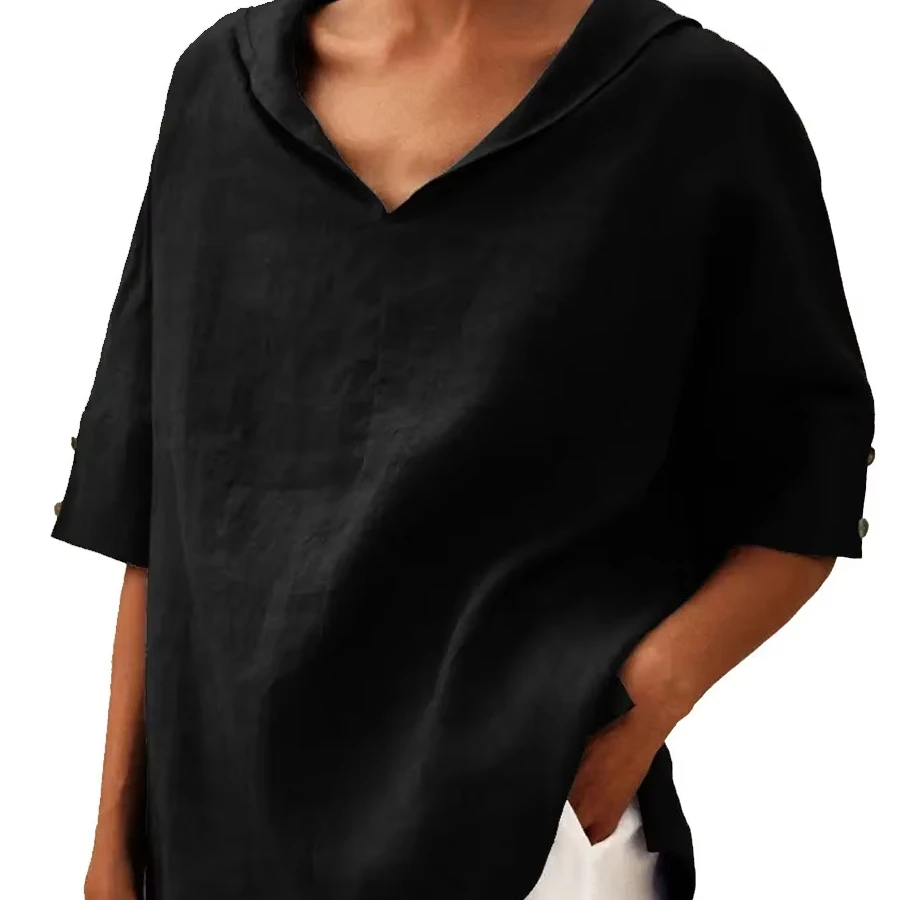 2026 new European and American women's solid color cotton and linen loose hooded top T-shirt