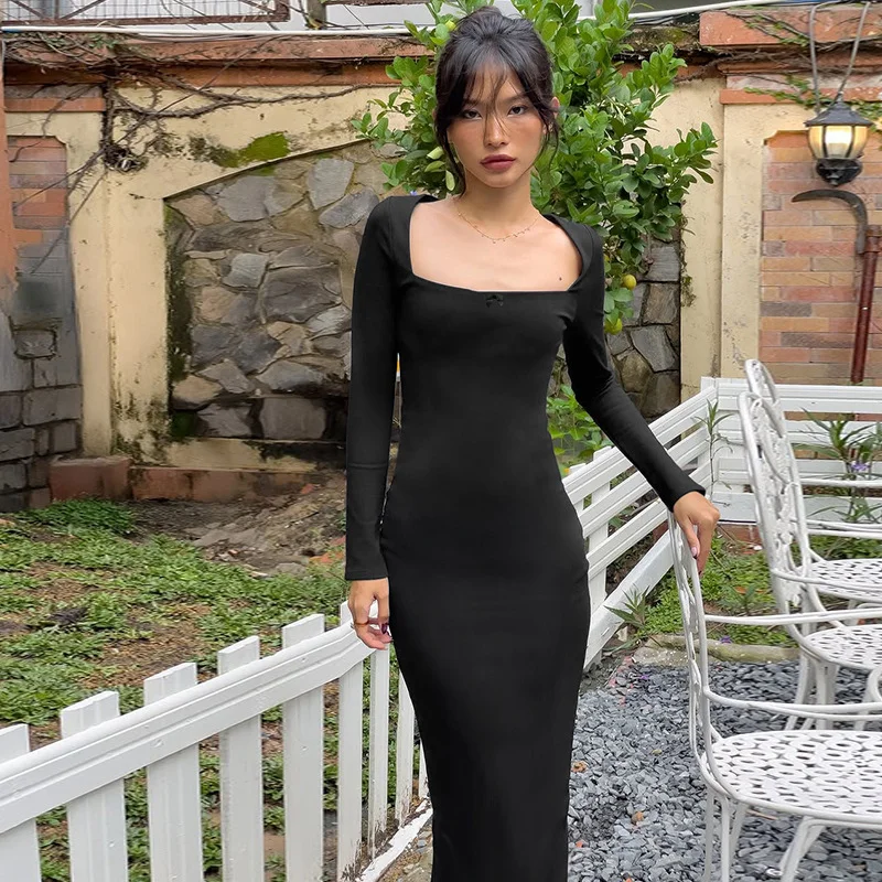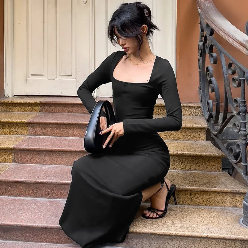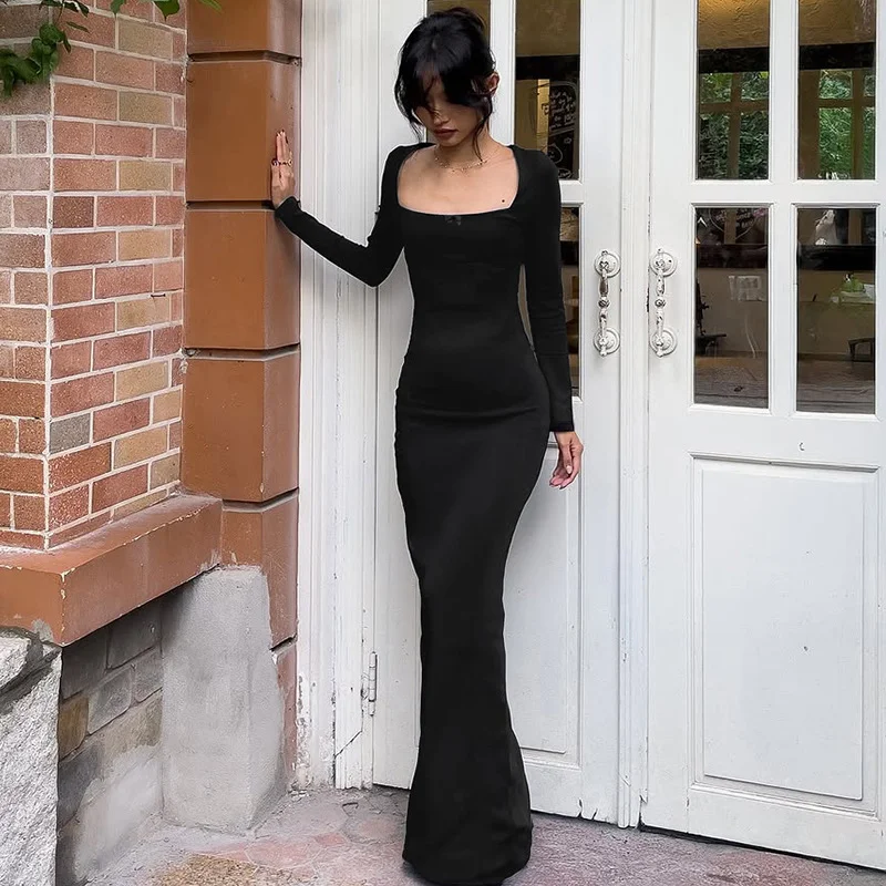 Women's Eco-Friendly Dress Straight Long Sleeve Ribbed Square Neck Casual Summer Autumn Black Party Club Dresses