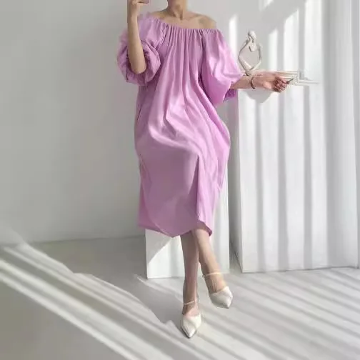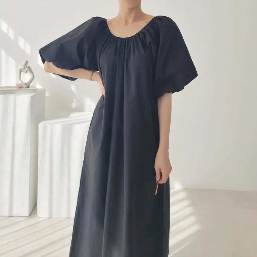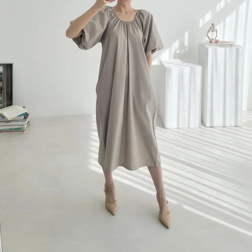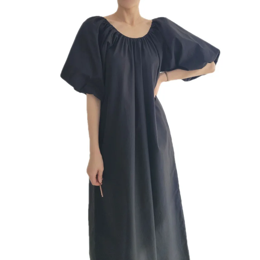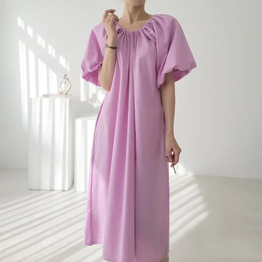 New summer products simple and fashionable pleated round neck loose lazy style thin long short-sleeved dress