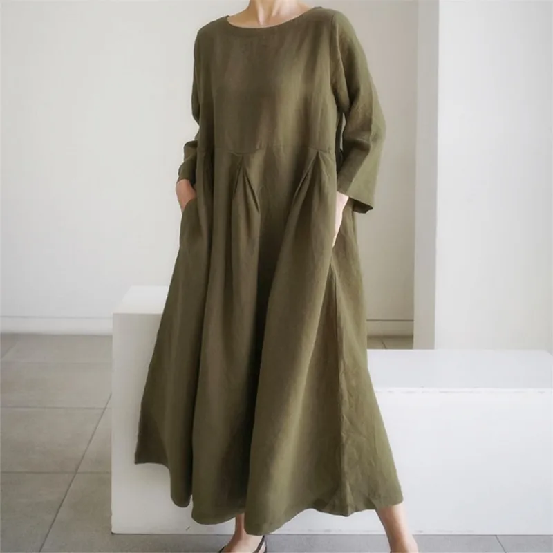 Loose plus size dress 2026 fat Japanese Korean cotton and linen round neck pullover solid color long skirt big swing skirt
