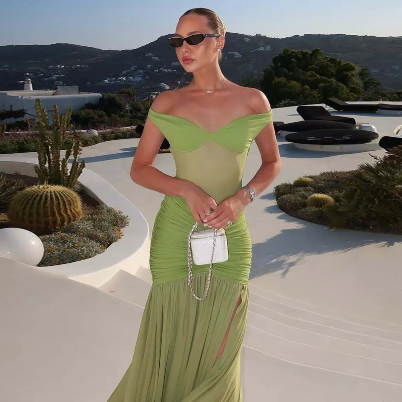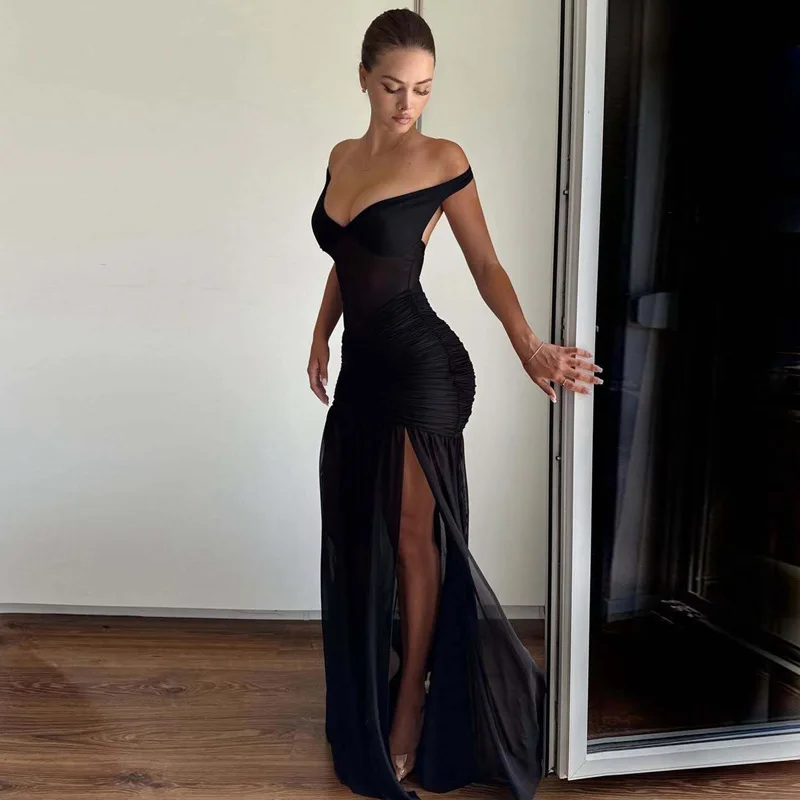 Mesh Patchwork Women's Summer Bodycon Maxi Dress Casual Draped Gown High Split Ruched Club Party Long Dress Natural Anti-Static