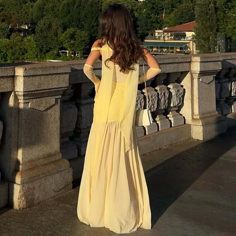 ZYHT 73571 Custom Elegant V-Neck Cape Sleeve Dresses Trendy Straight Yellow Maxi Party Gowns Modest Evening Dress for Women