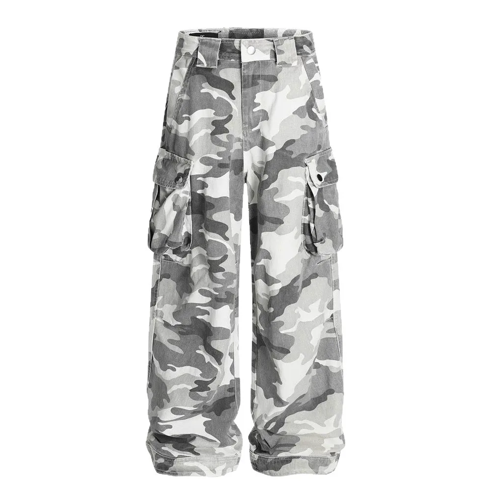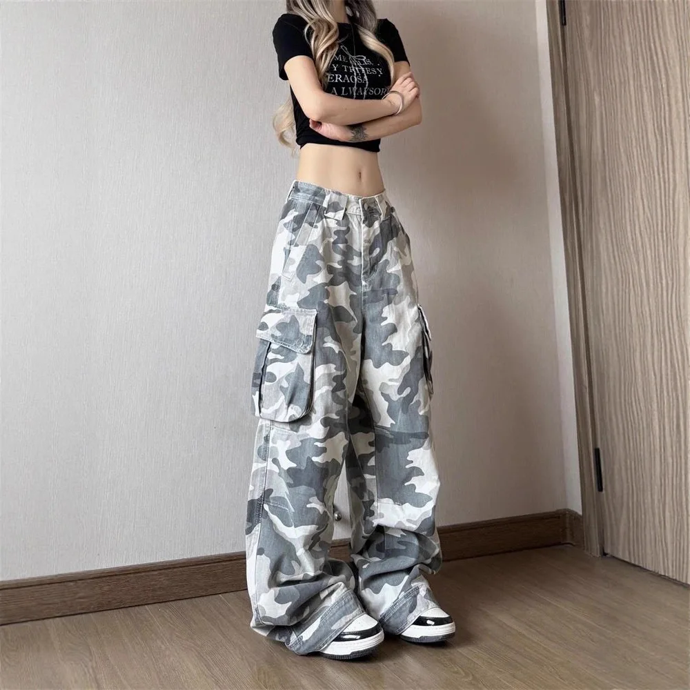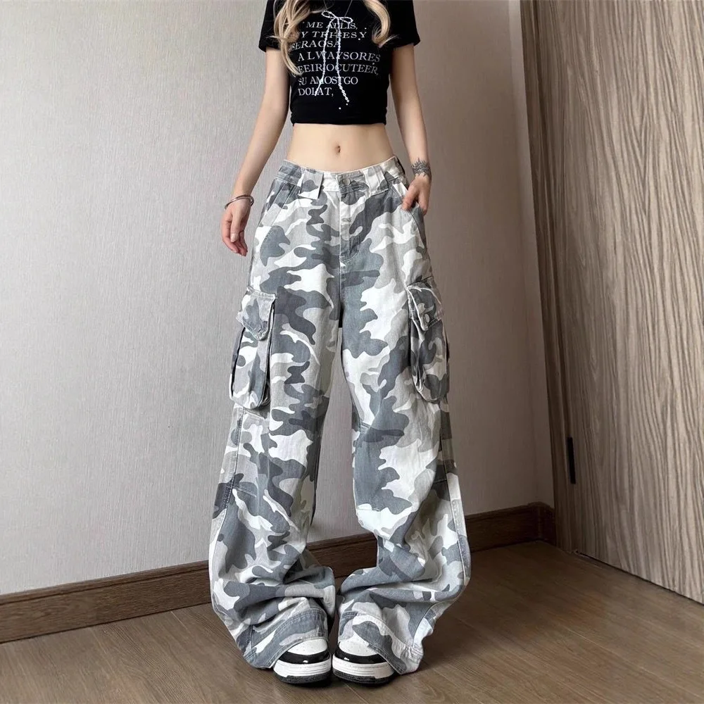 High Street Gray and White Camouflage Wide Leg Pants for Women, Trendy Loose Straight Retro Workwear Denim Trousers