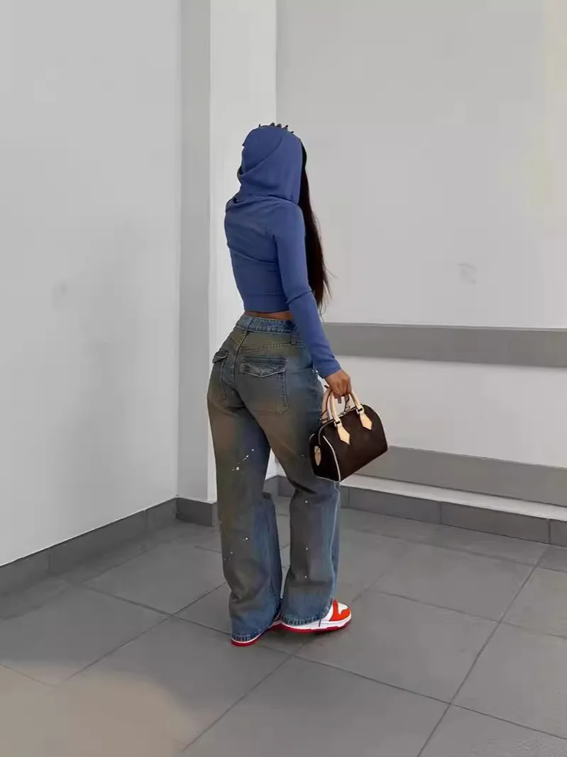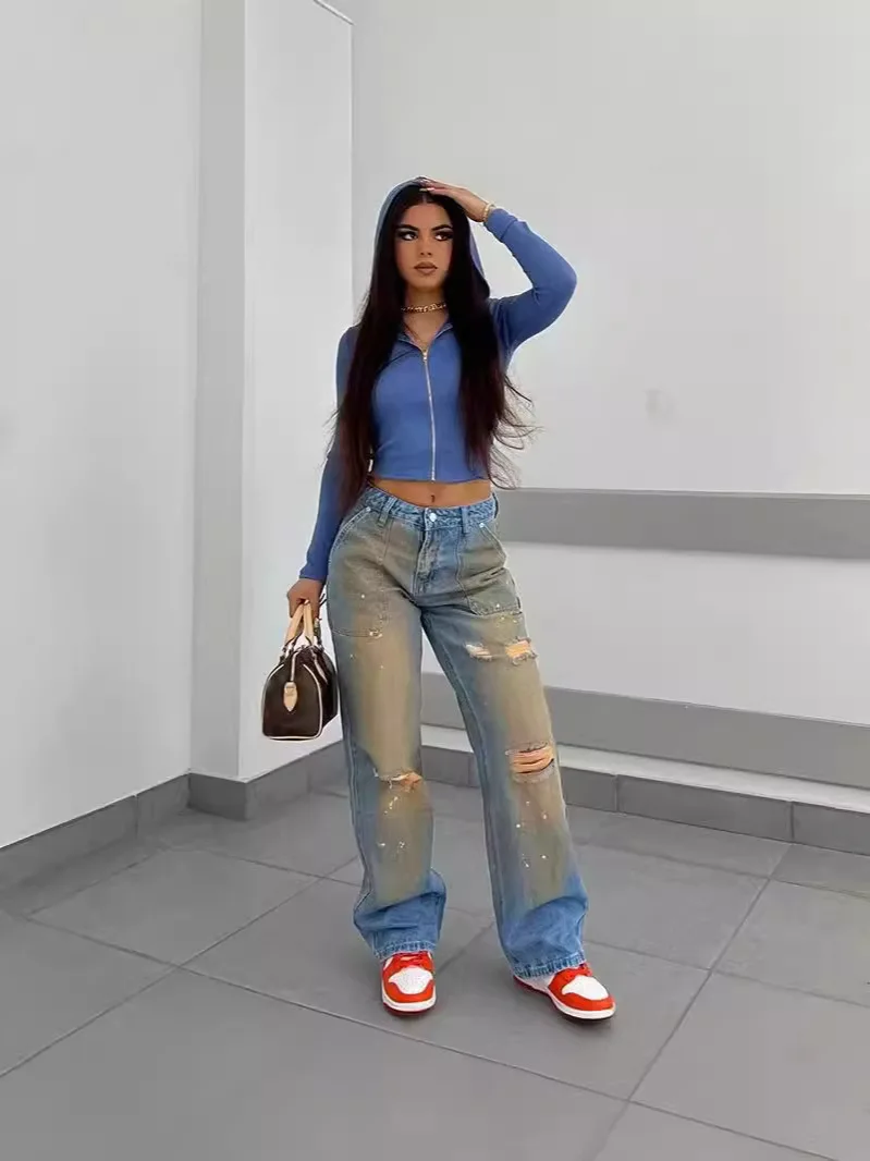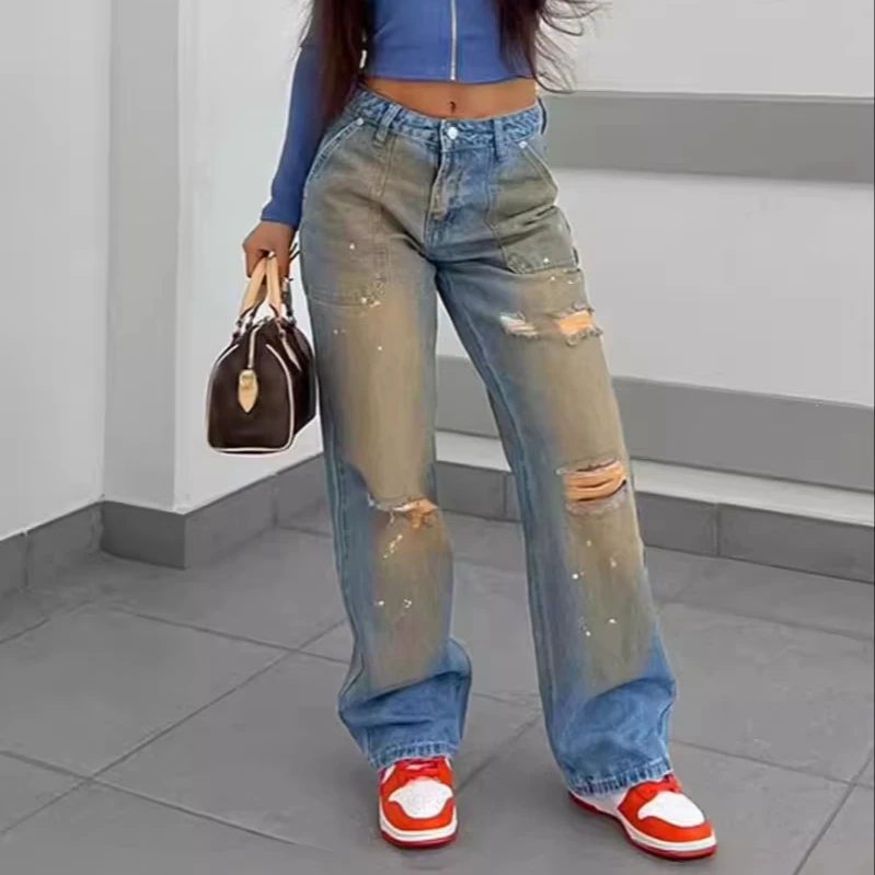 Retro Gradient High-waisted Cowboy Jeans with Holes and Splashes of Ink Street Style Straight Casual Trousers