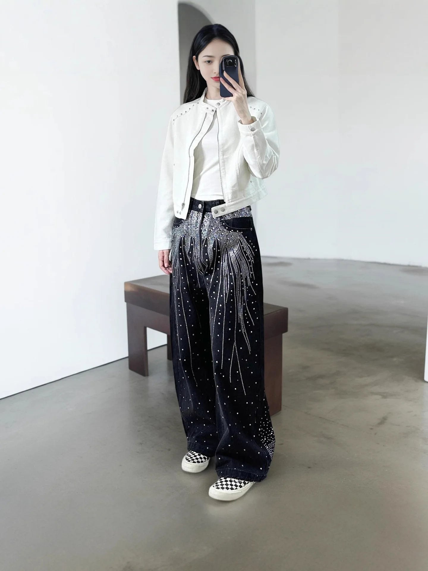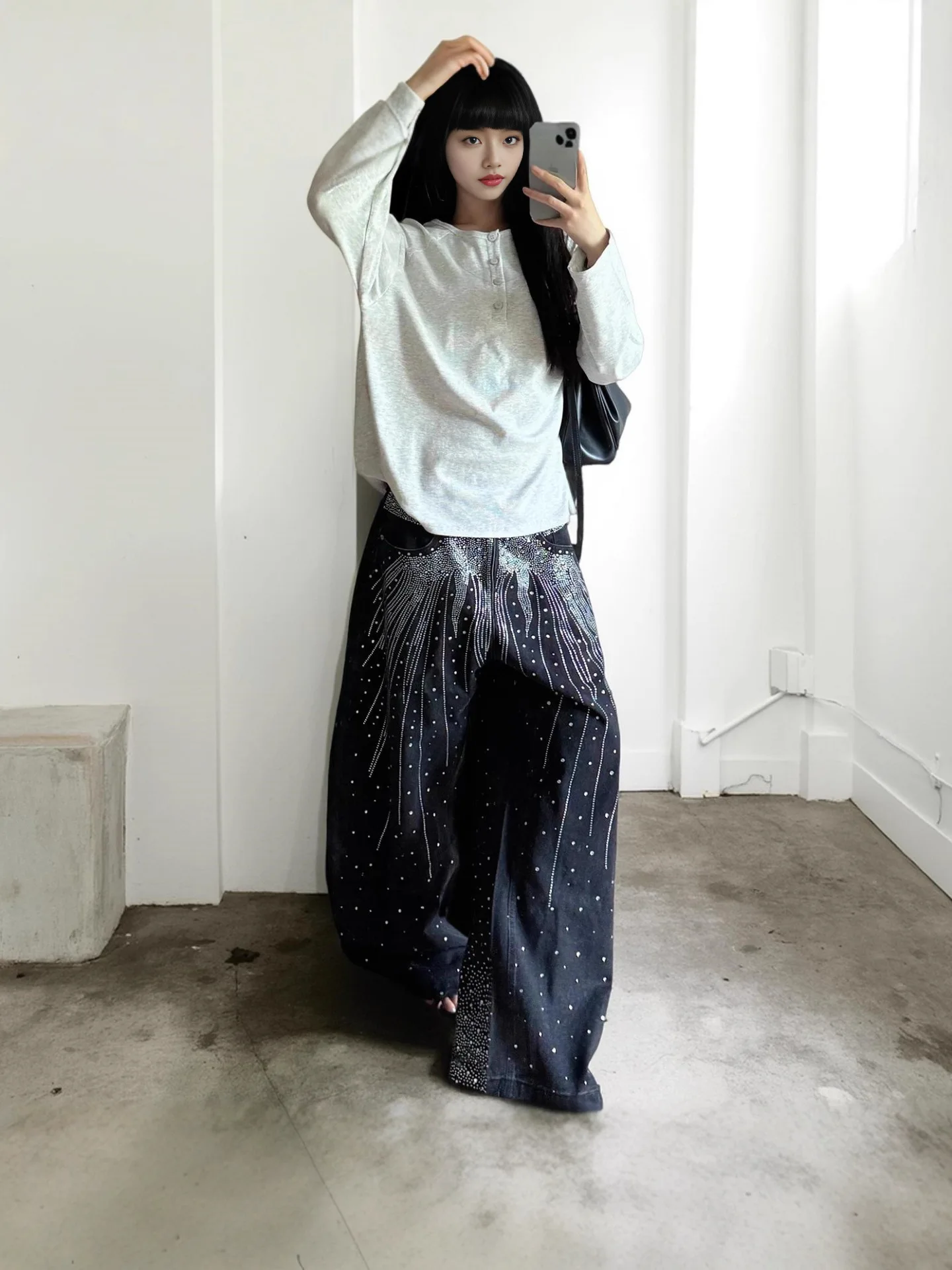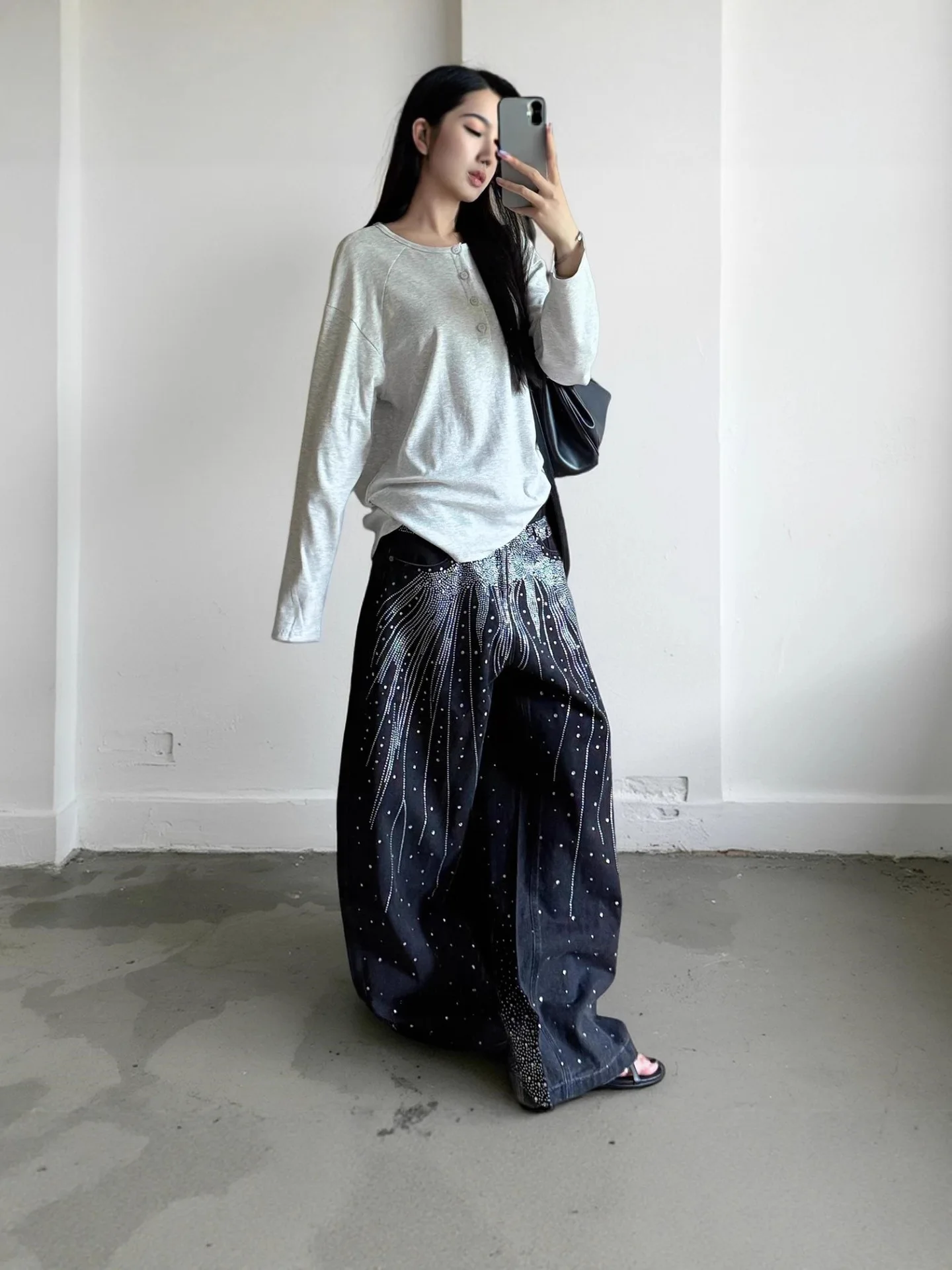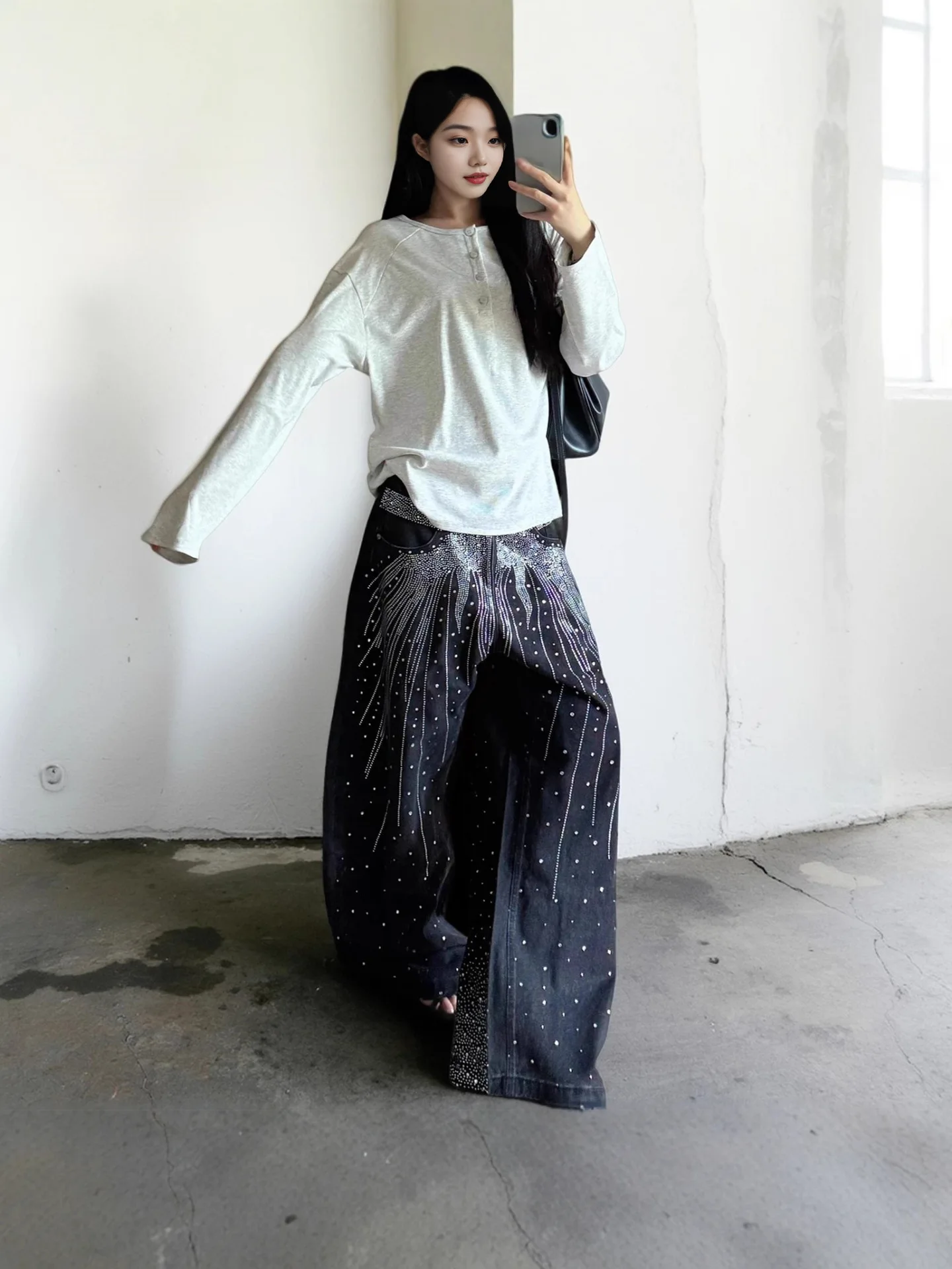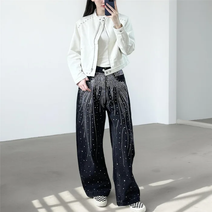 Autumn and Winter Retro Hot Diamond Jeans Street Trend Loose Wide Leg Denim Trousers for Women