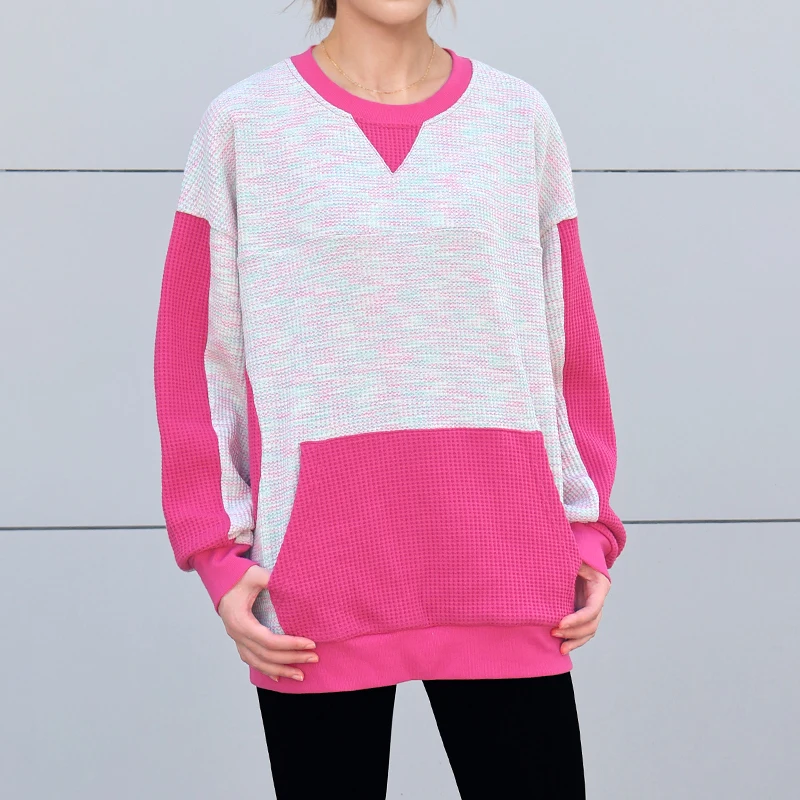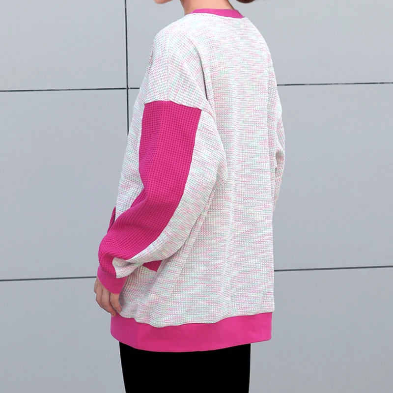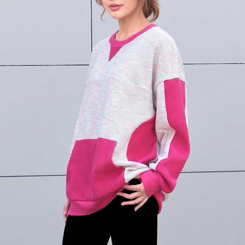 Women's Winter Casual Hoodie Top Long Sleeve Customizable Pattern Round Neck Patchwork Knitted Sportswear Sweatshirt