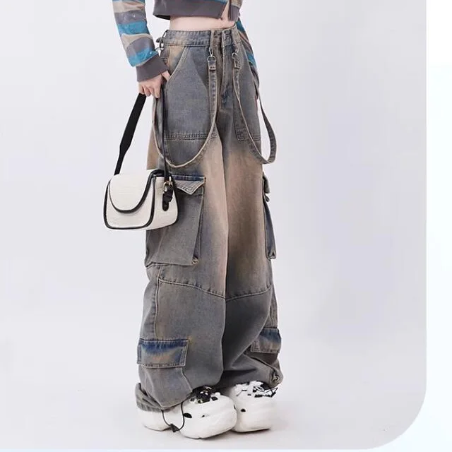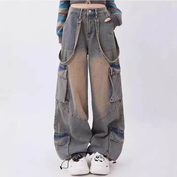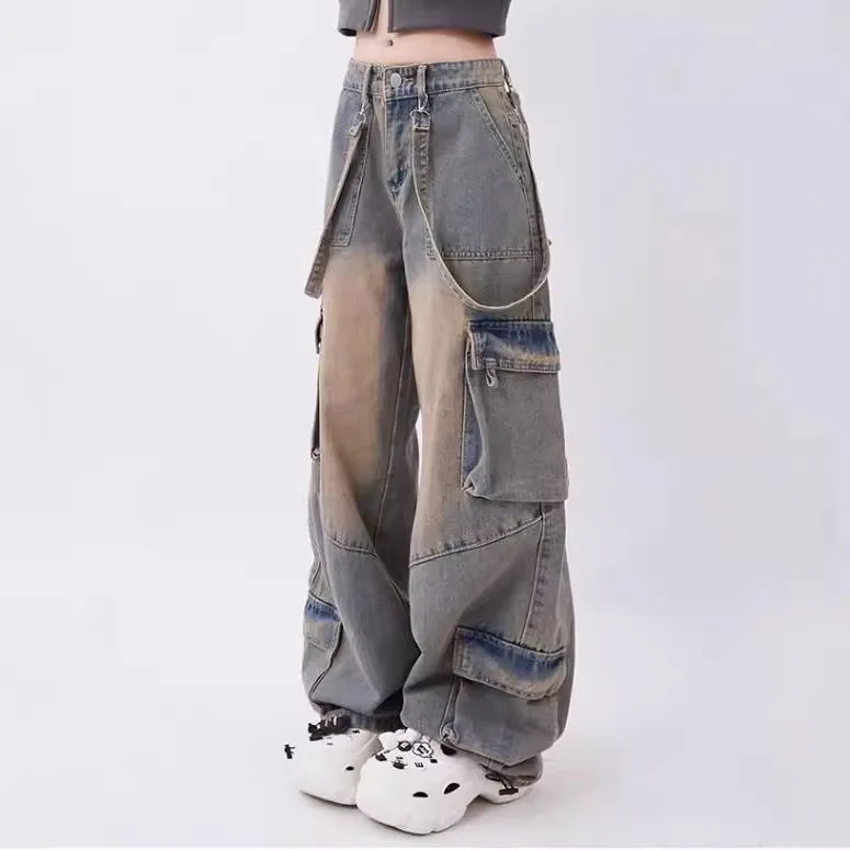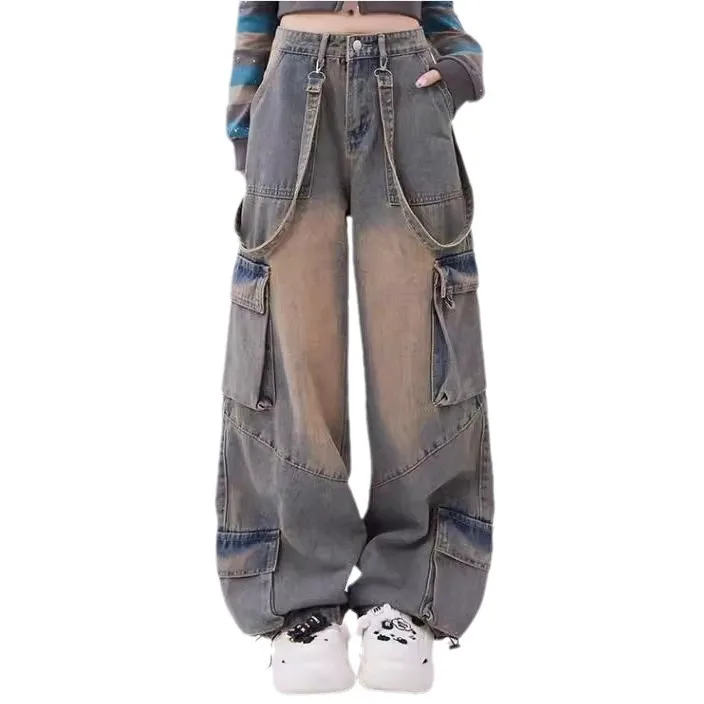 Retro Distressed Large Pocket Design Women's Straight Wide-leg Trousers Versatile High-waisted Overalls