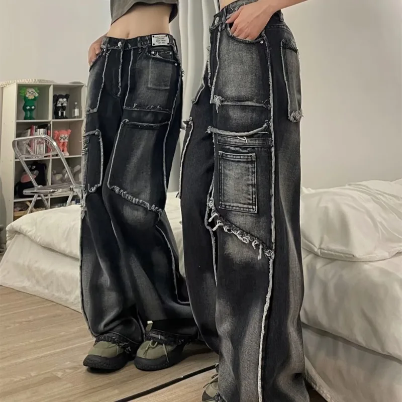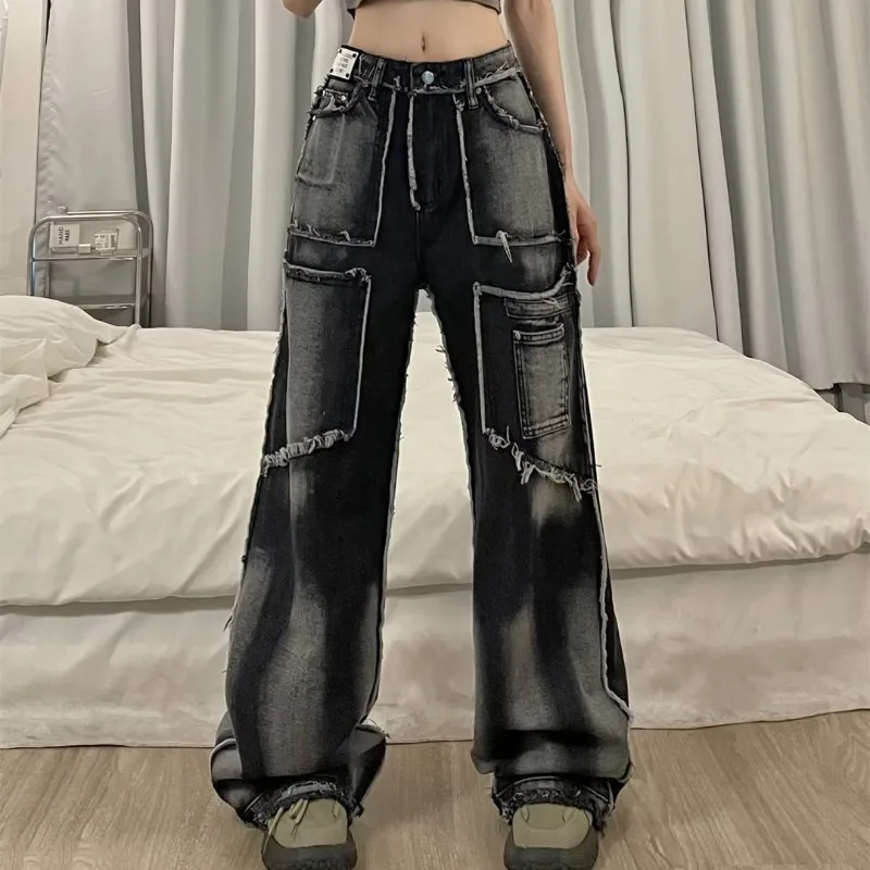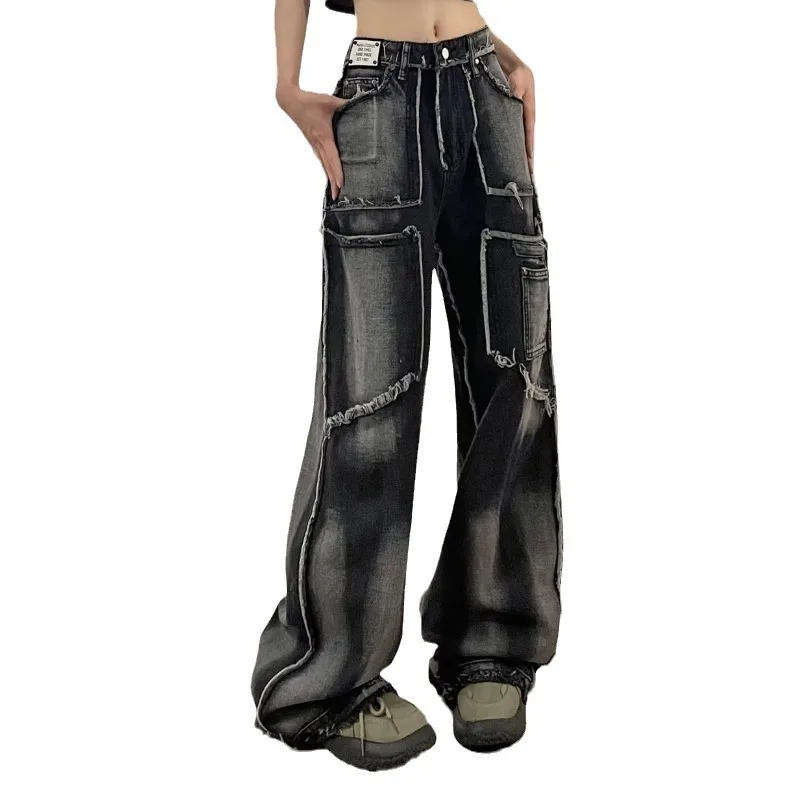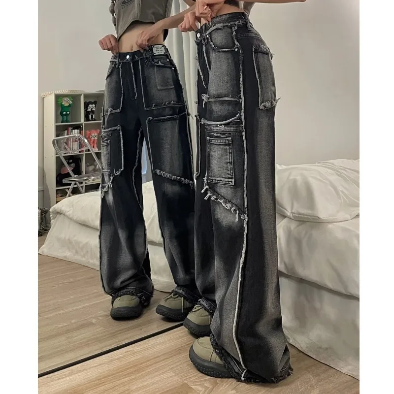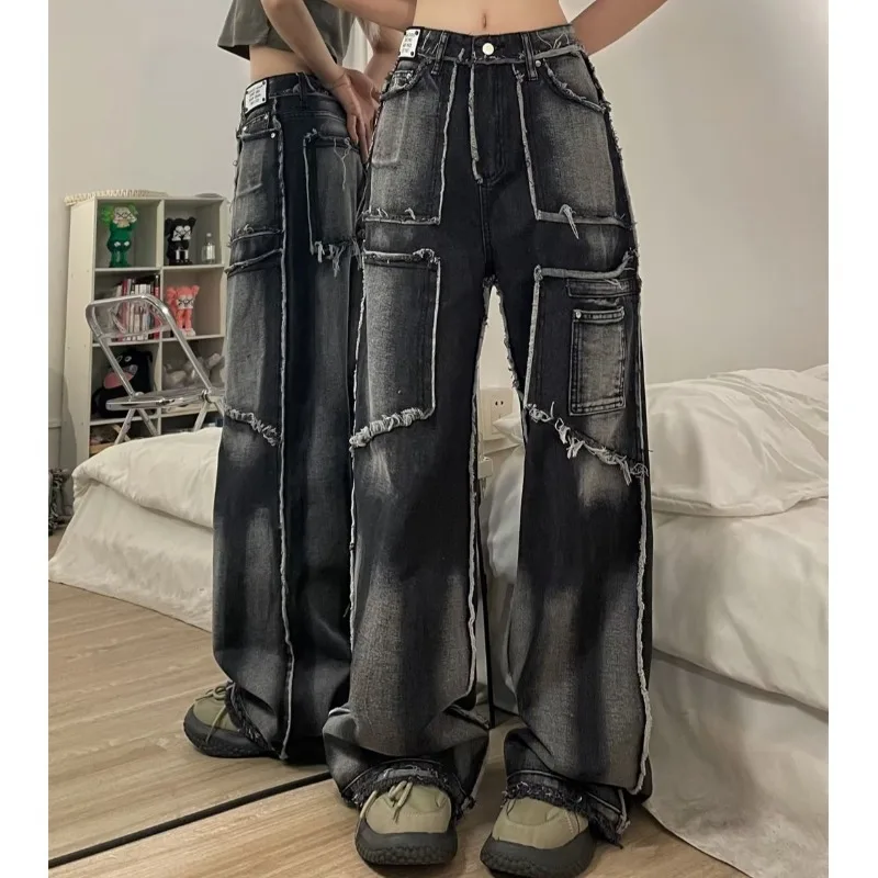Women's Raw Edge Jeans Niche Tie-dye Hip-hop Street Loose Straight Straight Floor-length Pants