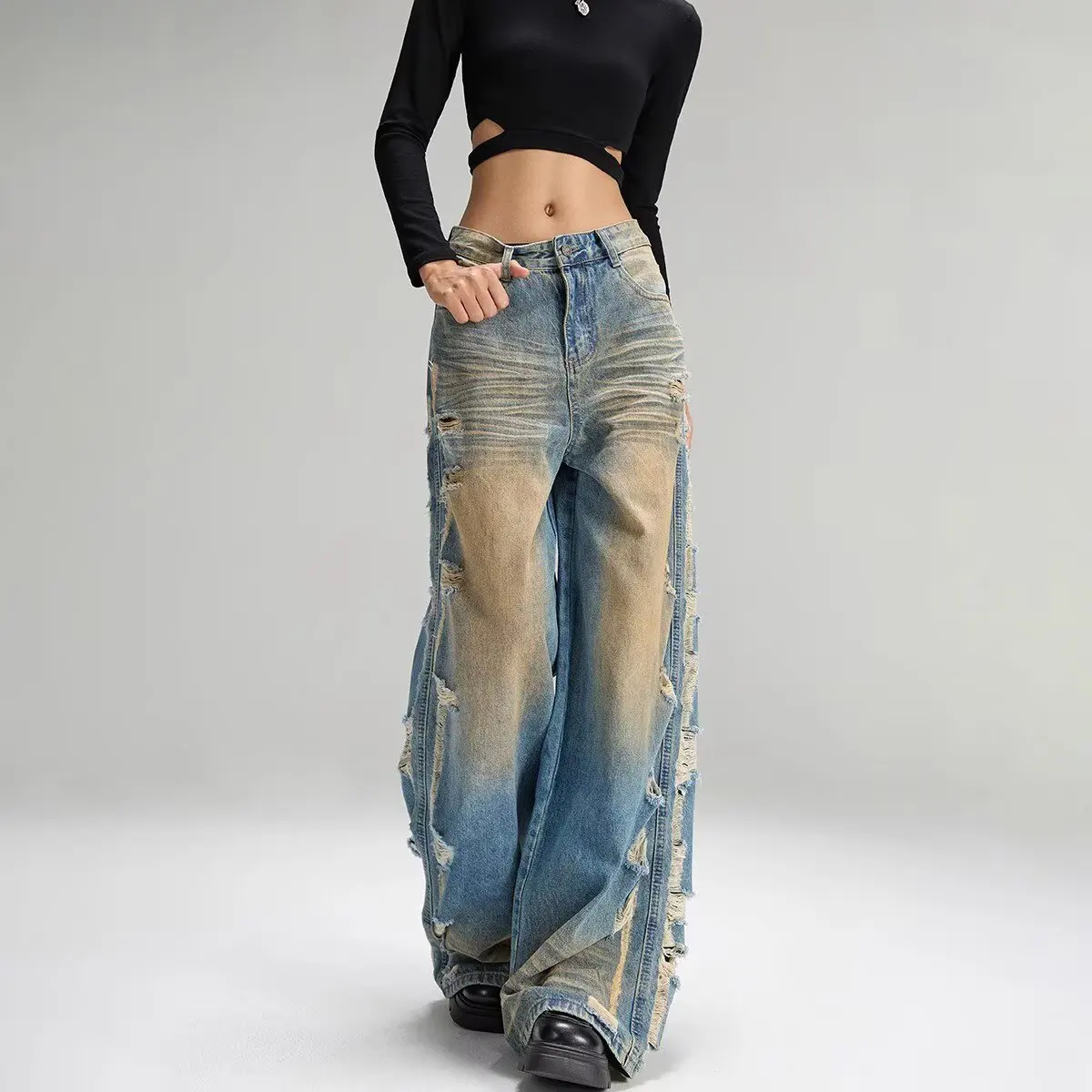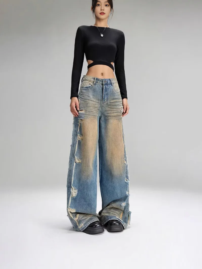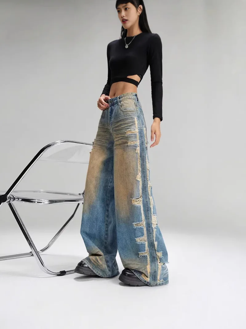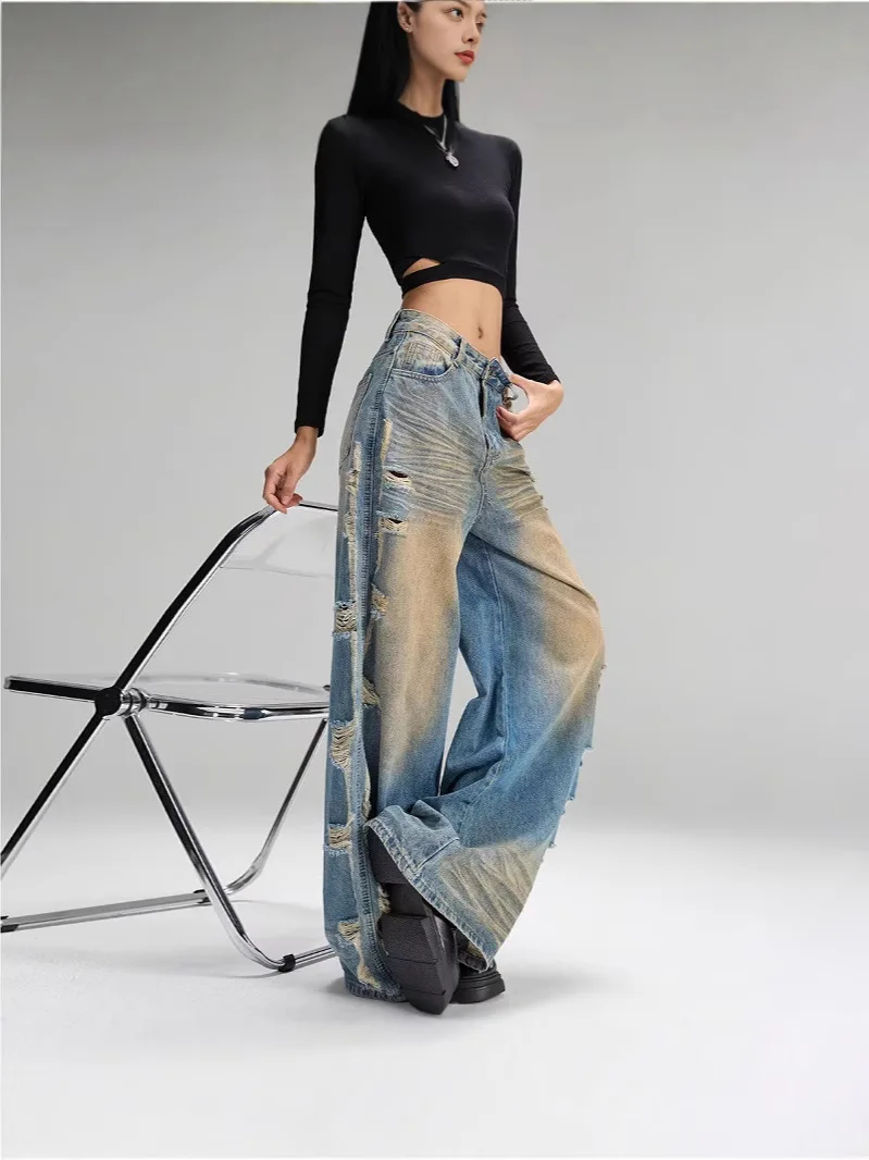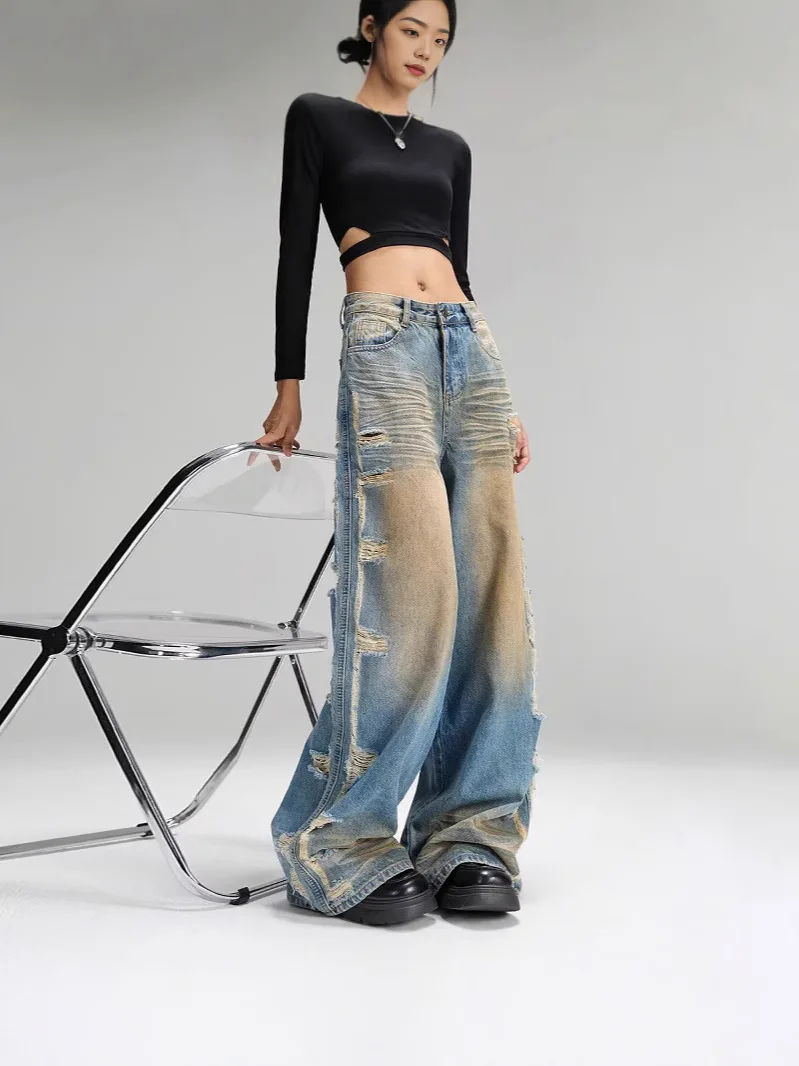 Retro Loose Wide-leg Jeans for Men and Women Niche Trendy High Waist Straight Ripped Jeans