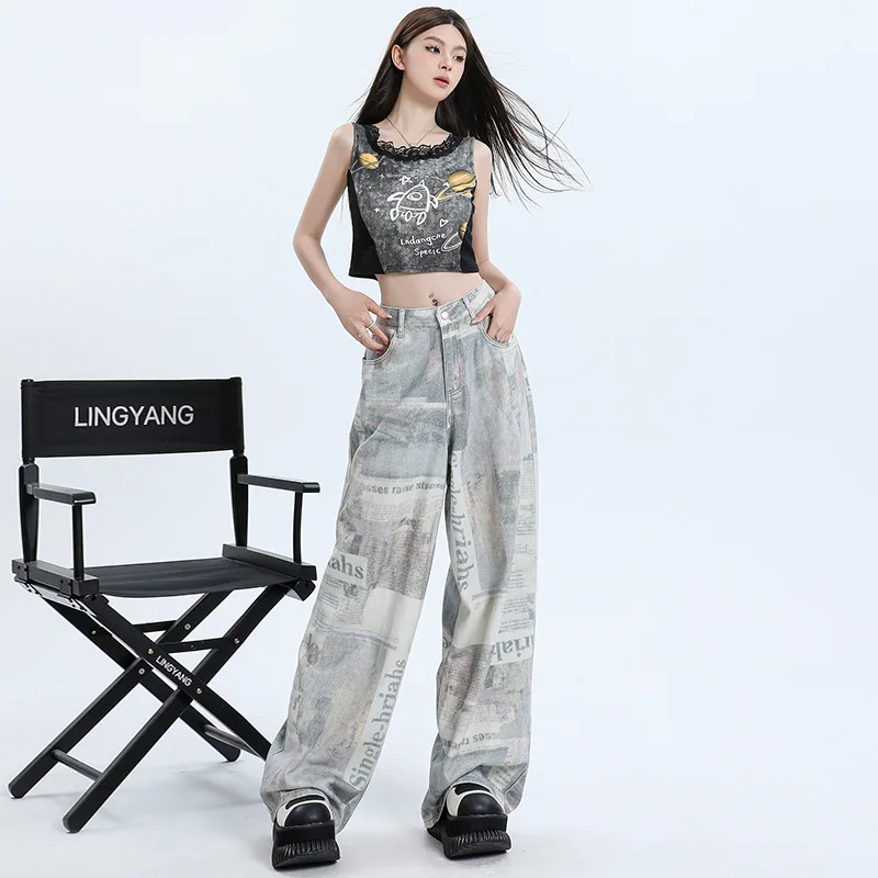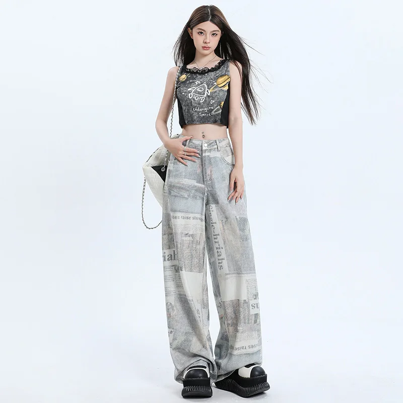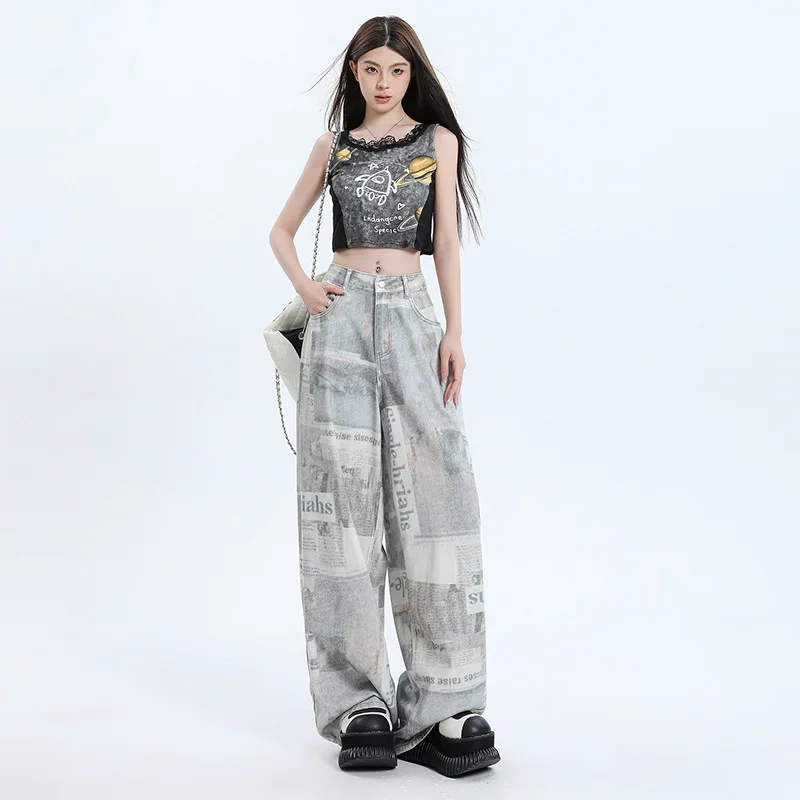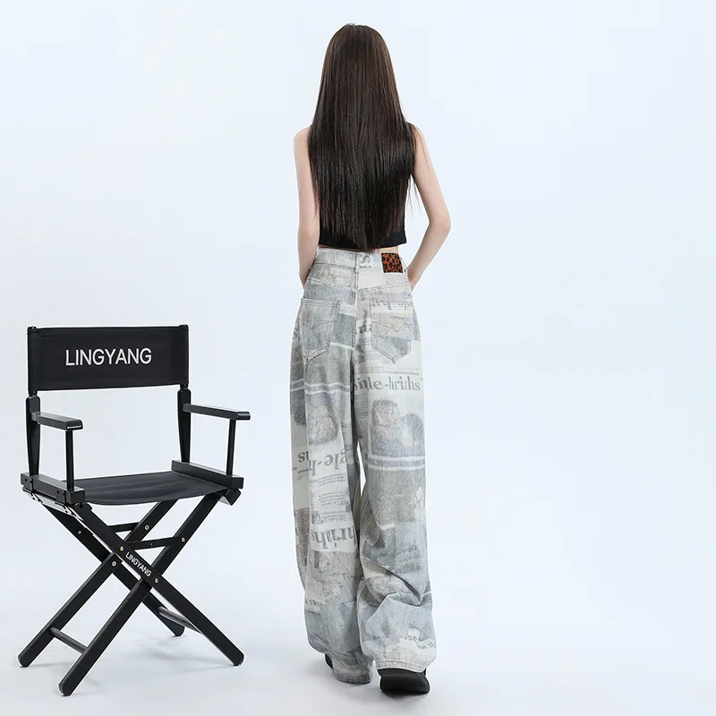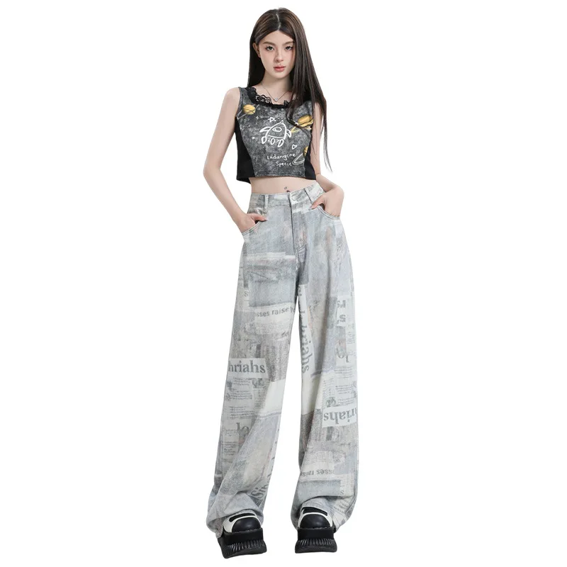 2026 Summer New Newspaper Printed Wide-leg Jeans for Women Straight Loose High Waist Slim Floor Pants