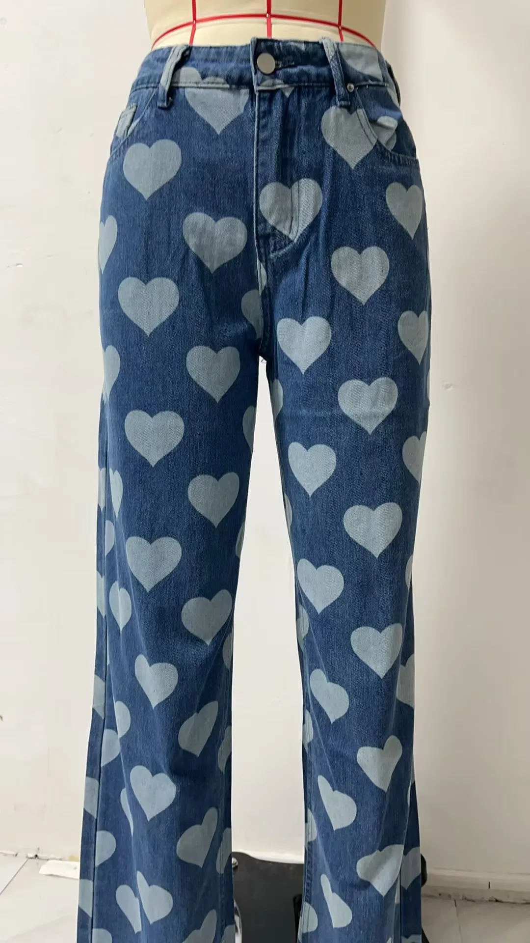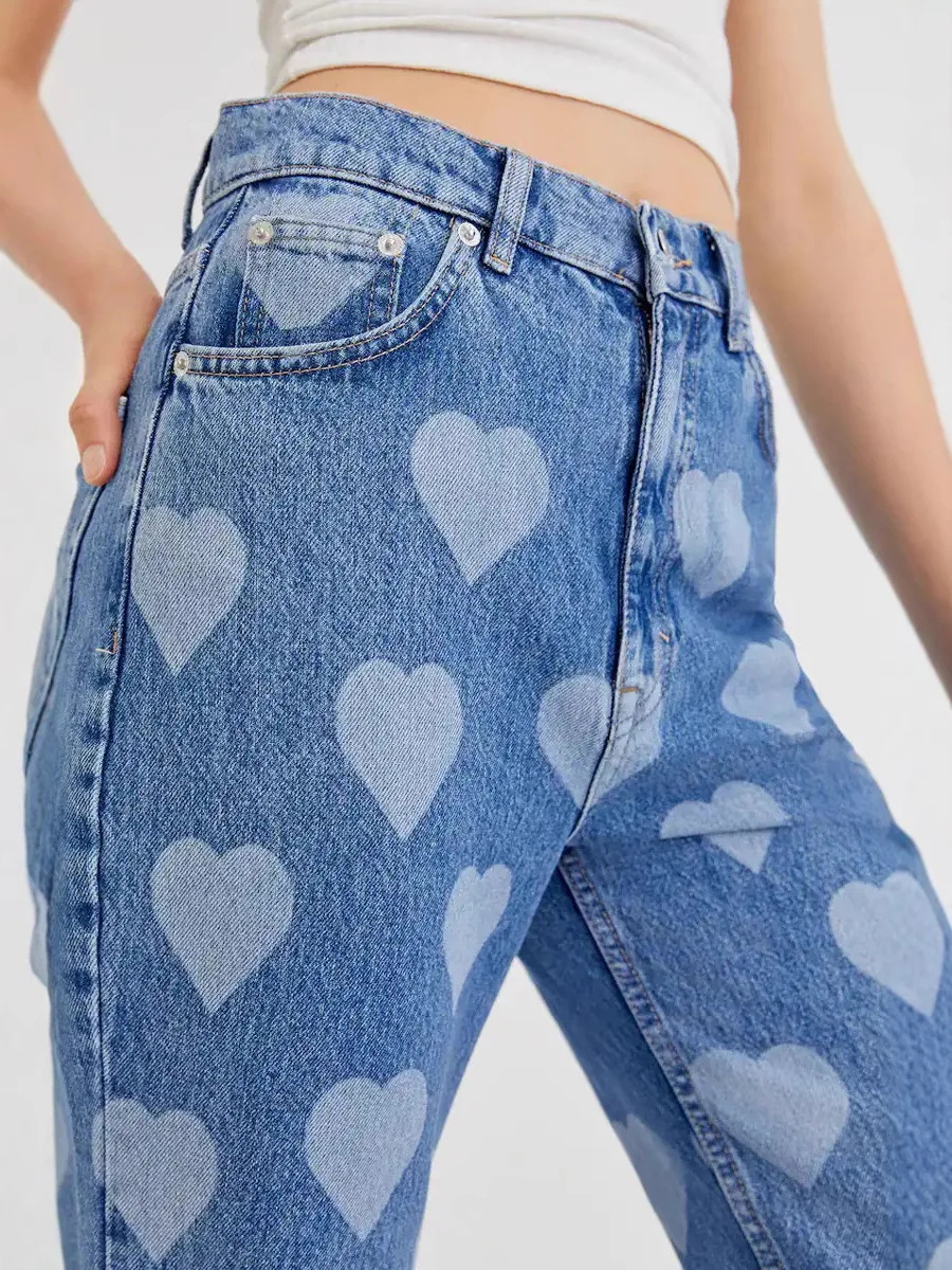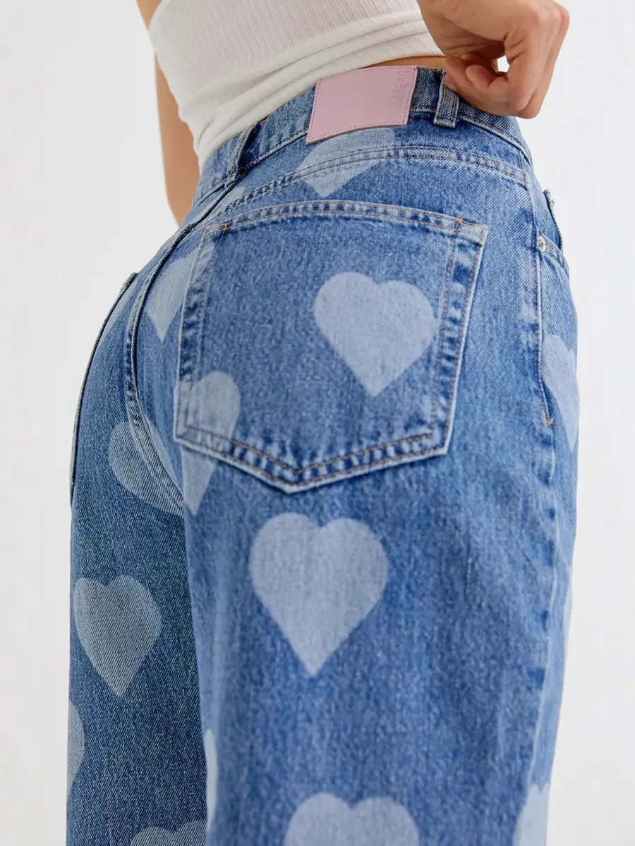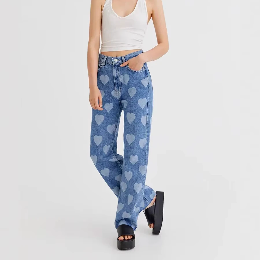 Fashion Retro love Printed Straight-chip Jeans for Women 2026 High Waist Slim Loose Wide-leg Pants
