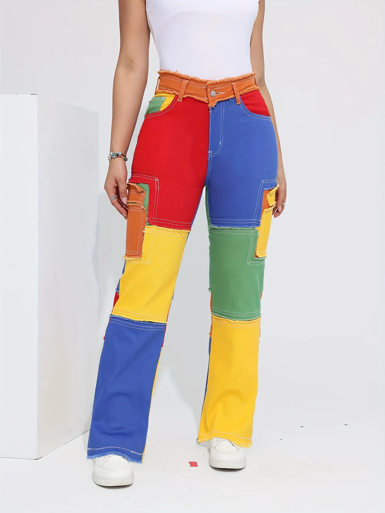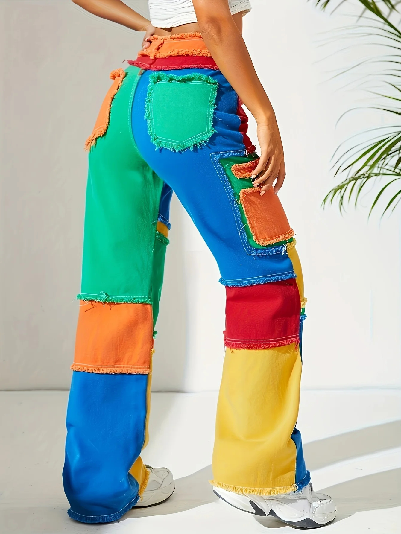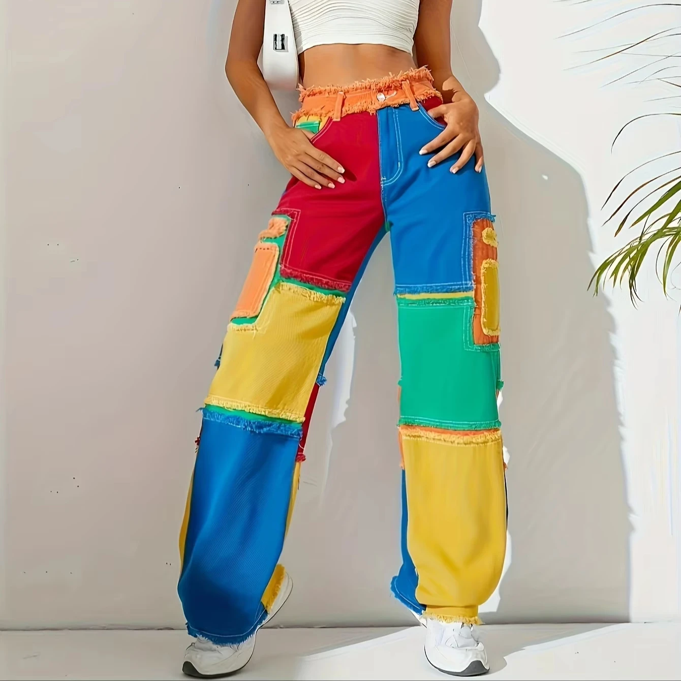 American Women's Denim Straight-leg Pants Color Blocked Breasted High-waisted Slim Loose Jean Trousers