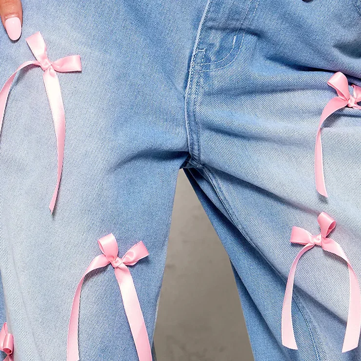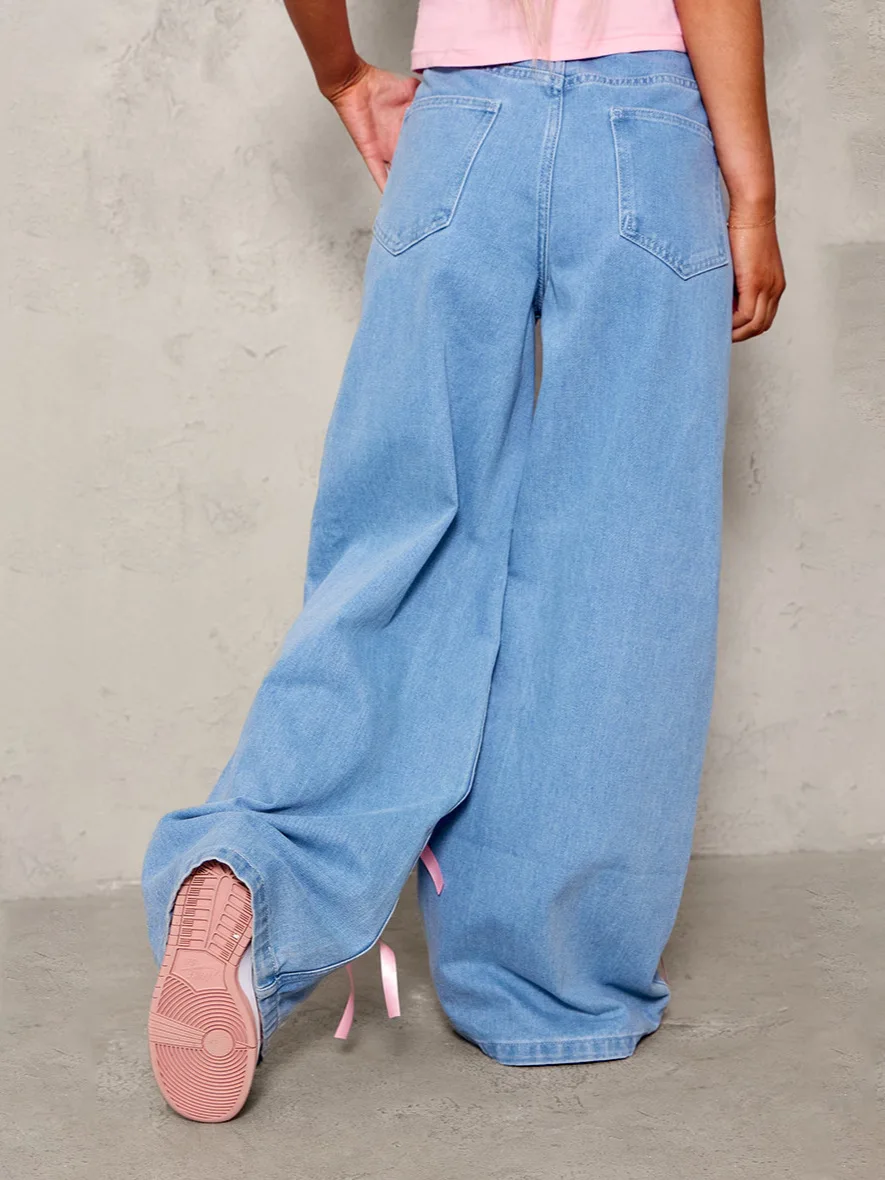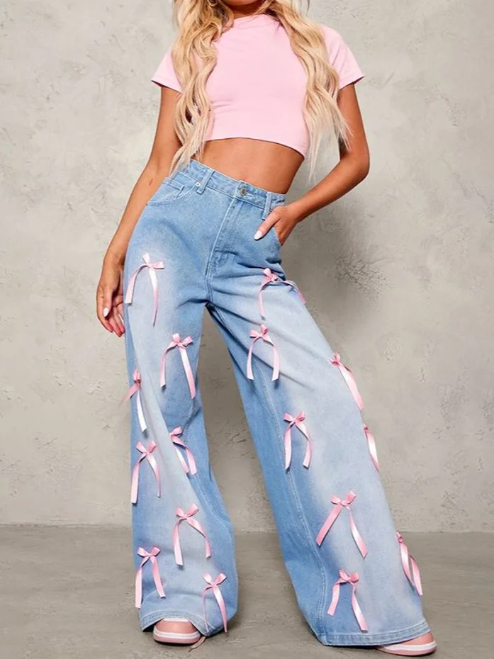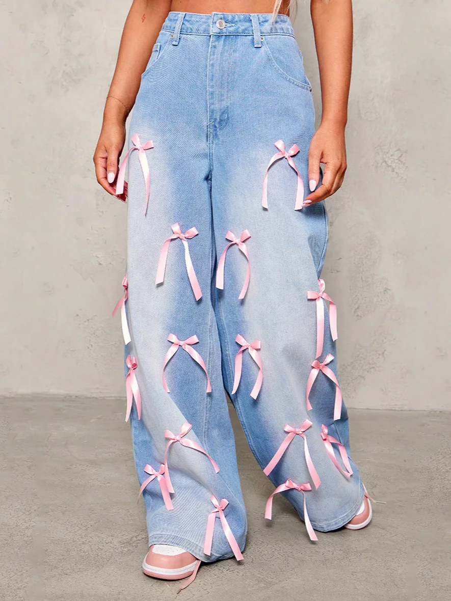 Hot Selling High Waist Bow Mopping Wide-leg Jeans European and American Loose Jeans Women's Style
