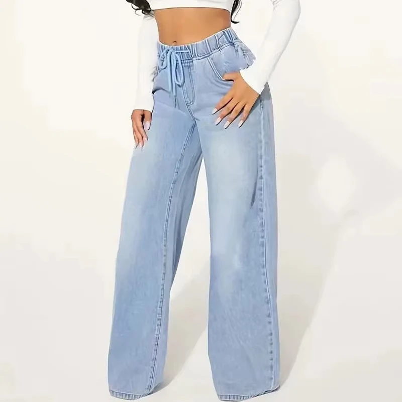 Jeans Women's Clothing 2026 Foreign Trade Denim Girl European and American Drawstring Loose High Waist Slimming Wide Legs
