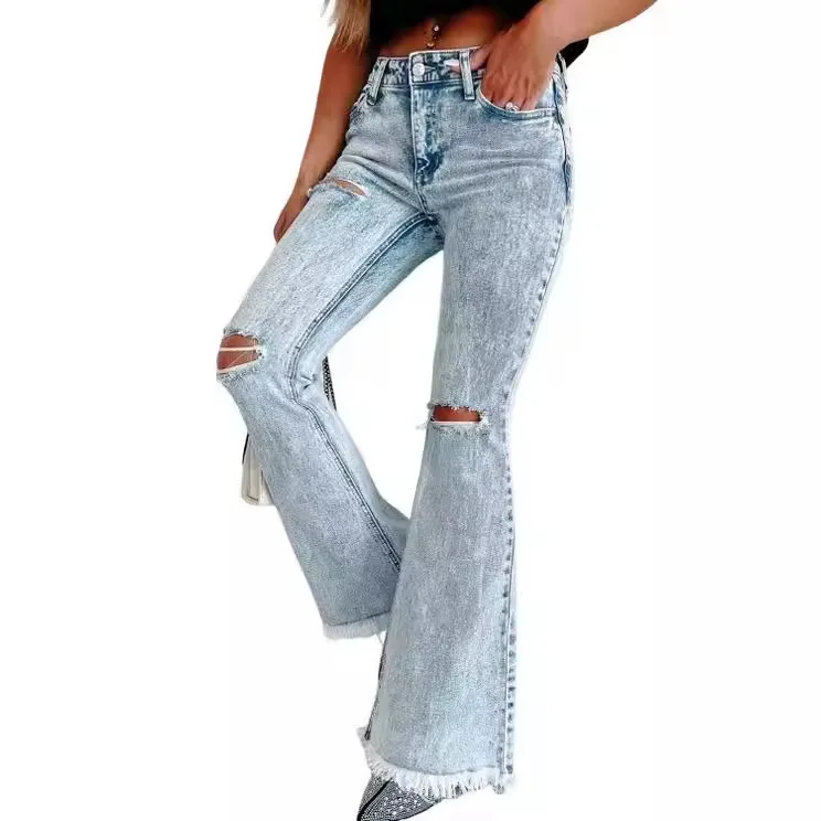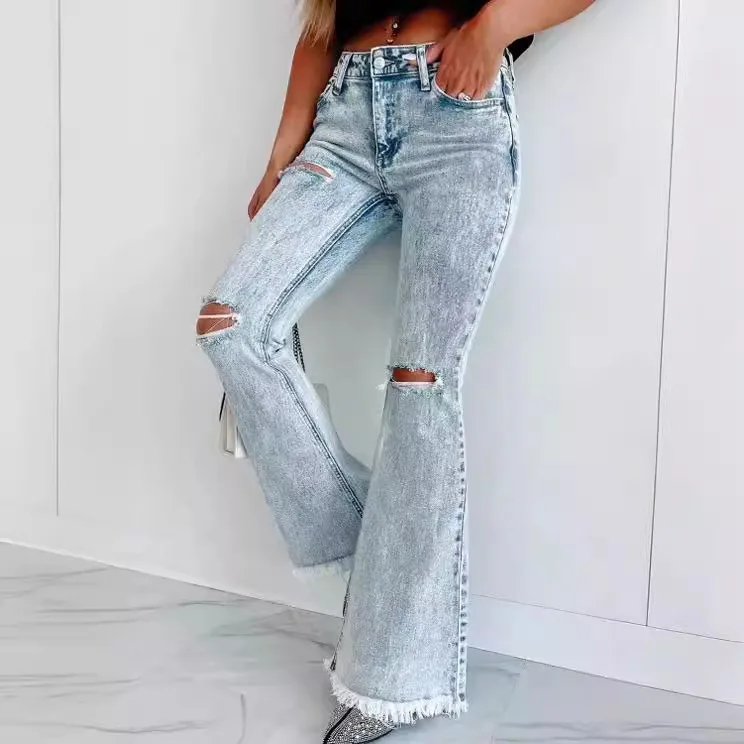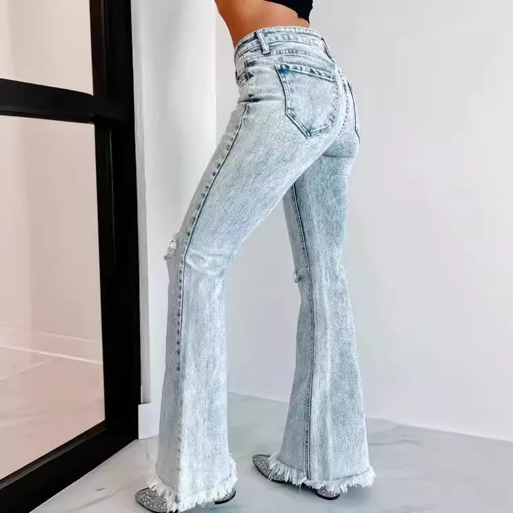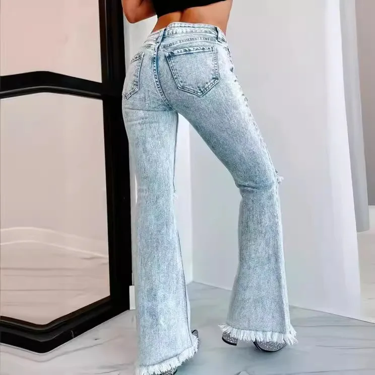 Long Ripped Jeans for Women 2026 New European and American Cross-border Burrs High-waisted Flared Trousers