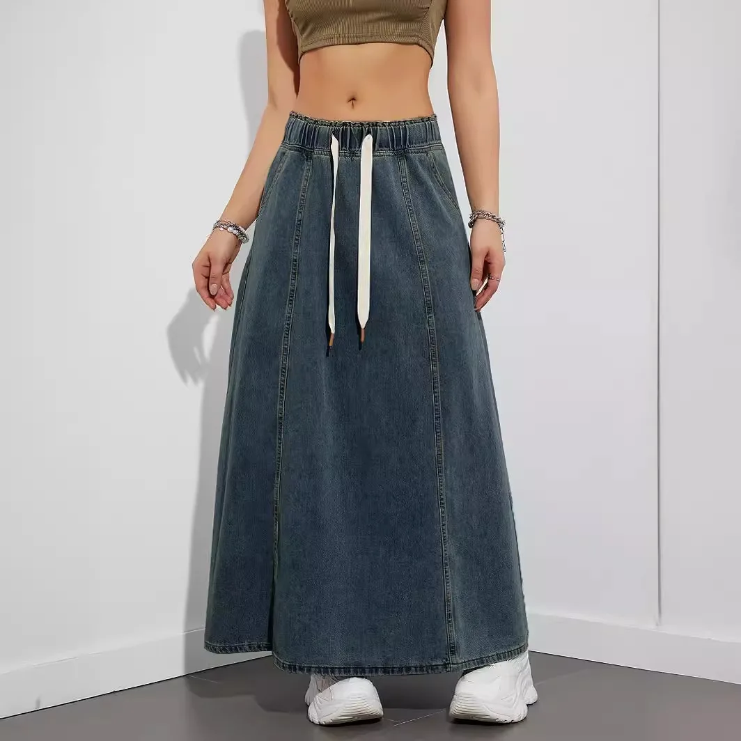 European and American Elastic Waist Loose Big Hem Skirt Denim Skirt Fashionable Retro Pull Rope Design Women's Casual Long Skirt