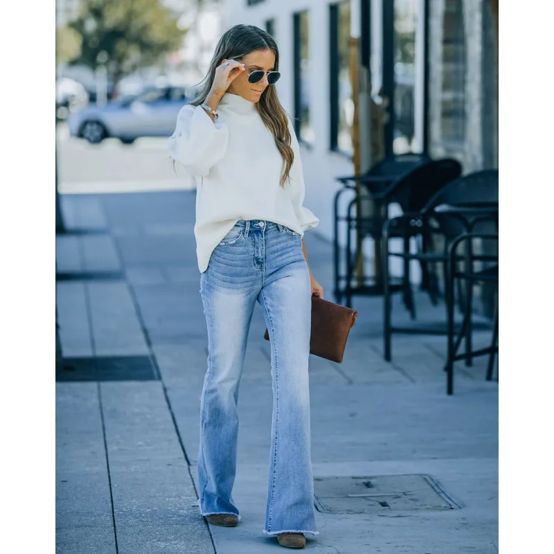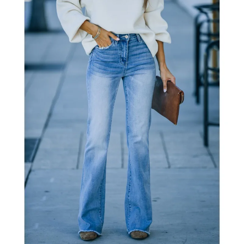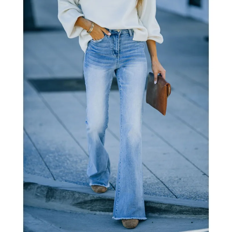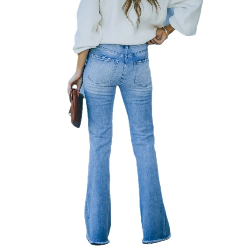 Cross-border New Style Hot-selling Tassel Elastic Mid-waist Micro-tender European and American Wide-leg Jeans for Women
