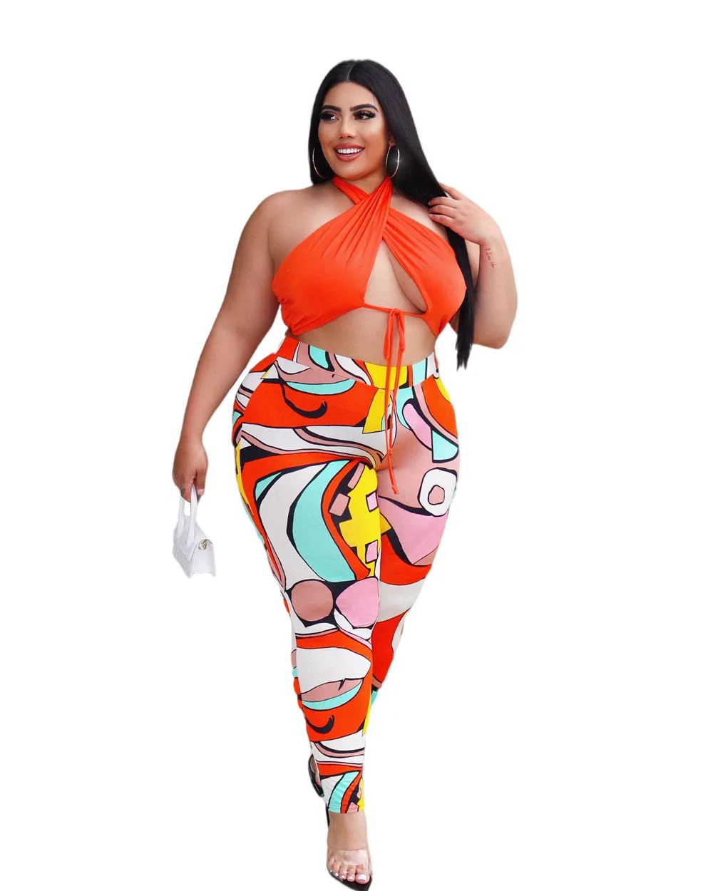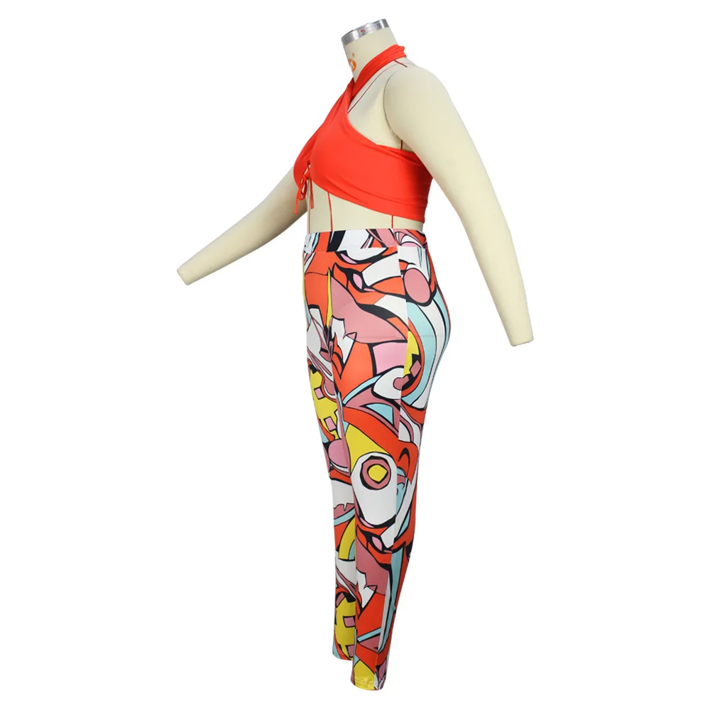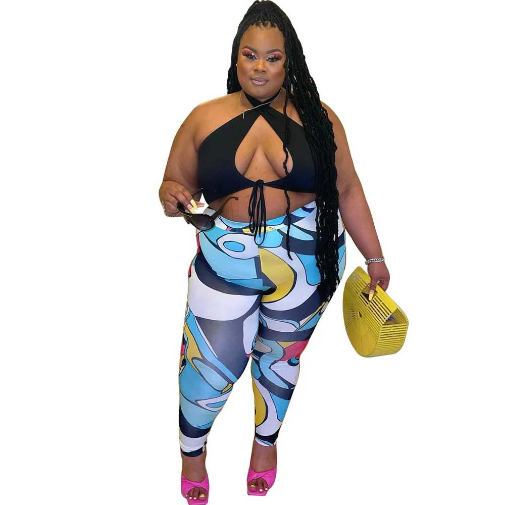 AQ19318 2022 Hot Sale Plus Size Two Piece Set Women Clothing L-4XL Printed Lapel Strap Crop Top Jogger Pants Sexy Clothing