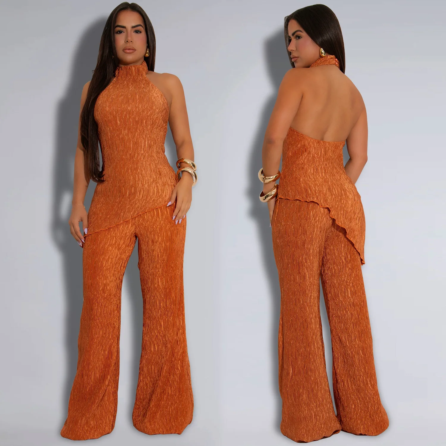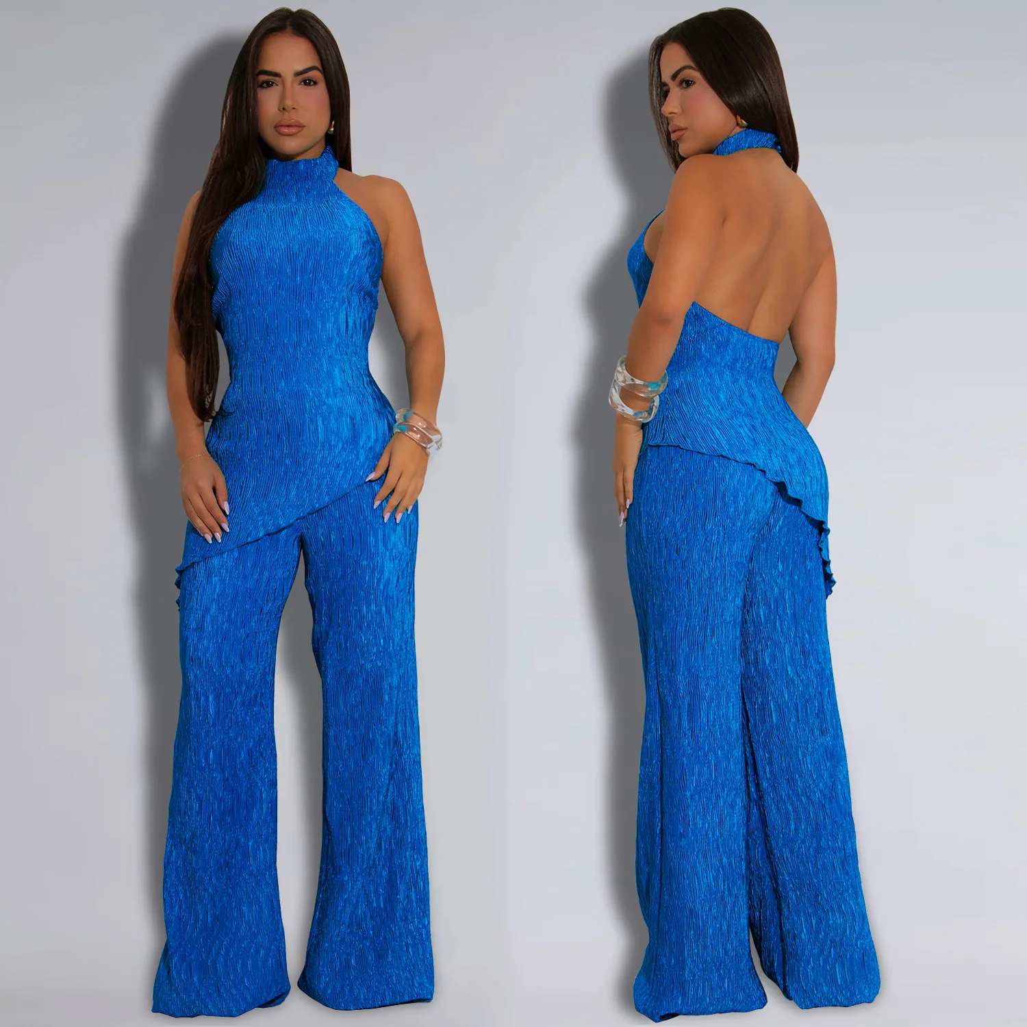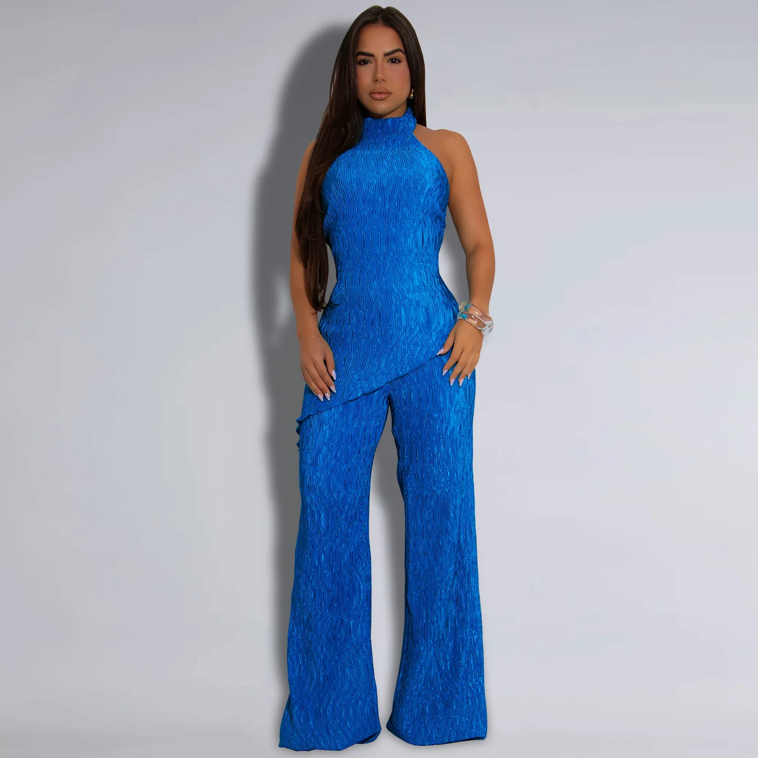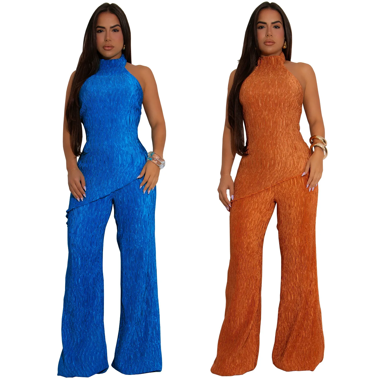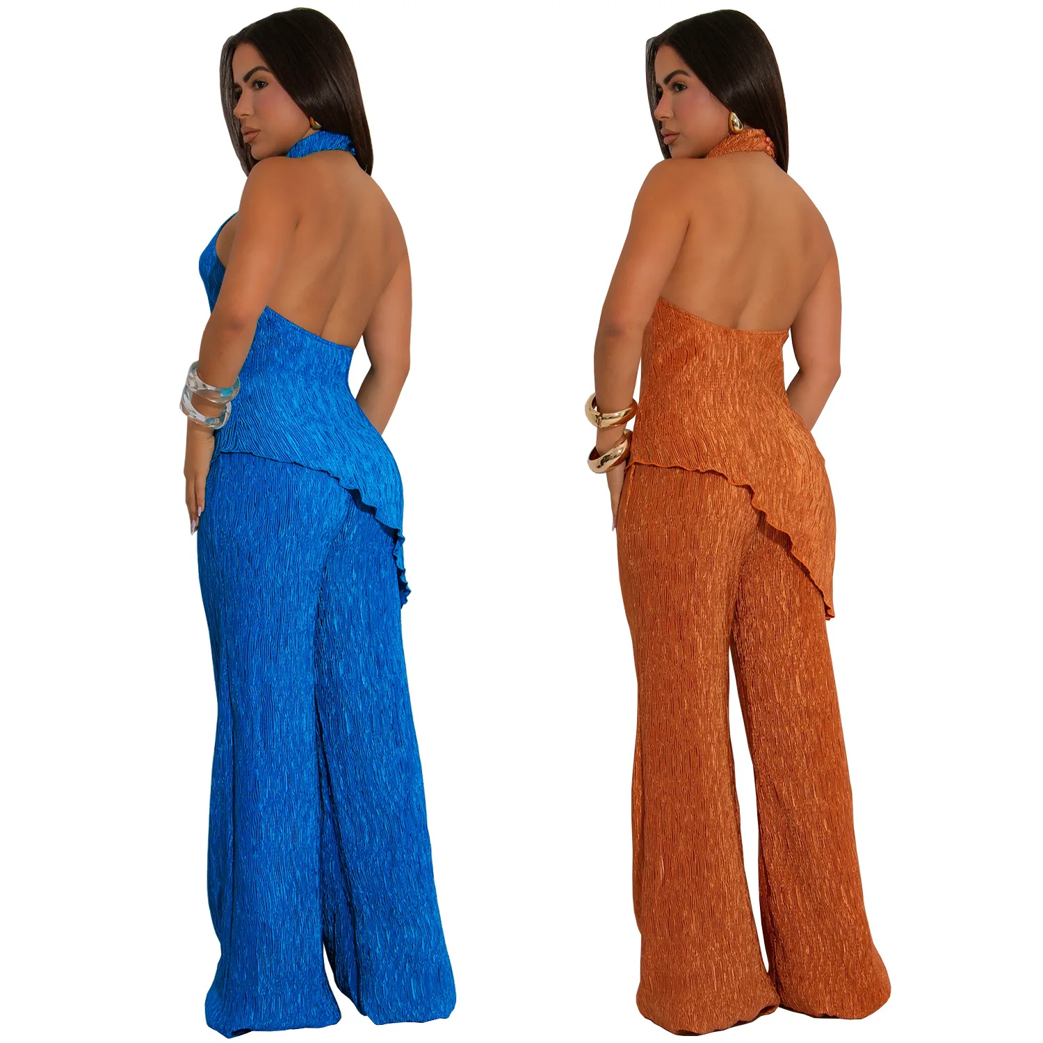 Fashionable Solid Color Halter Sleeveless Sexy Ruched and Wide 2 Piece Pants and Crop Tops for Women Sets