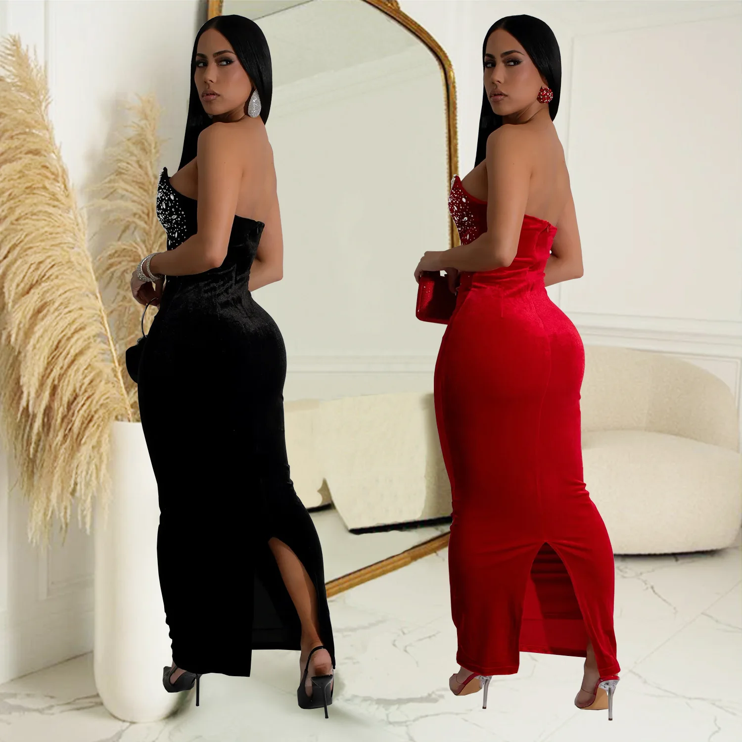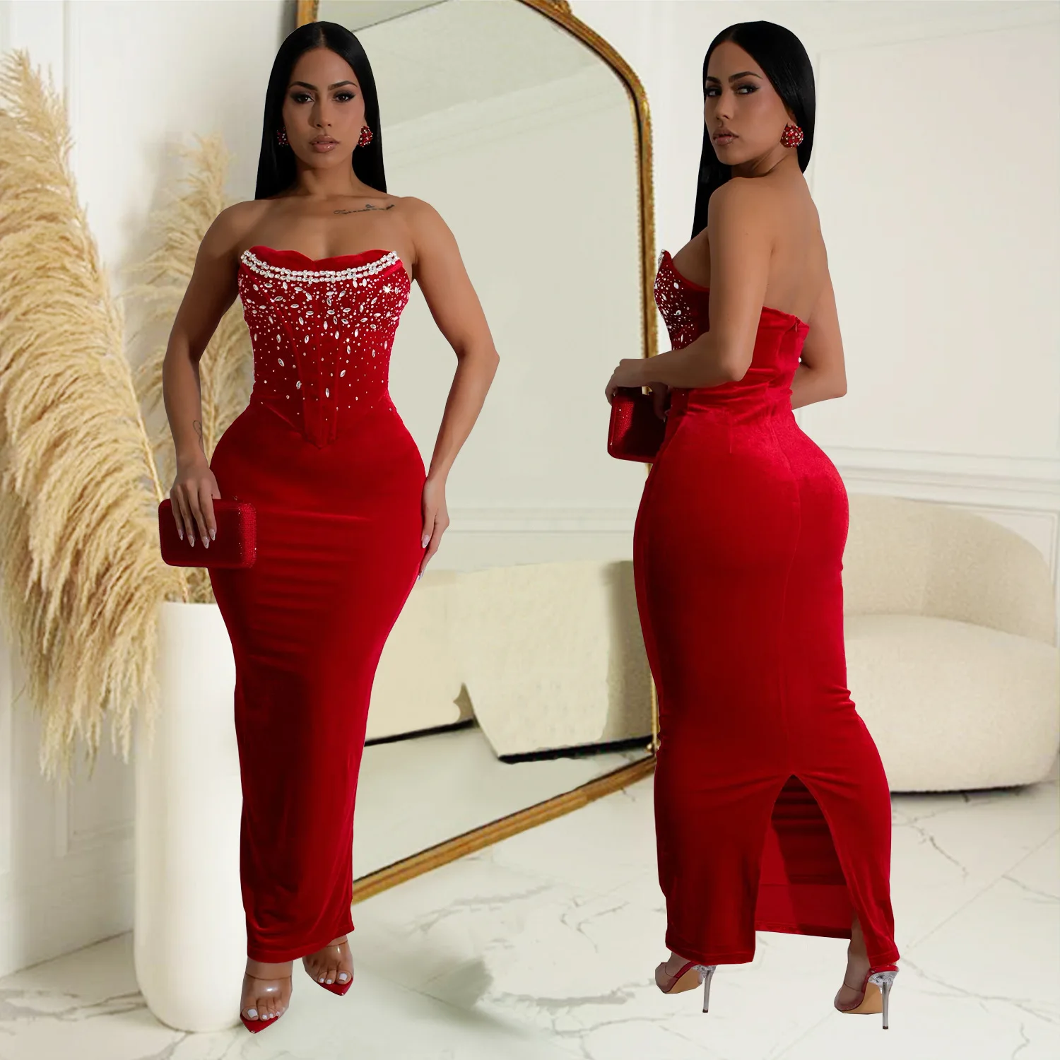 2026 Fashionable Women Solid Color Sexy Rhinestone Long Sleeved Dress Party Birthday Maxi Dress