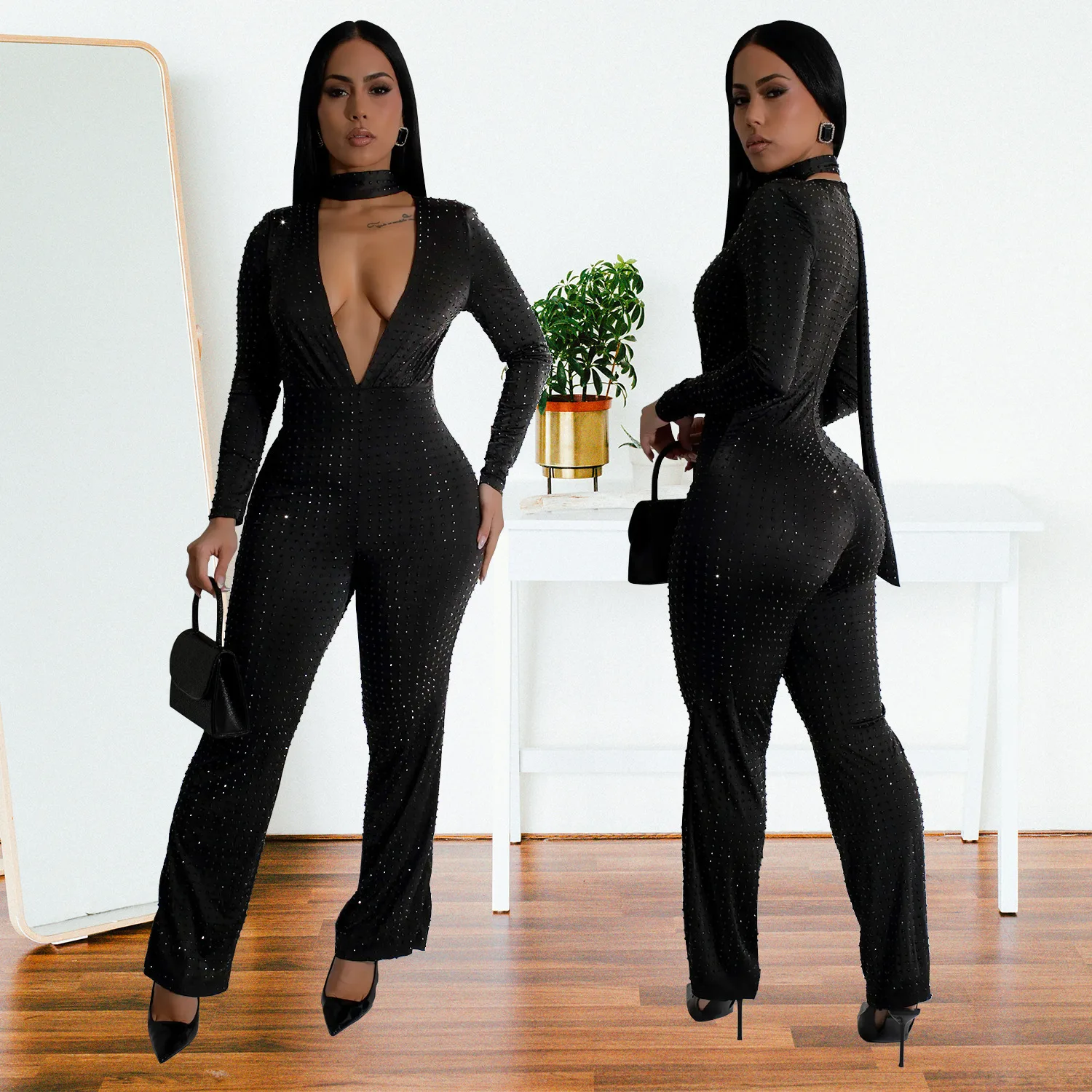 Sexy Sheer Women Bodysuit Deep V Long Sleeve Jumpsuits for Women