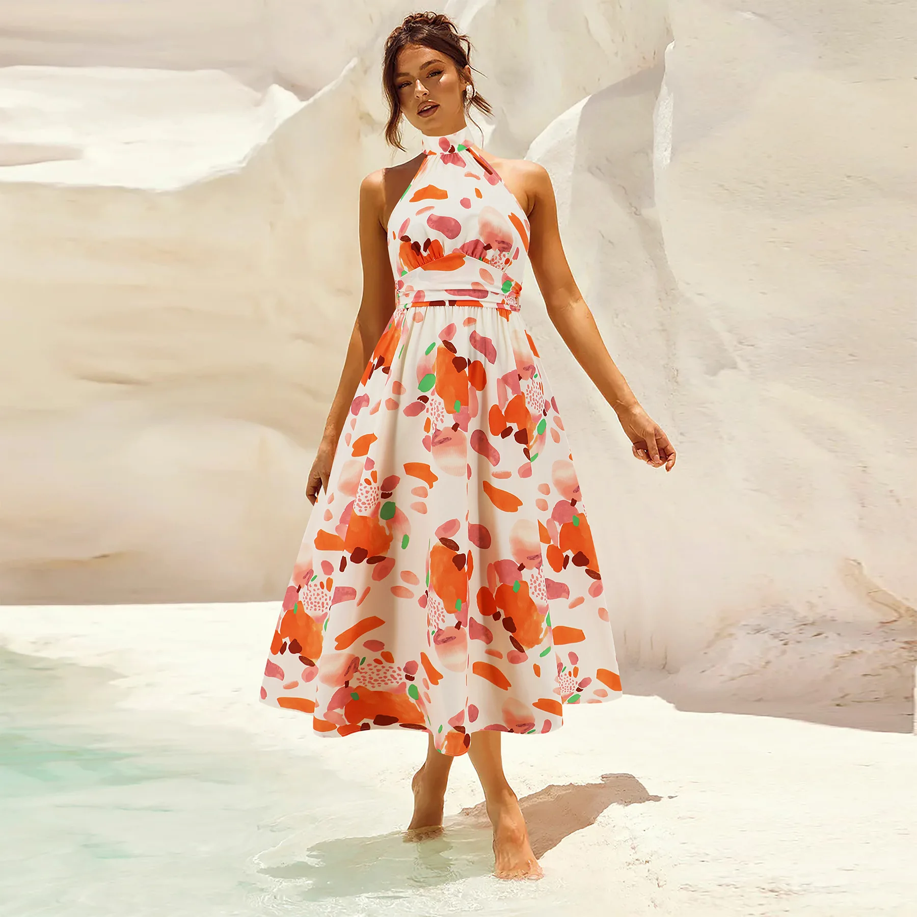 2026 Fashionable Women's Clothing Ladies Long Summer Dress One-Shoulder Floral Chiffon Print Casual Knitted DressFabric