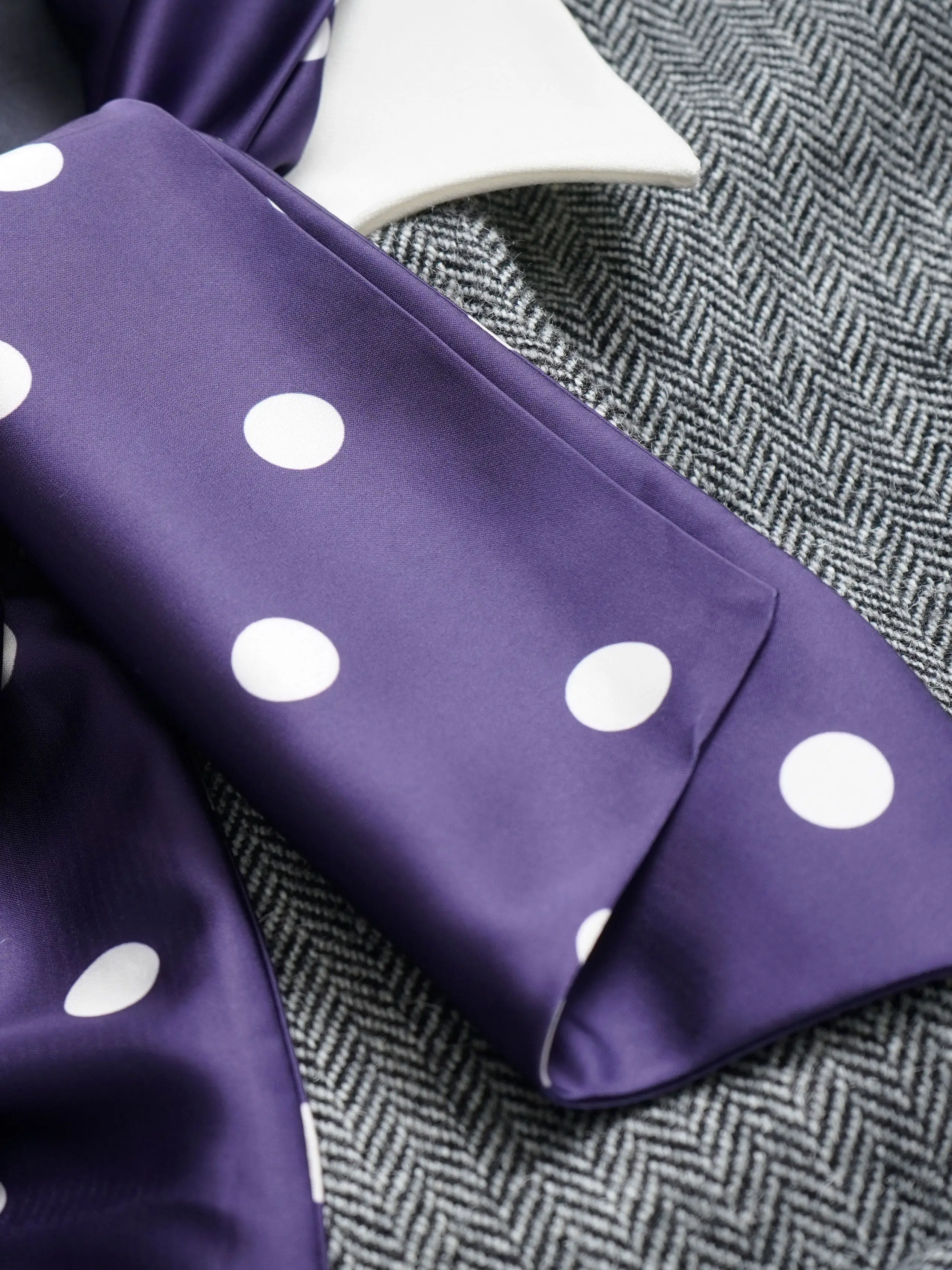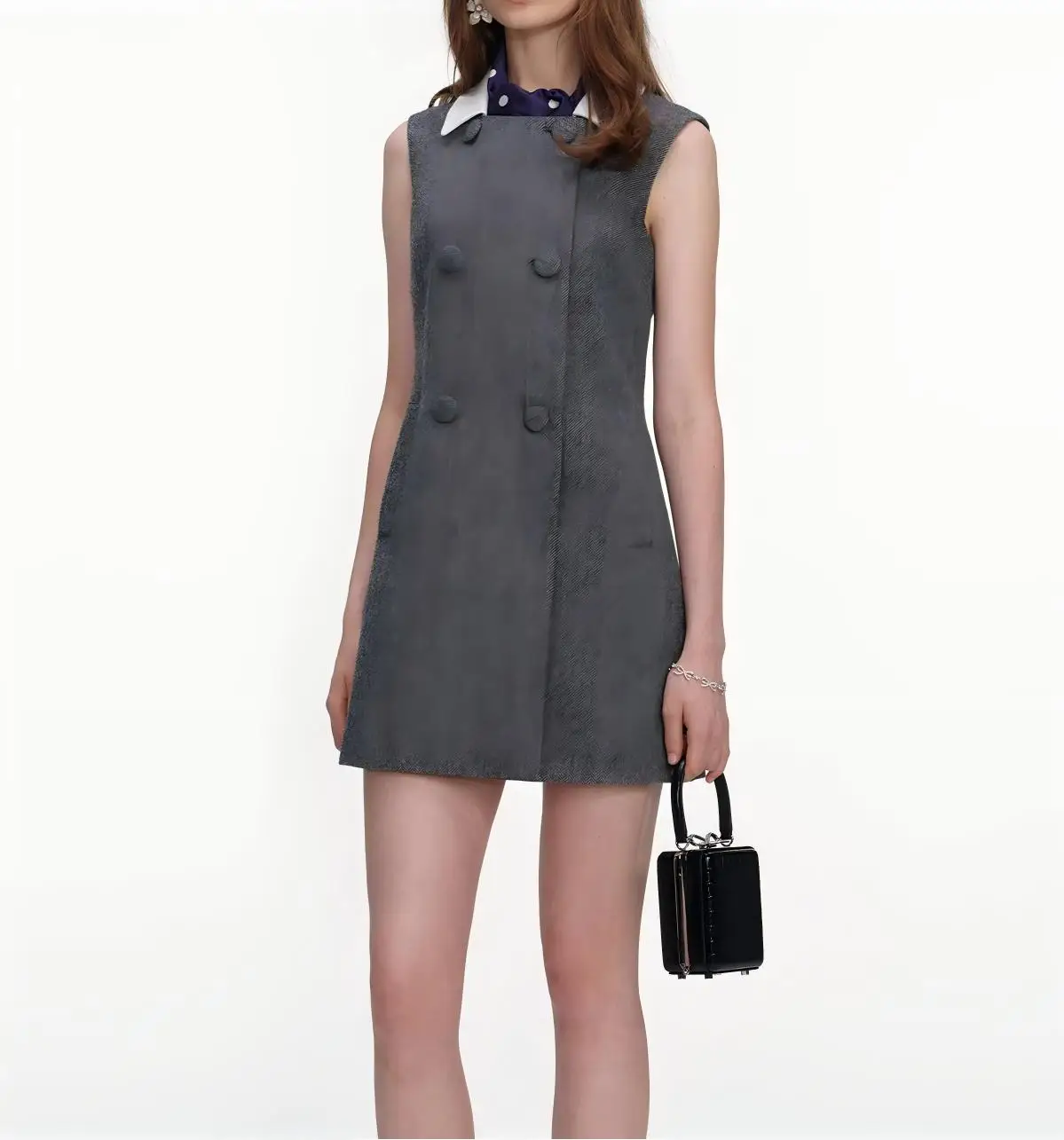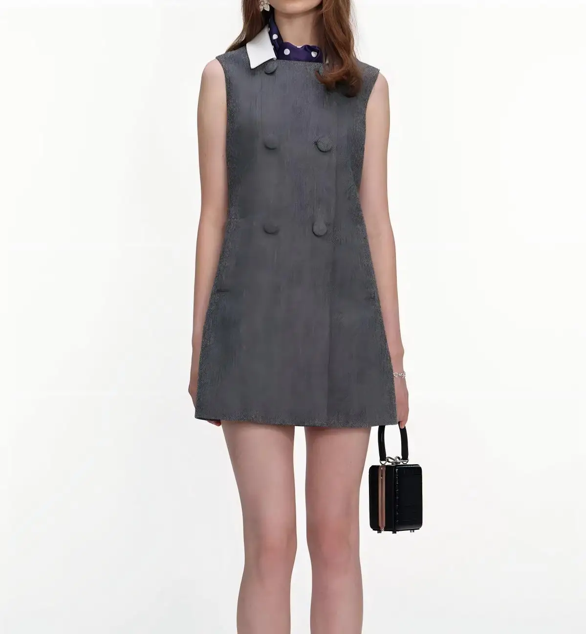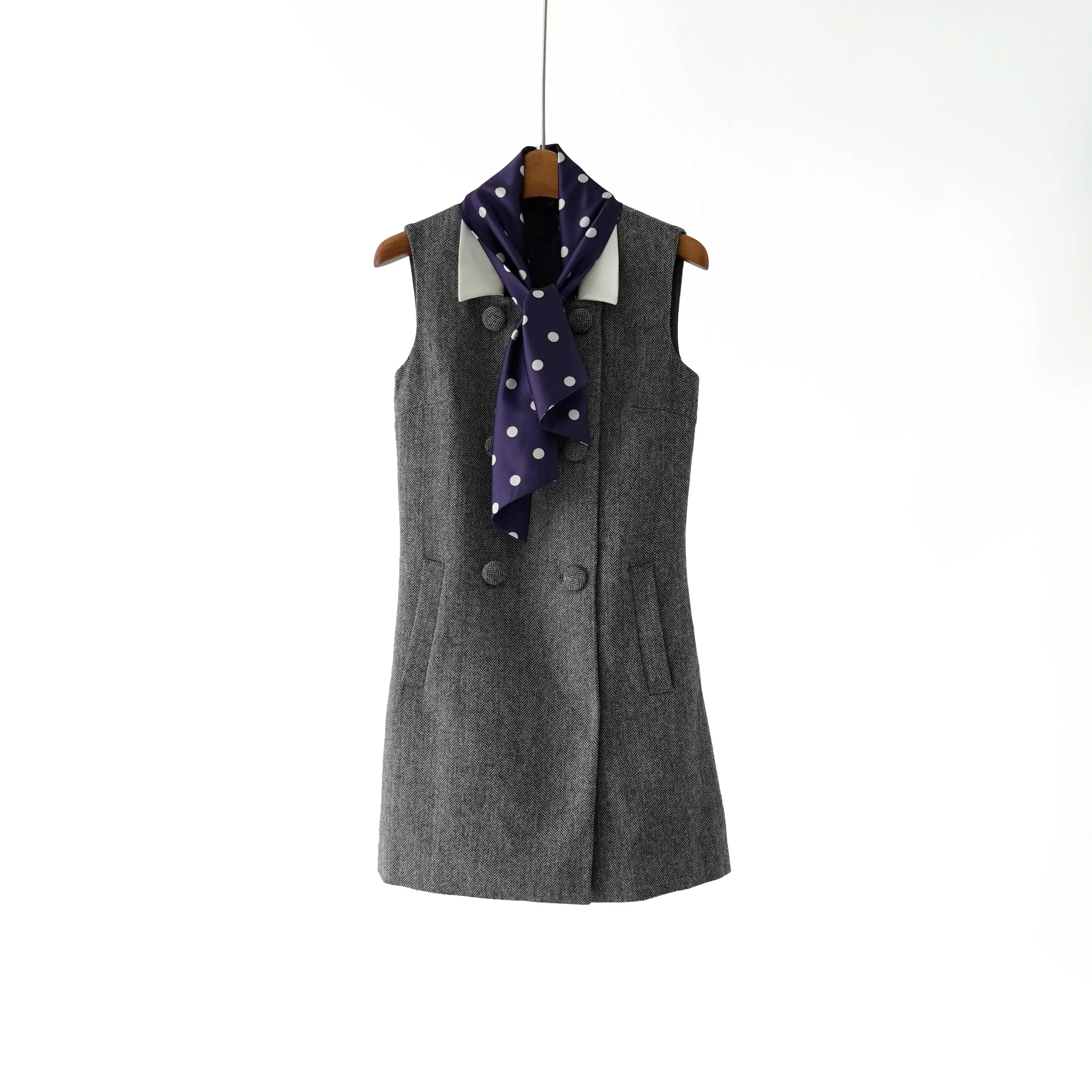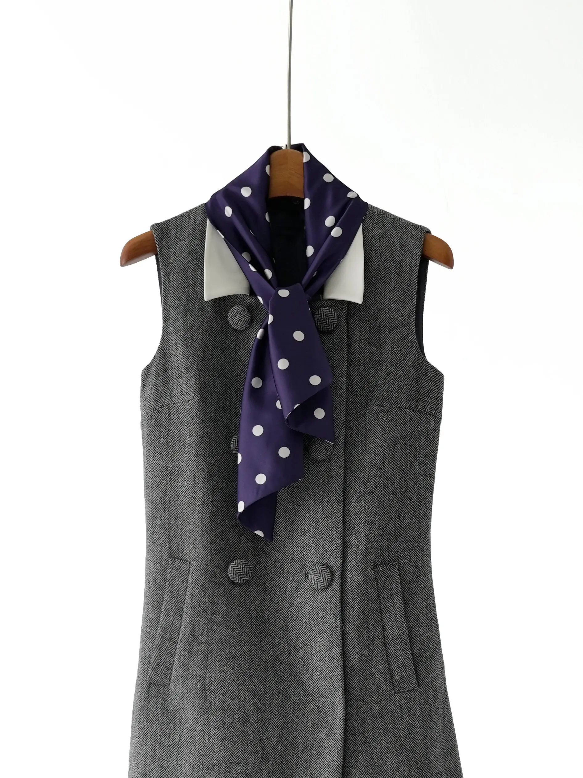 S~P 2026 Early Spring New Grey Mixed Color Detachable Silk Scarf Sheep Wool Herringbone Dress for Women