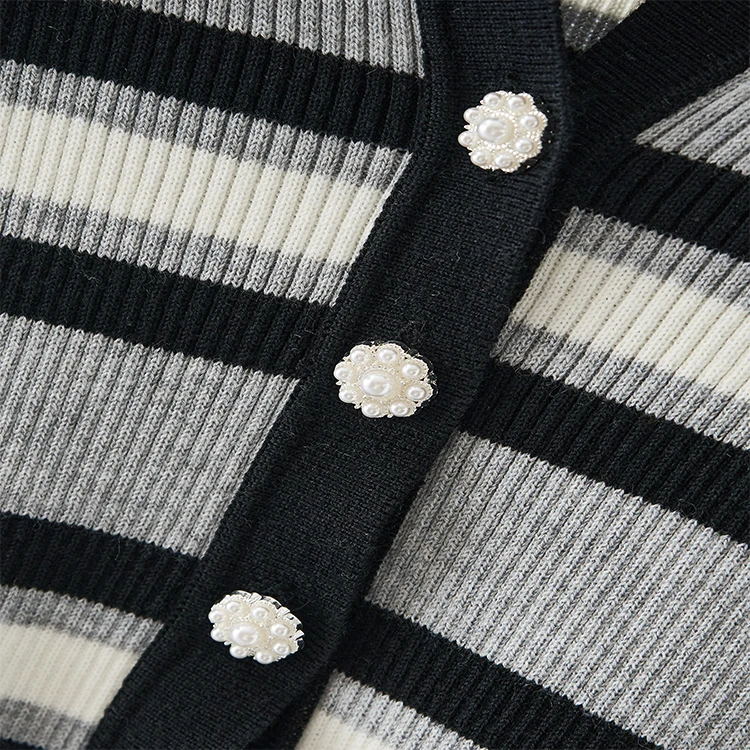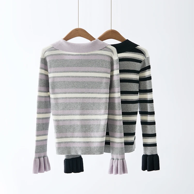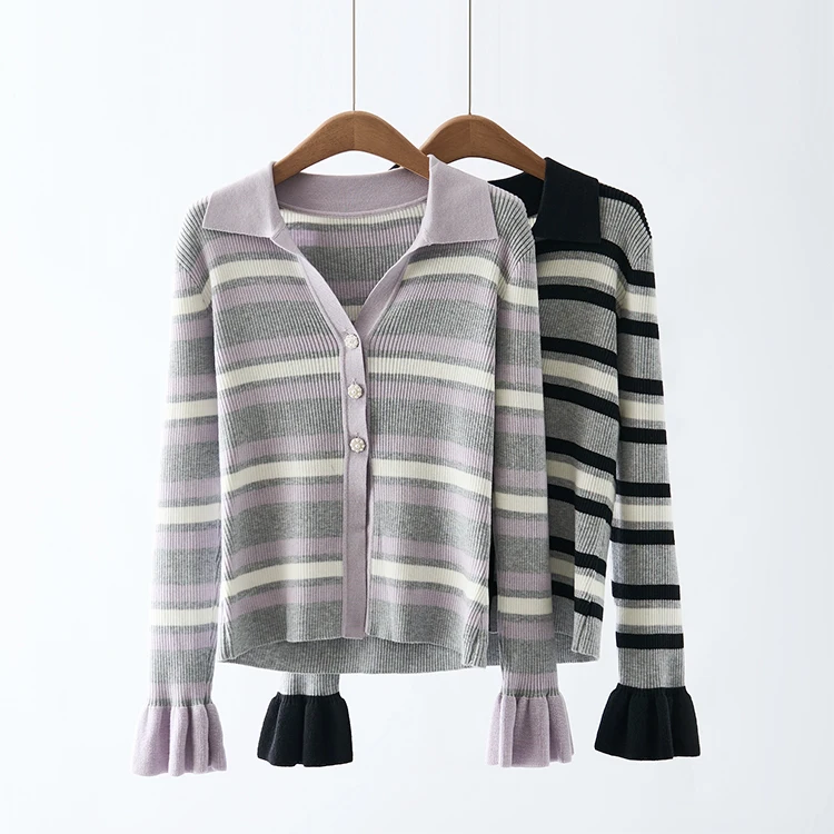 High Quality New Striped Knitted Cardigan Women's Slim-fit Slimming Sweet Style V-neck Trumpet Long-sleeve Base Shirt