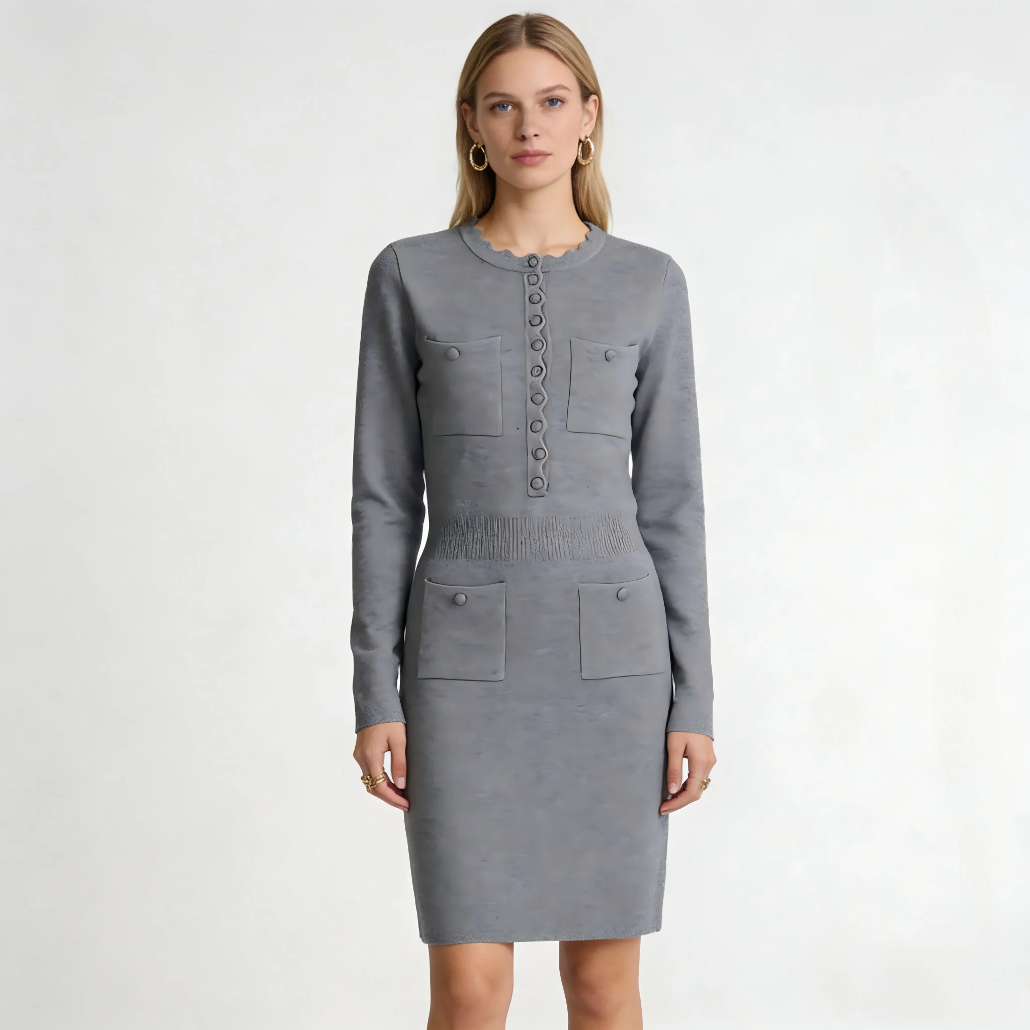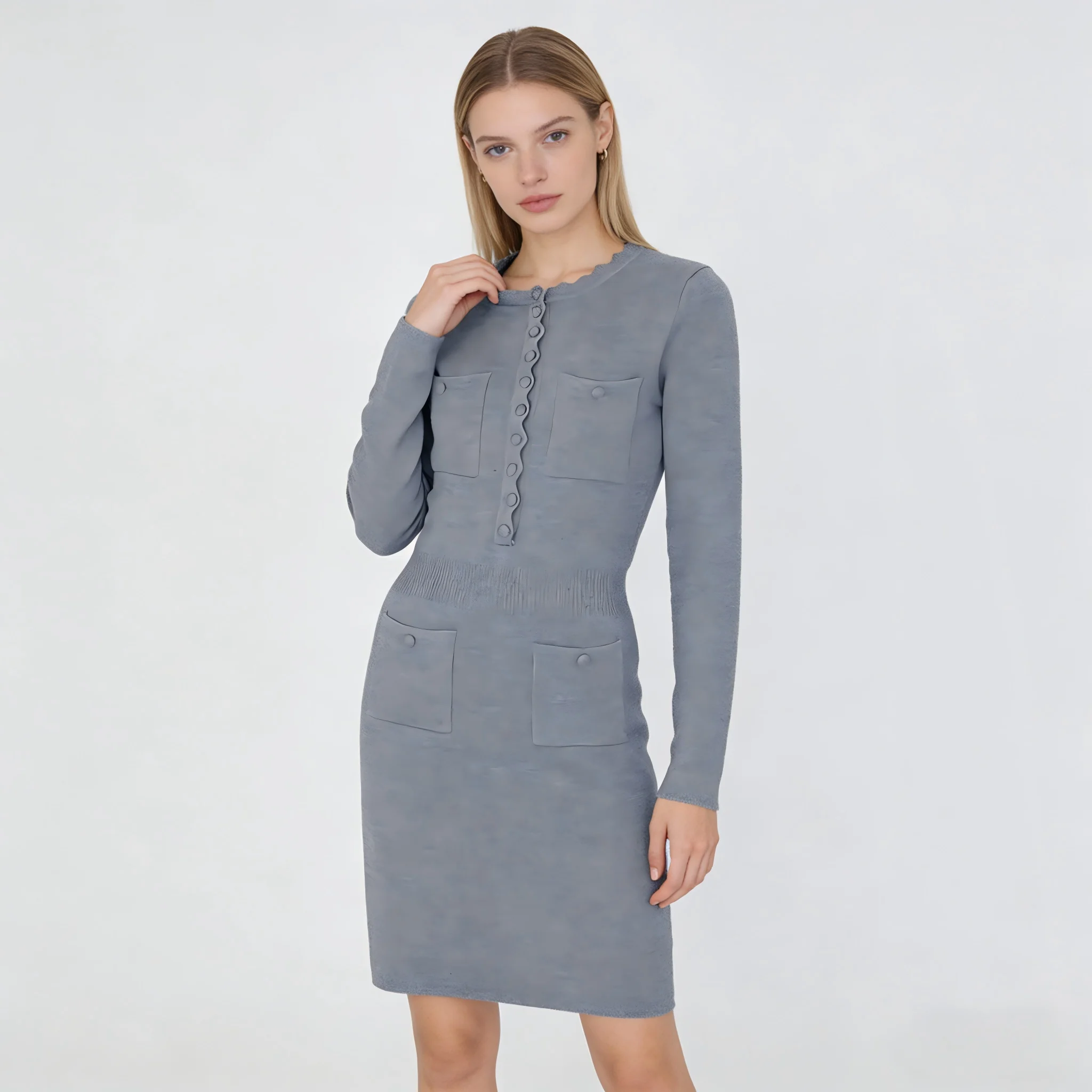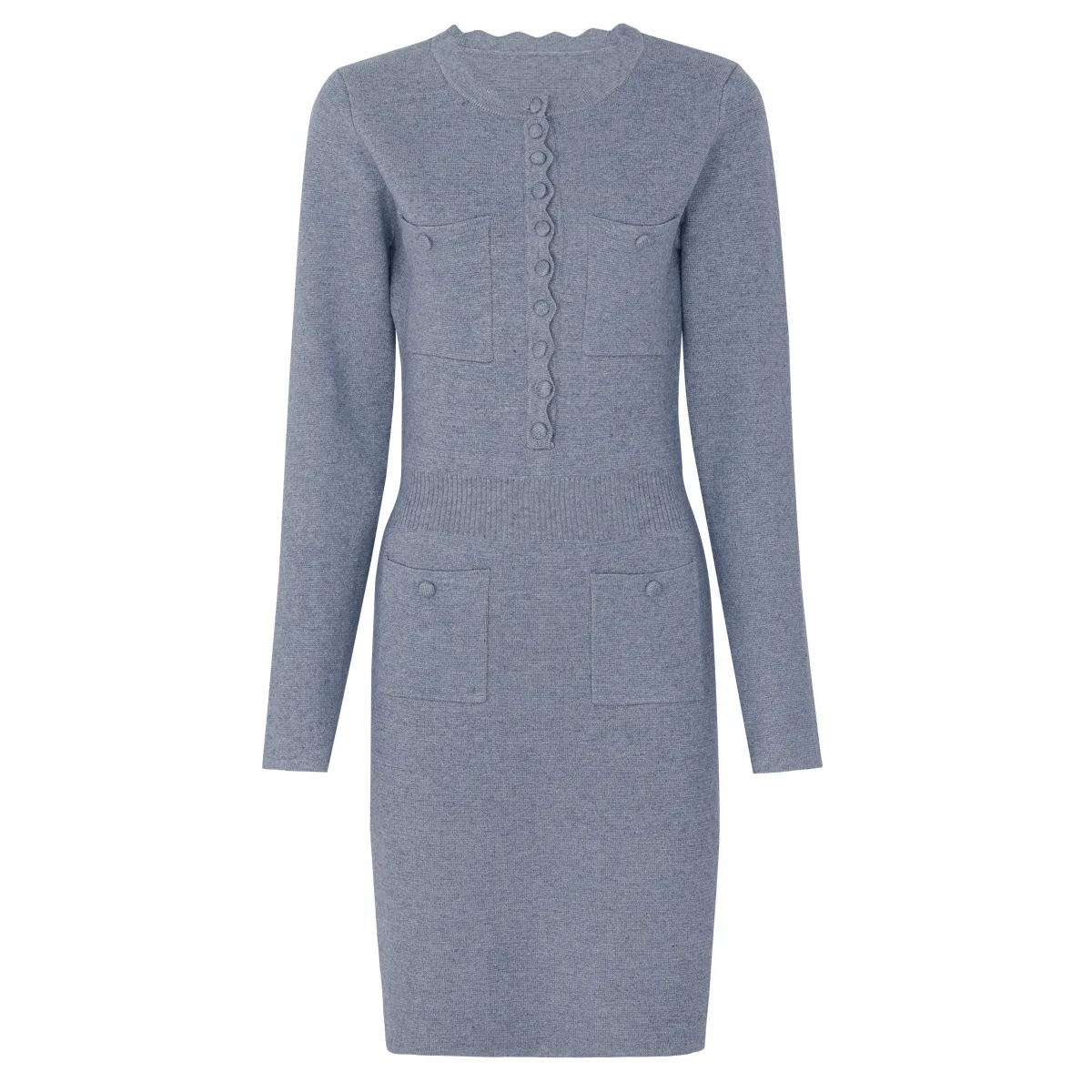 2026 Early Spring New Women's Long Sleeve Crewneck Buckle Knitted All-match Popular Slim-fit Slimming Dress